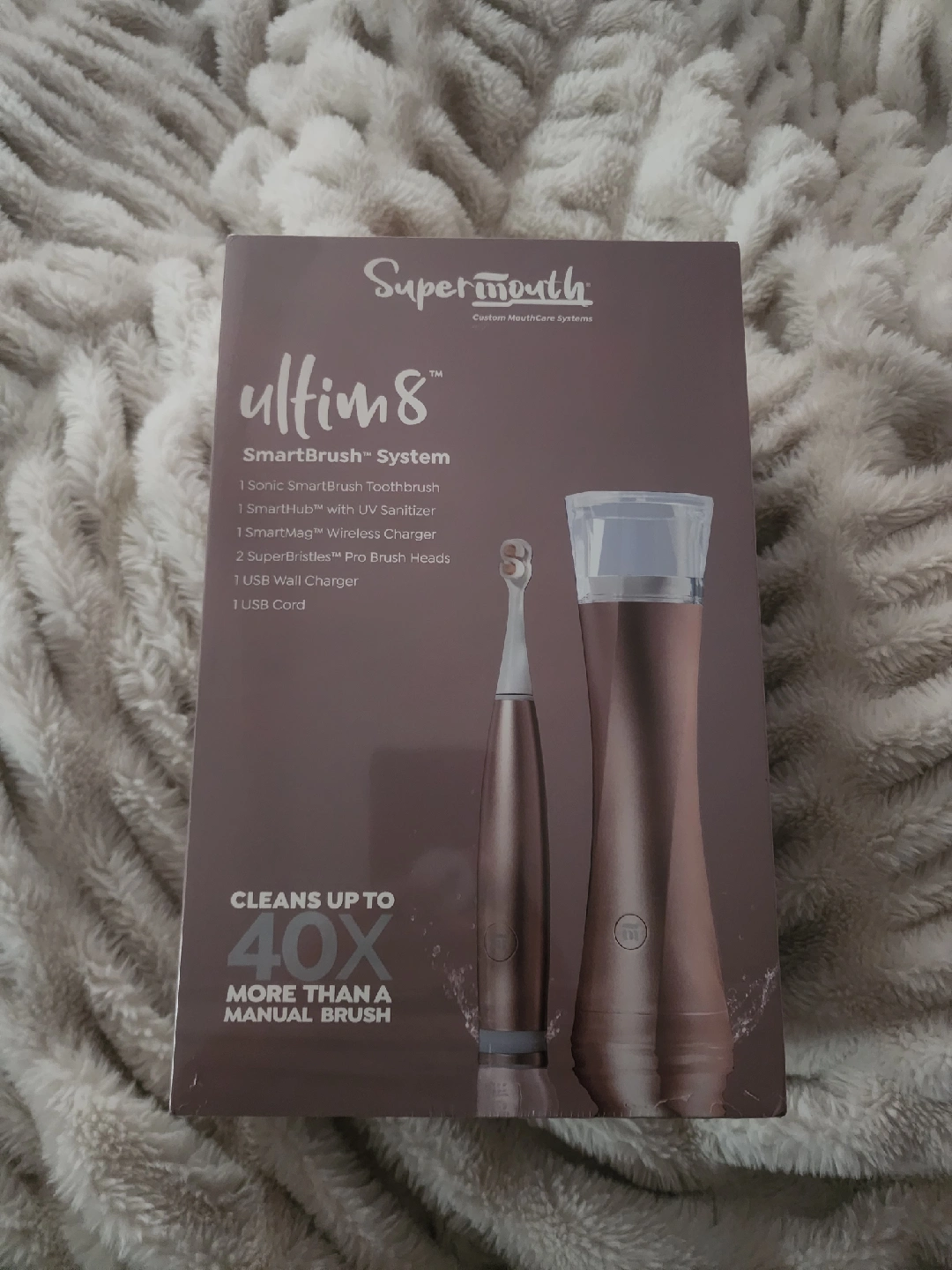 Selling a SuperMouth Ultim8 SmartBrush System! This system includes: - 1 Sonic SmartBrush Toothbrush - 1 SmartHub with UV Sanitizer - 1 SmartMag Wireless Charger - 2 SuperBrush Pro Brush Heads - 1 USB Wall Charger - 1 USB Cord Cleans up to 40X more than a manual brush! Box is included