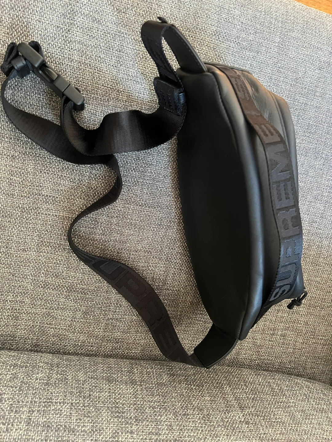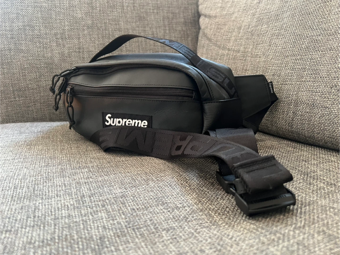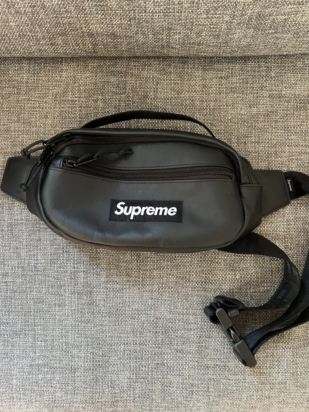 Selling a stylish Supreme black leather waist bag! It's in great condition and perfect for carrying your essentials. The bag features a sleek design with the Supreme logo prominently displayed. It's a versatile accessory that can be worn in a variety of ways. Don't miss out!