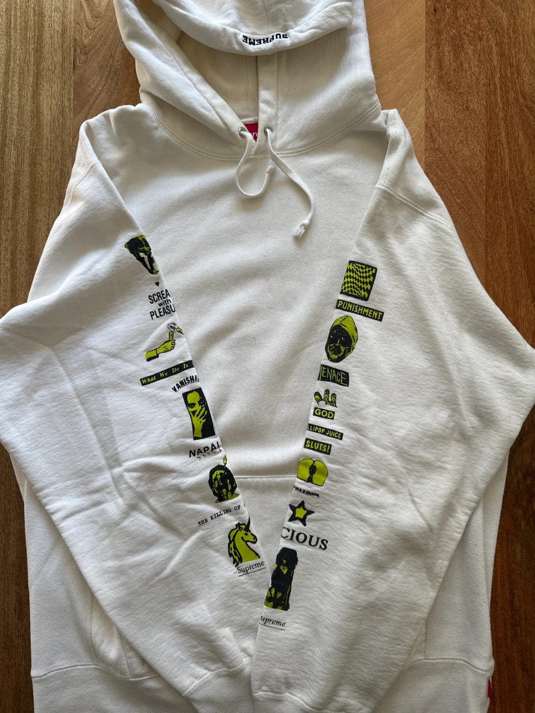 Selling a Supreme hoodie with unique graphic prints on the sleeves. It's in good condition and ready for a new home! The hoodie features various images and text, including 'SCREA with PLEASU,' 'PUNISHMENT,' and the Supreme logo