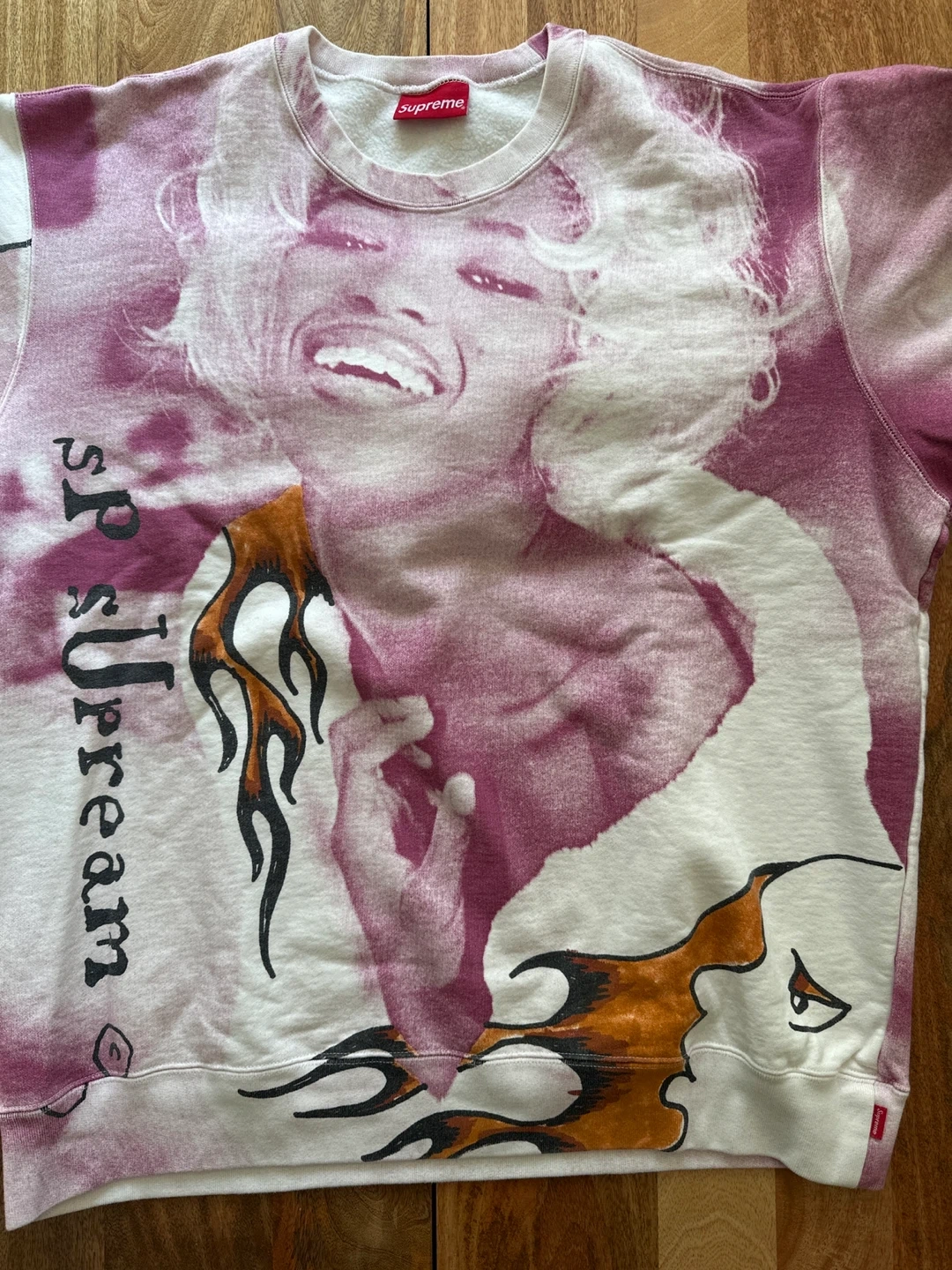 Selling a Supreme sweatshirt featuring Naomi Campbell. It has a unique design with flame accents. The sweatshirt is in good condition and ready for a new home!