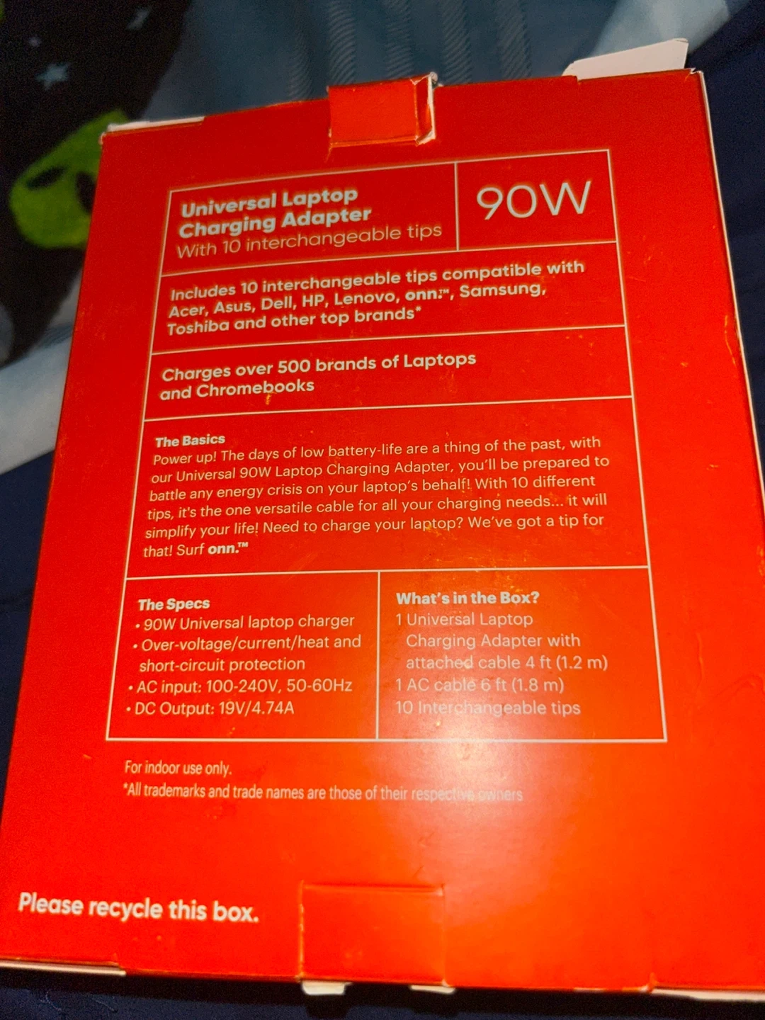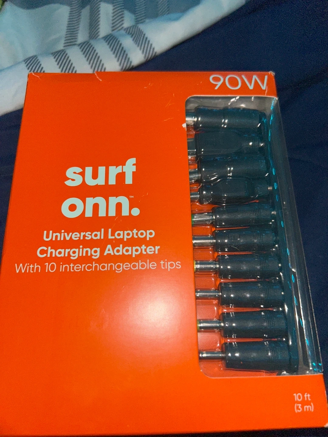 Selling a brand new Surf Onn. universal laptop charging adapter with 10 interchangeable tips. It's a 90W charger compatible with Acer, Asus, Dell, HP, Lenovo, Onn, Samsung, Toshiba, and other top brands of laptops and Chromebooks. The box includes the universal laptop charging adapter with an attached 4 ft (1.2 m) cable and 10 interchangeable tips. It has over-voltage/current/heat and short-circuit protection. The AC input is 100-240V, 50-60Hz, and the DC output is 19V/4.74A