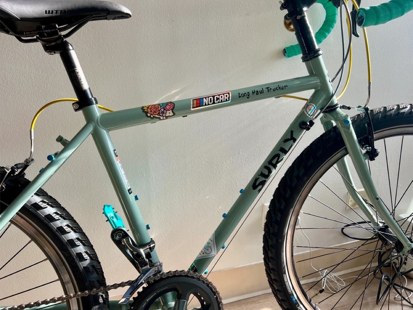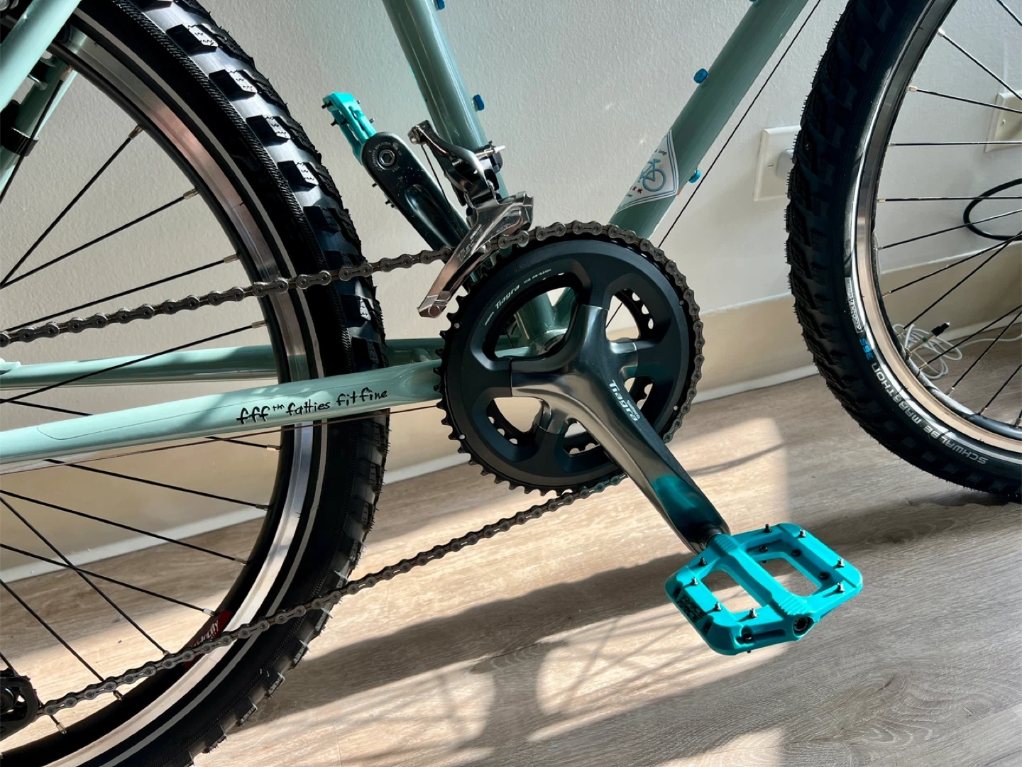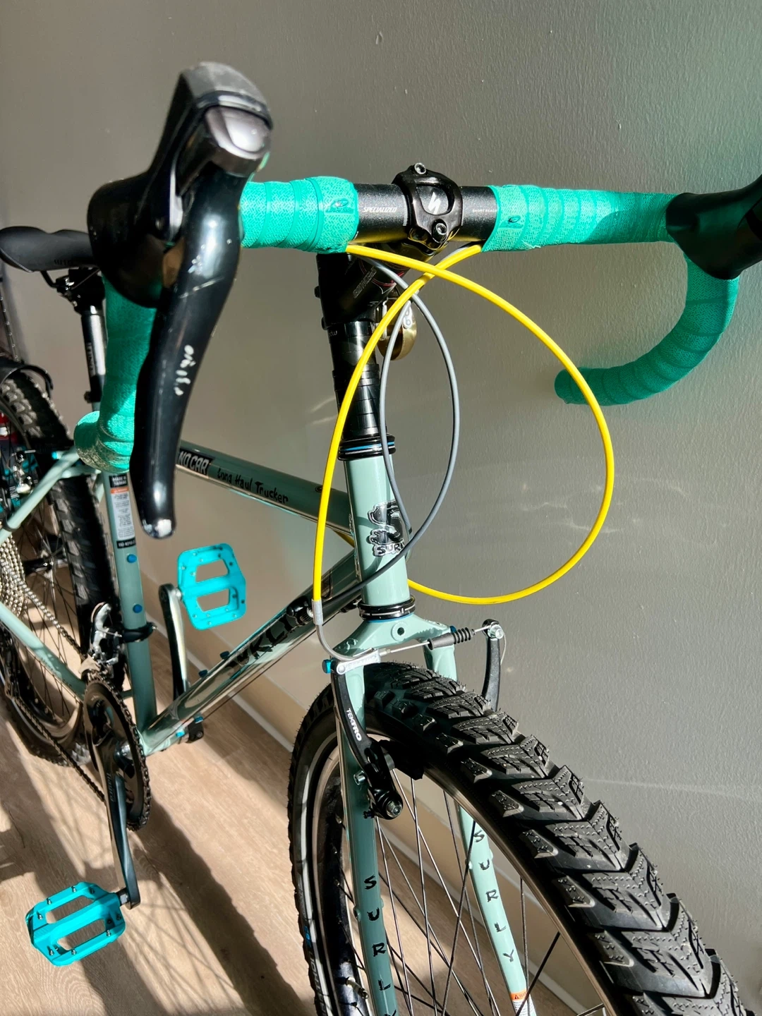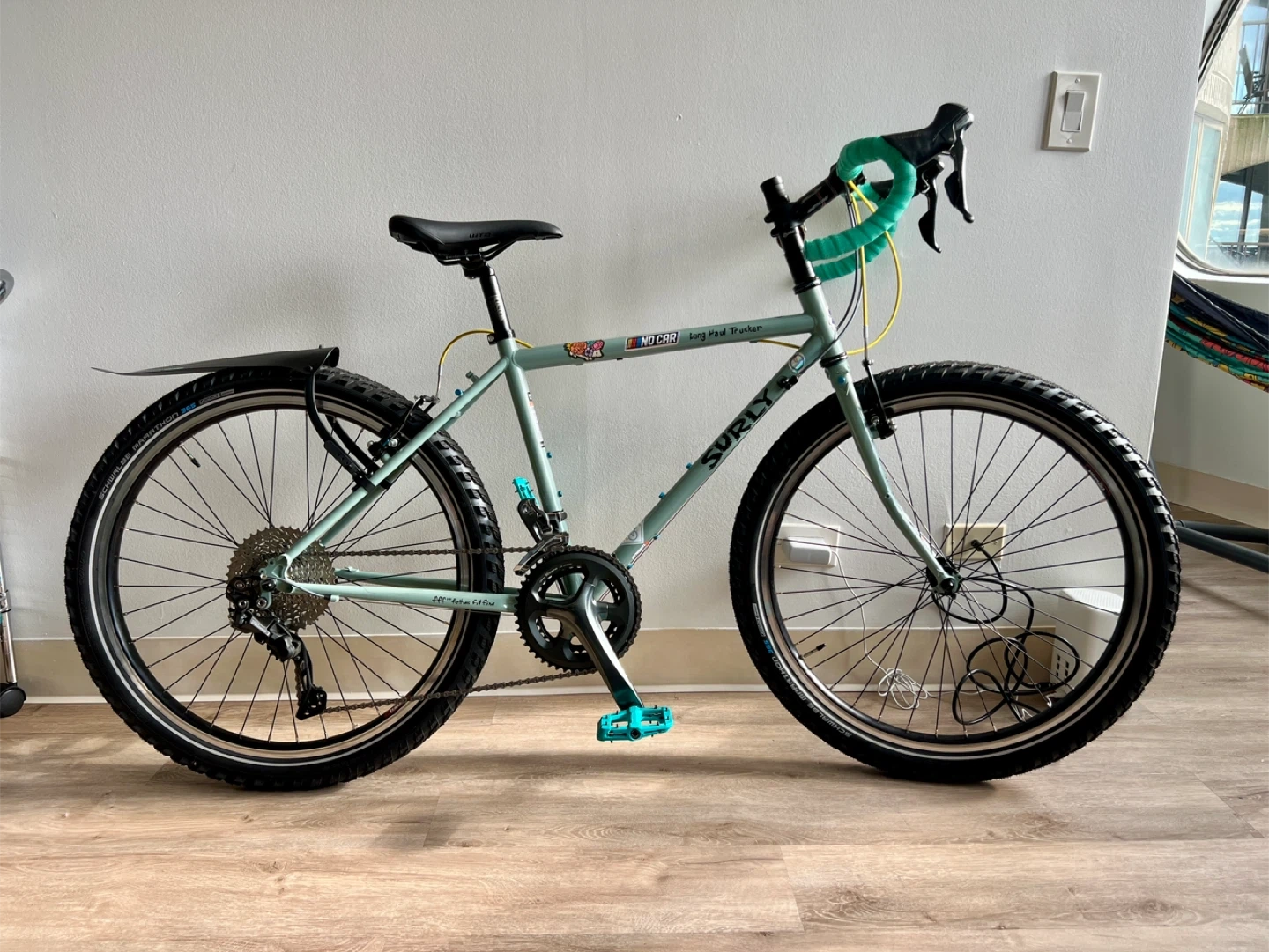 33Best suited for riders between 5’0”-5’5” Built from the frame up, 2x10 drivetrain. Ridden less than 100 miles. Built out to be a winter commuter/bikepacking hybrid, but the build didn’t end up fitting me right and I don’t have the time to keep working on it. Near perfect condition with a couple notes - there are some very very minor dings and scuffs from the build, and while building I noticed the brake bosses on the frame were funky - so I had to use a different style of brakes to get them to mount the bosses. Steer tube hasn’t been cut yet. The bike rides and is fully functional, but I would recommend some work to make it reach its full potential: - gears need to be re-indexed: currently won’t shift to the 2 big rings on rear (I’m thinking a larger chain is needed) - Front derailleur currently won’t shift properly Parts breakdown - Schwalbe Marathon 365 4-Season 26”x2.15” tires - Velocity Cliffhanger rims (hand-built by Velocity) - Deore CS-M4100 10-speed cassette (11T-42T) - Tiagra FC-4700 double chainweel (48T-34T) - Tiagra 10-speed chain - Deore RD-M5120 rear derailleur - Wolf Tooth Components Tanpan - Shimano Tiagra FD-4700 front derailleur - Race Face Chester pedals - Kalloy Uno Seatpost - WTB Volt Saddle - Shimano Tiagra BB-RS500 bottom bracket - Shimano Tiagra ST-4700 brifters - Specialized Short Reach drop bars - Cane Creek 40 headset - Specialized stem - Tektro brakes Accessories: - Portland Design Works Alexander Graham Bell - Ass Savers Win Wing rear fender - Portland Design Works Zit Bits Local pickup only in South Loop.