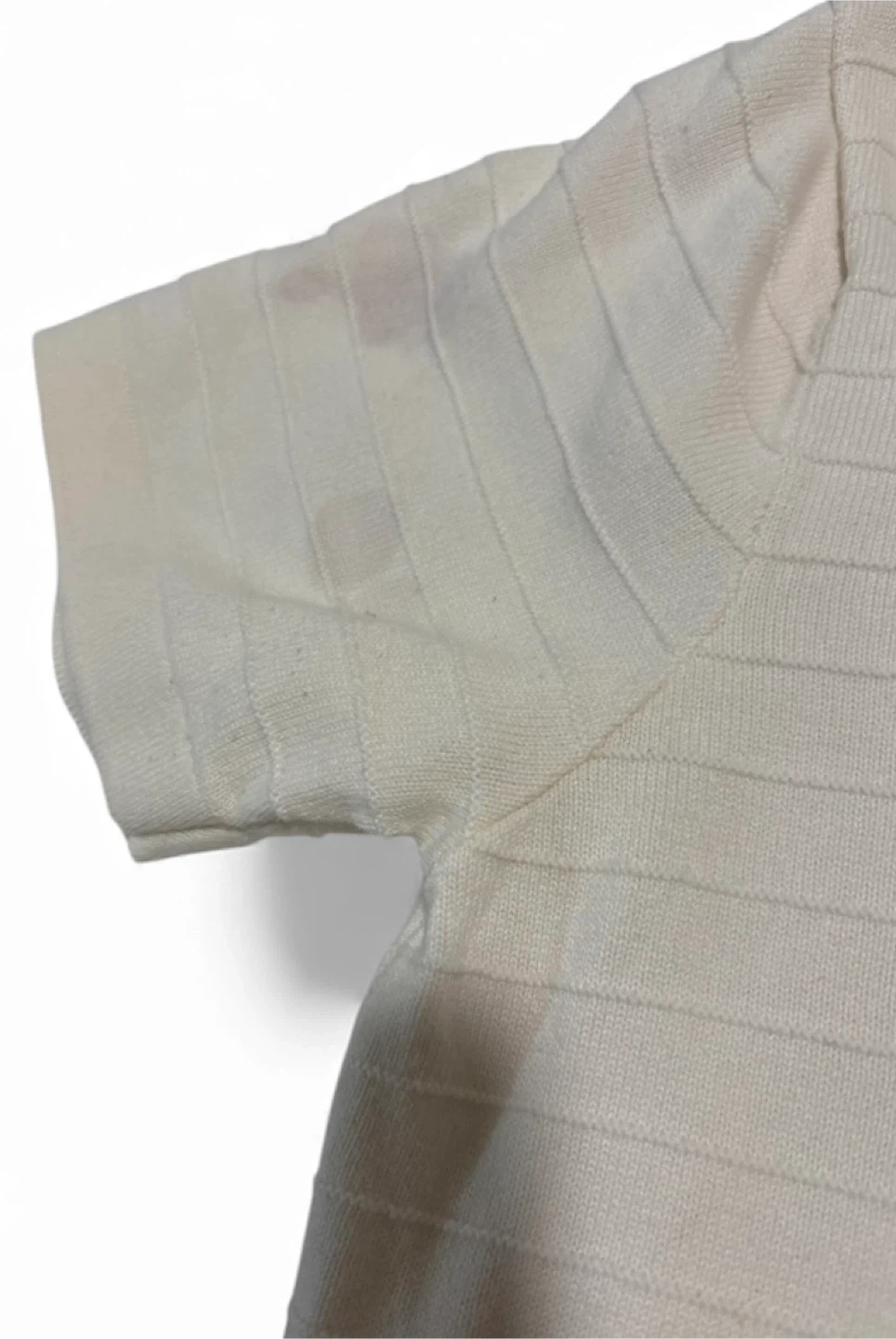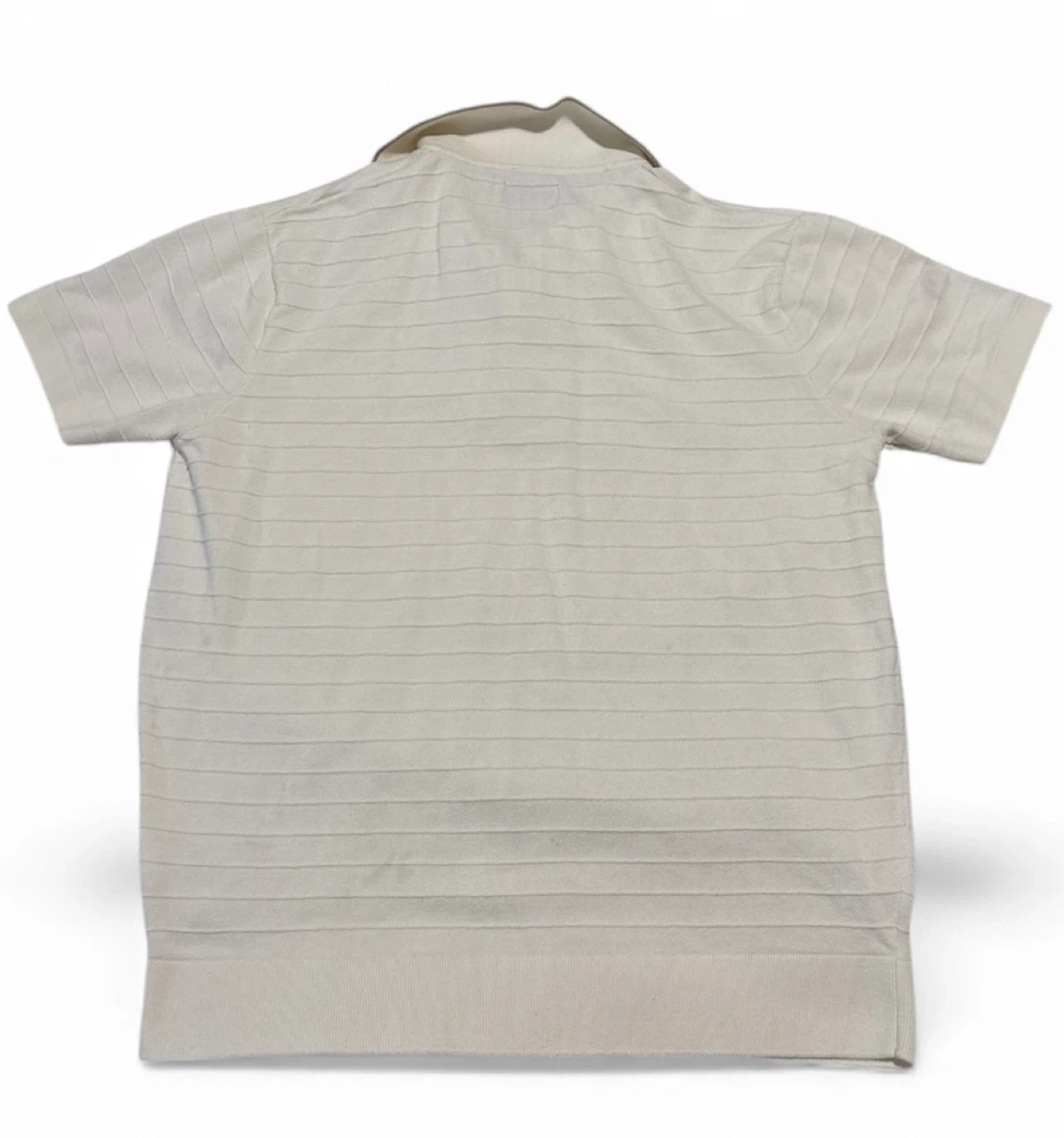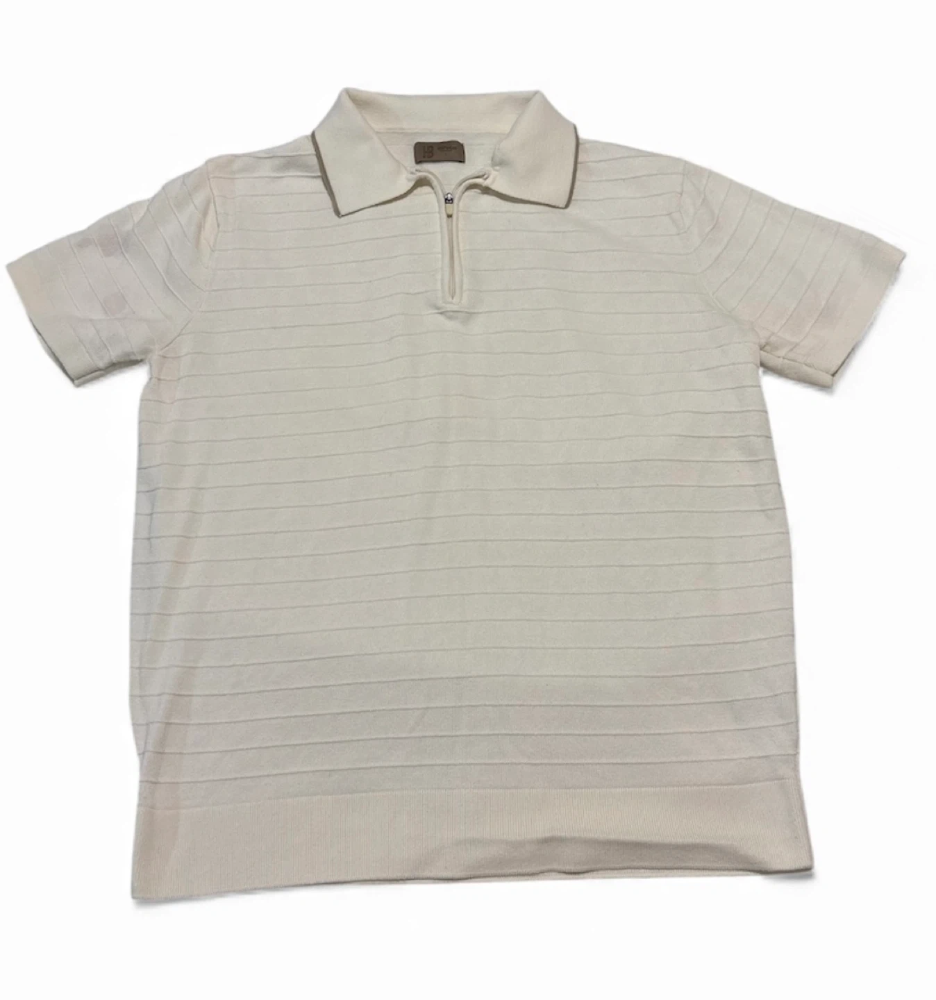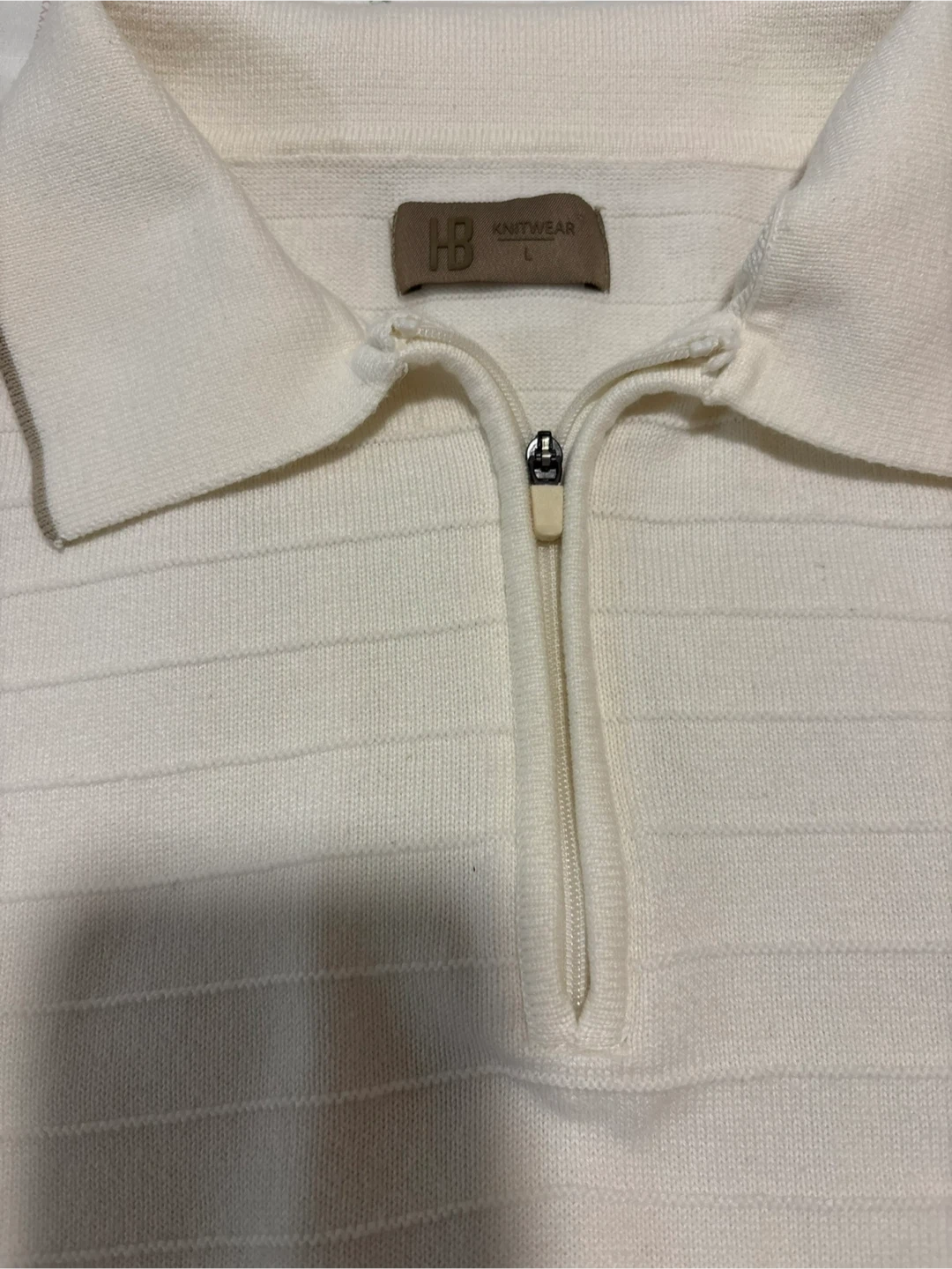 Selling a cream-colored polo shirt from HB Knitwear in size L. It has a unique horizontal striped pattern and a quarter-zip closure. There is a faint stain on the sleeve.