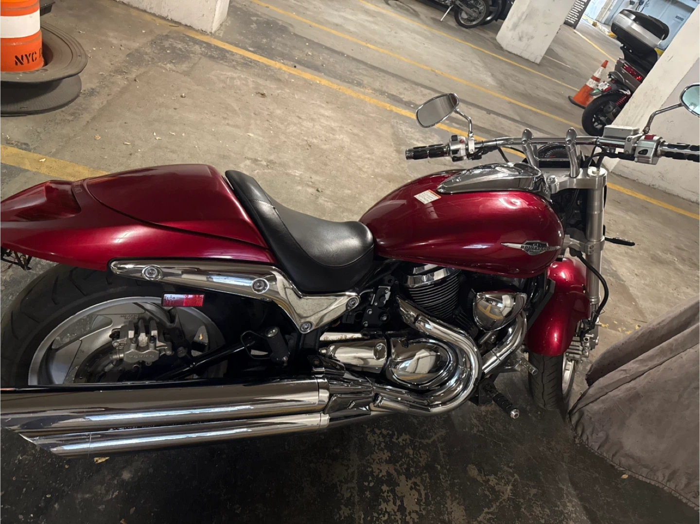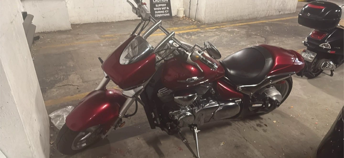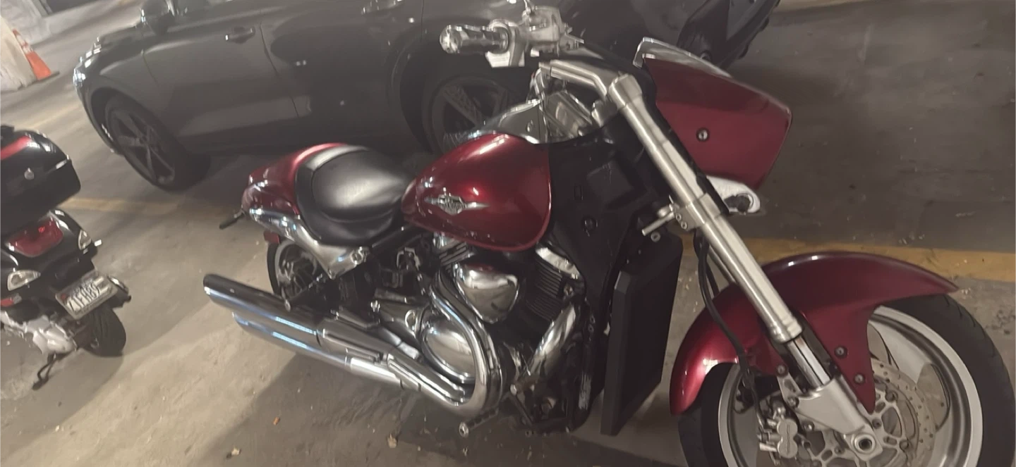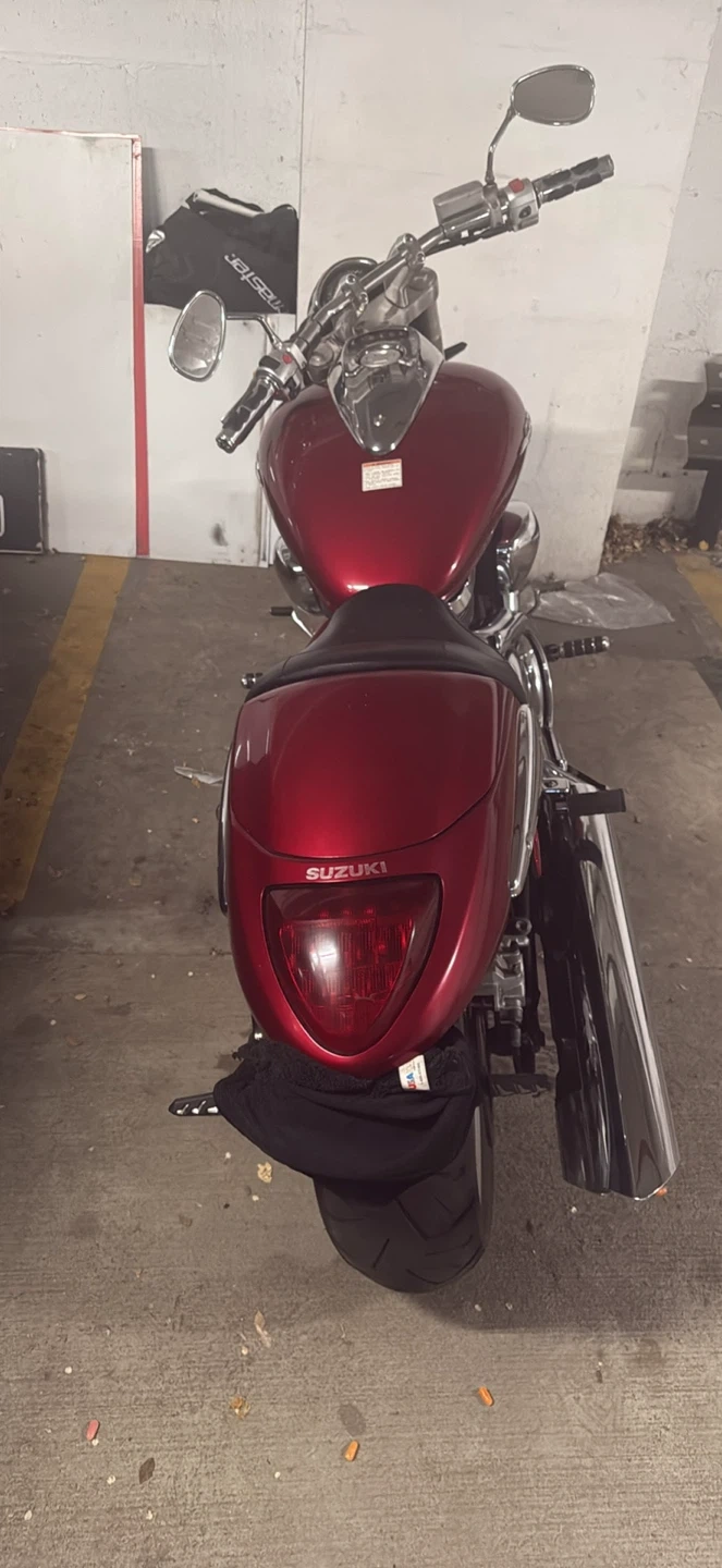 Selling a used Suzuki Boulevard M109R motorcycle. It has a striking red finish and a comfortable black seat with a powerful 1200cc engine