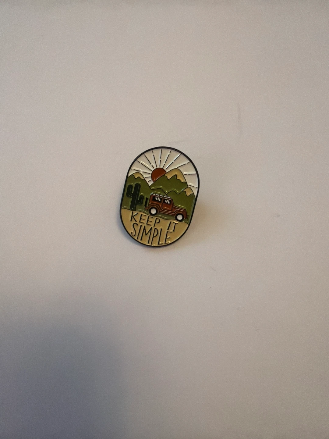 This enamel pin features a desert landscape with a vintage Jeep and the phrase 'Keep It Simple'. It's a nice way to show off your love for adventure. Pin has a standard clutch backing.