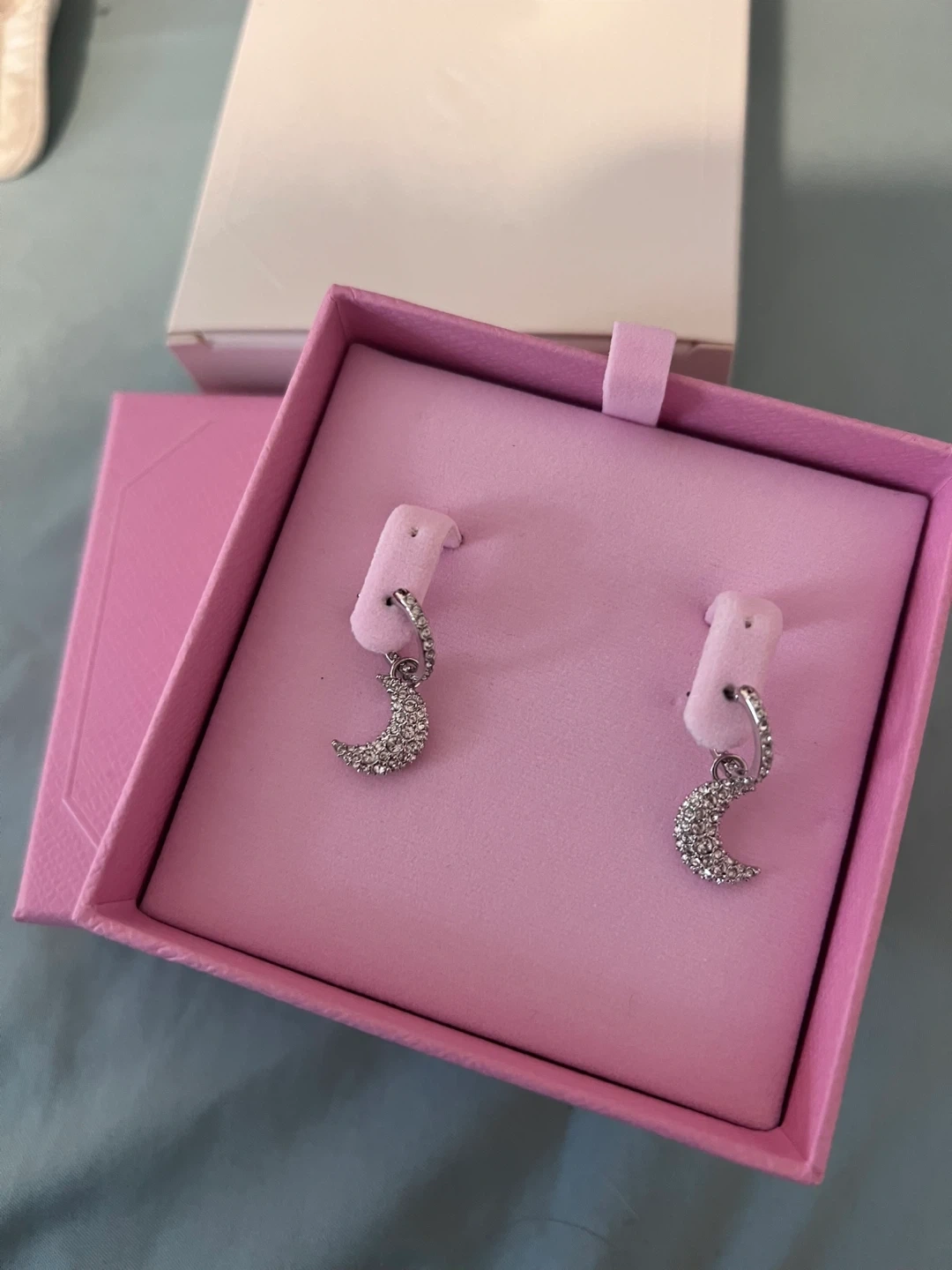 These are a pair of swarovski crescent moon earrings. They come in the original cute pink box, perfect for gifting or keeping them safe. They are silver colored and have sparkly details.