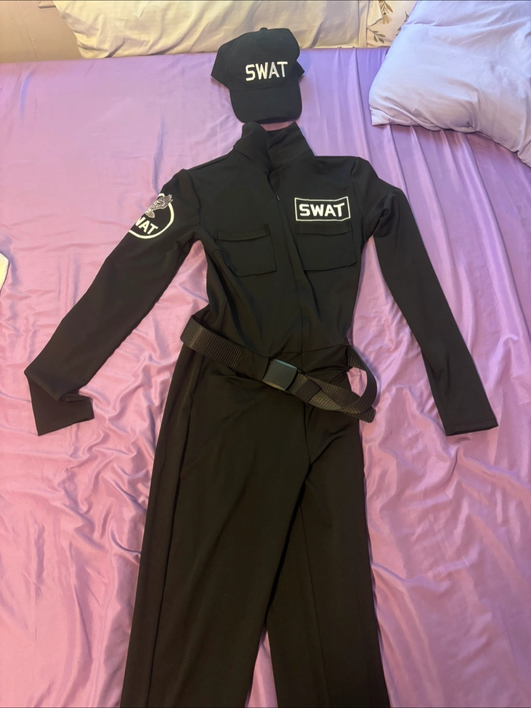 Selling a SWAT costume that includes the jumpsuit, hat, and belt. It's in great condition and perfect for dress-up or Halloween!