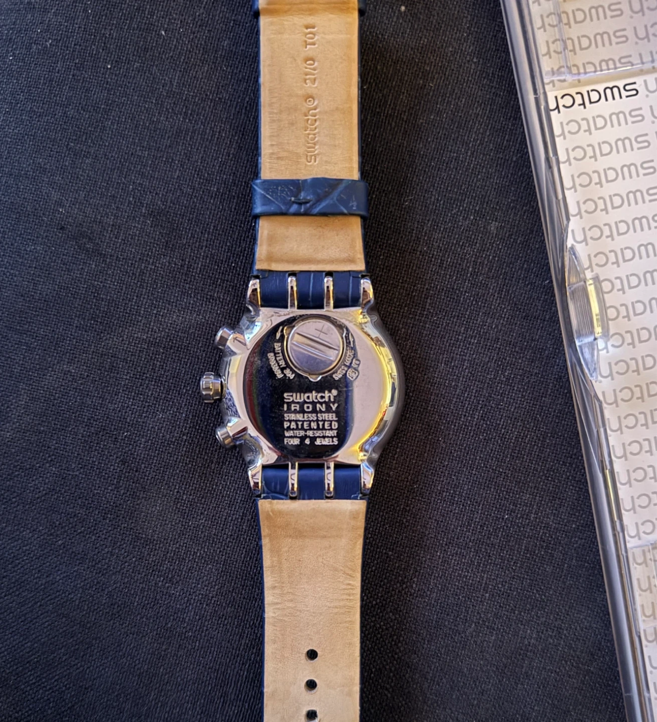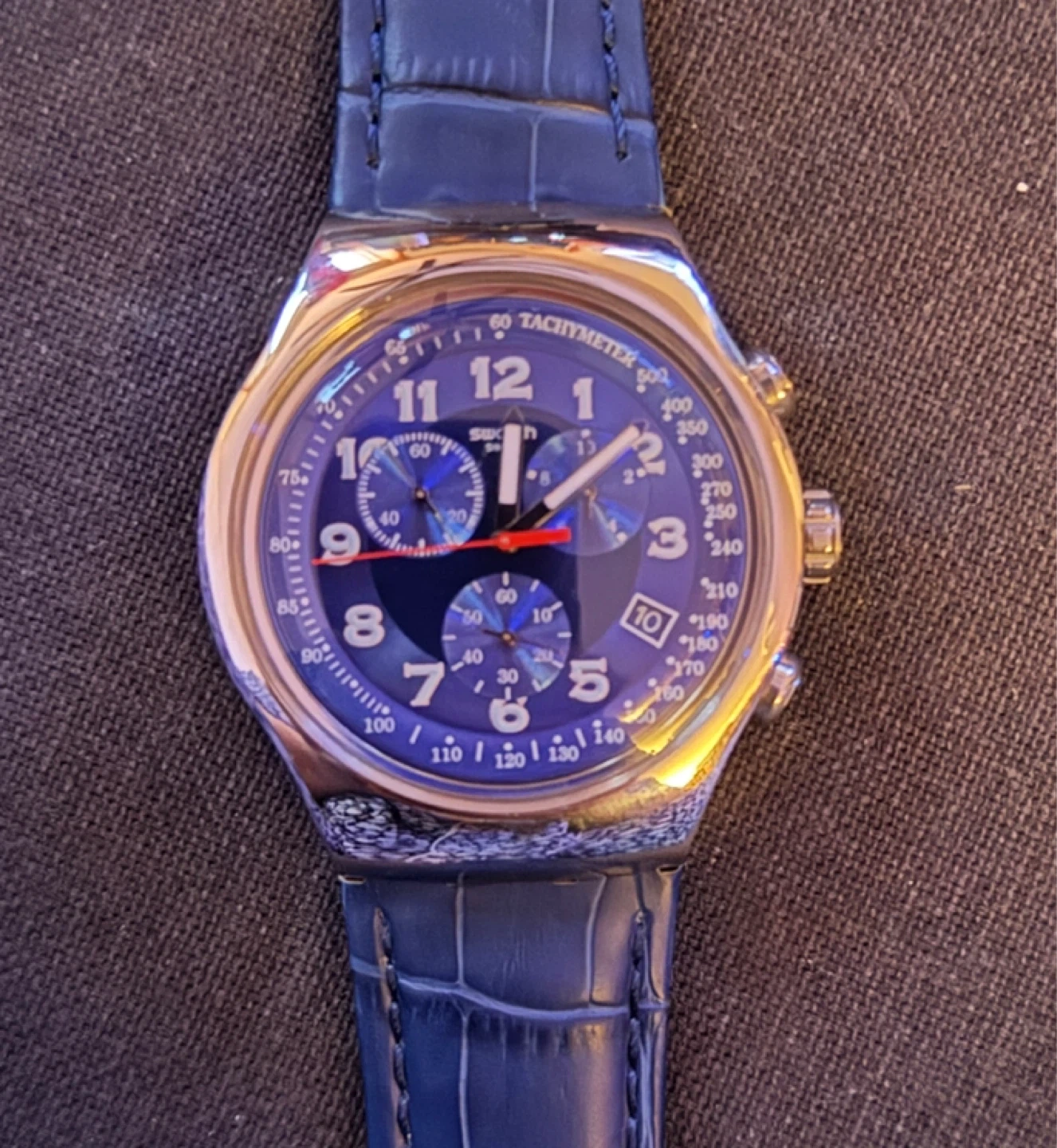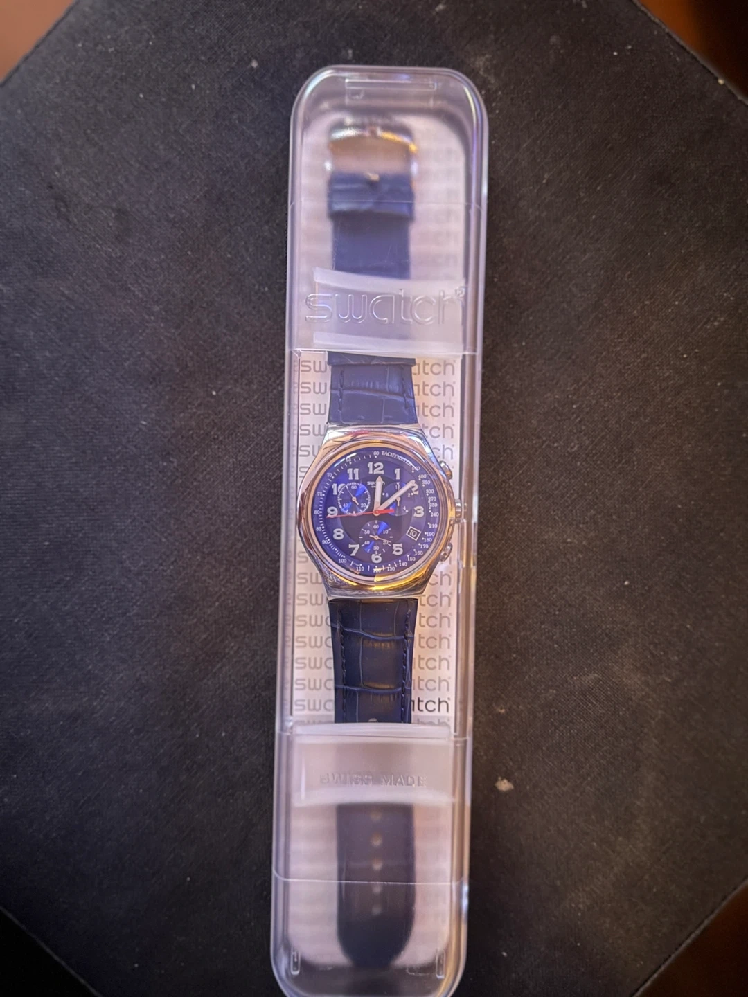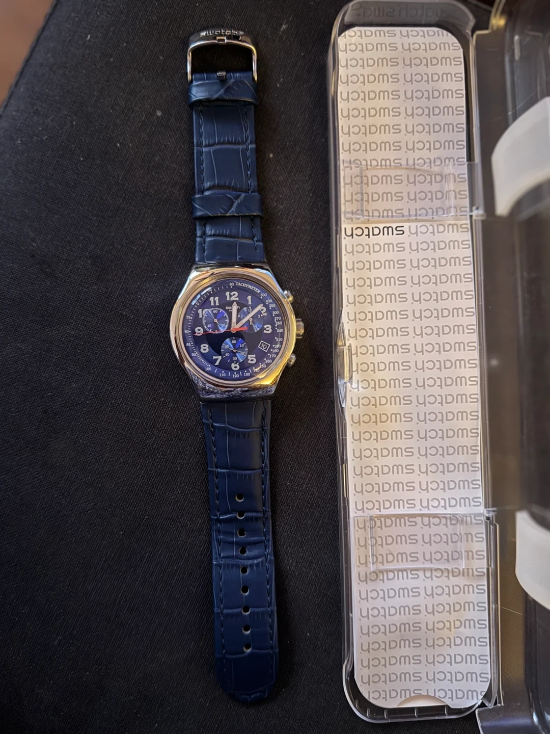 0Selling a Swatch Blue Turn model YOS449 stainless steel watch with a blue leather strap. It comes with the original box. The watch features a quartz movement, a date display, has a chronograph function and four jewels. New - never worn.