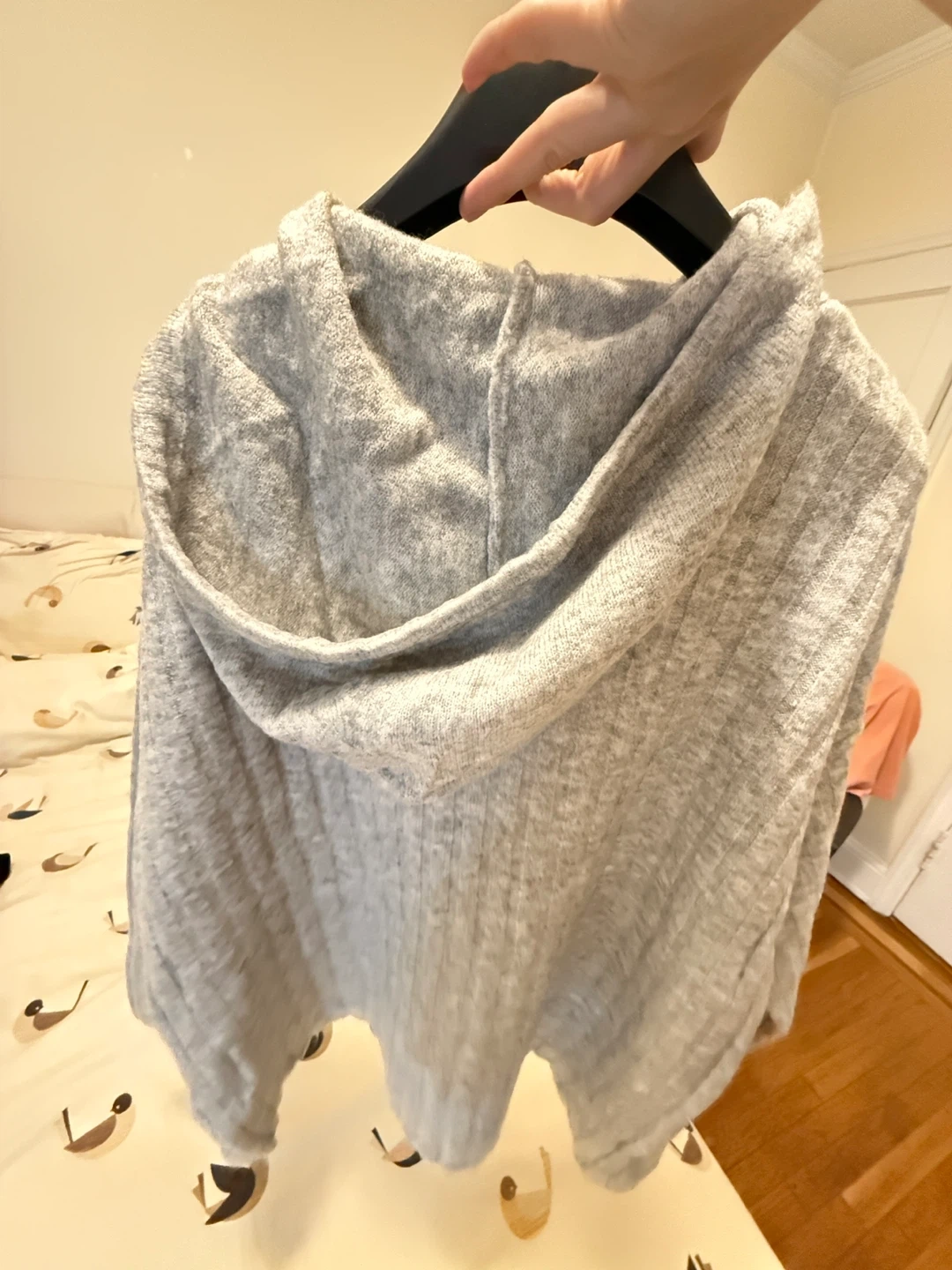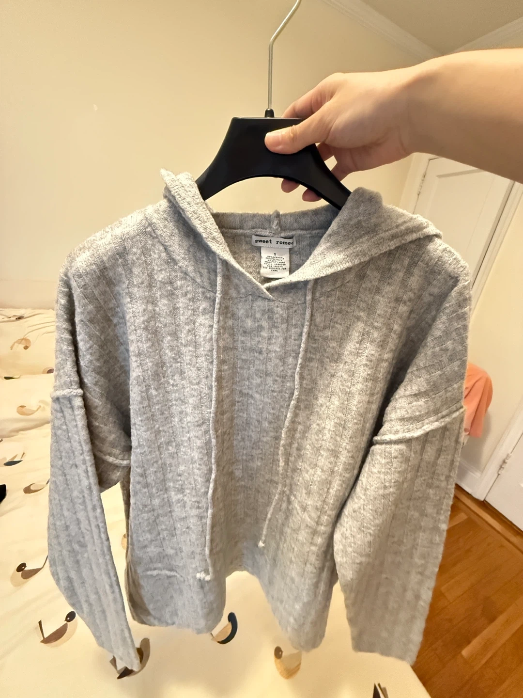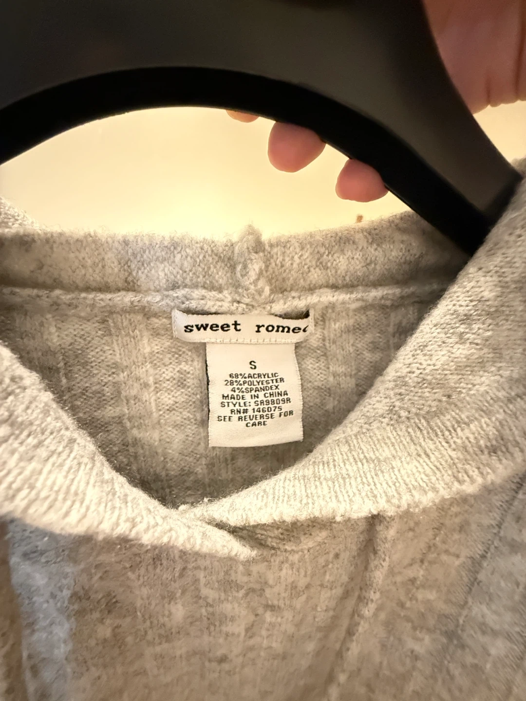 Selling a cozy Sweet Romeo hoodie in size small! It's a light gray color and made of 68% acrylic, 28% polyester, and 4% spandex
