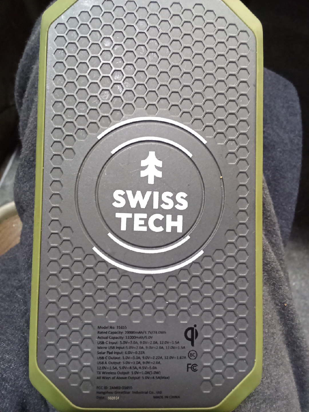 10I'm selling a Swiss Tech power bank with a 20000mAh capacity. It features multiple USB ports (USB-A and USB-C) for charging various devices. The power bank also has a built-in light! Model number is 31323.