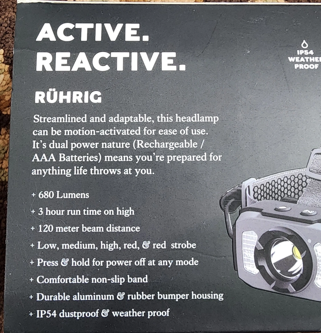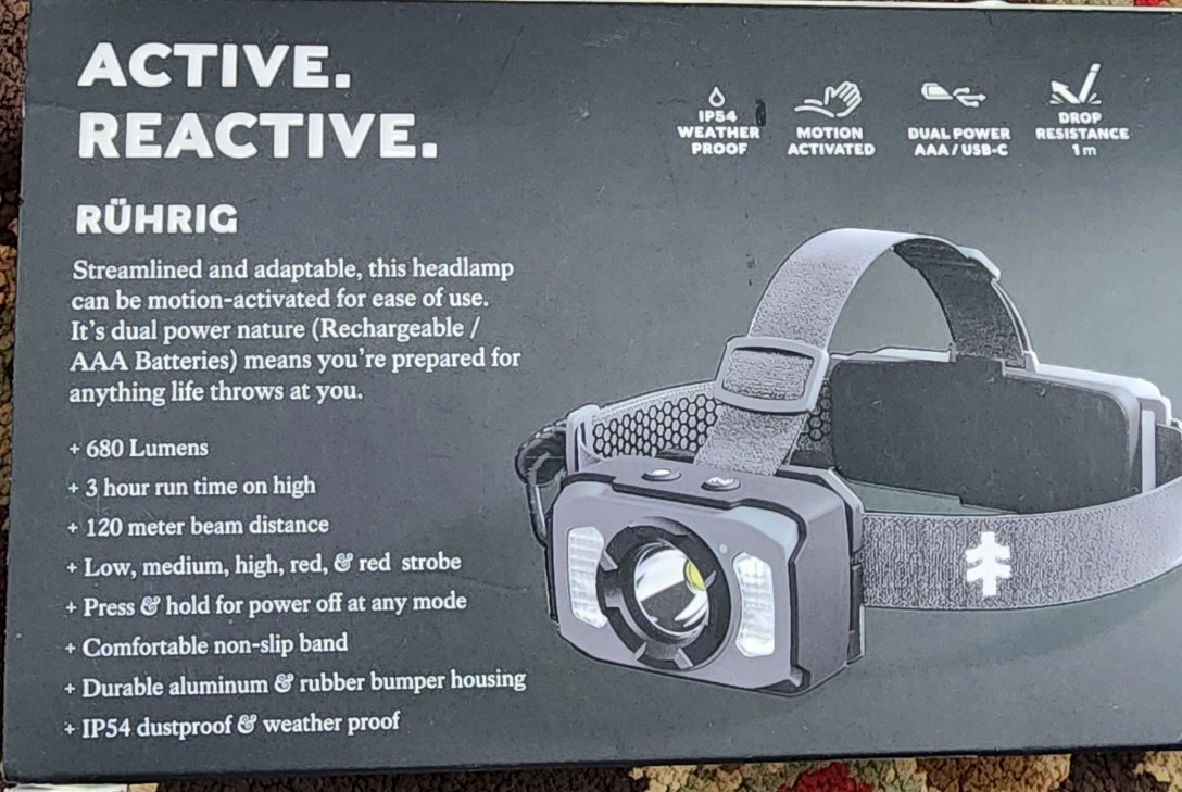 Dual power headlamp. Motion activated. IP54 weatherproof. 680 lumens. AAA batteries or USB-C rechargeable. Durable aluminum and rubber housing. Comfortable non-slip band. Multiple light modes.