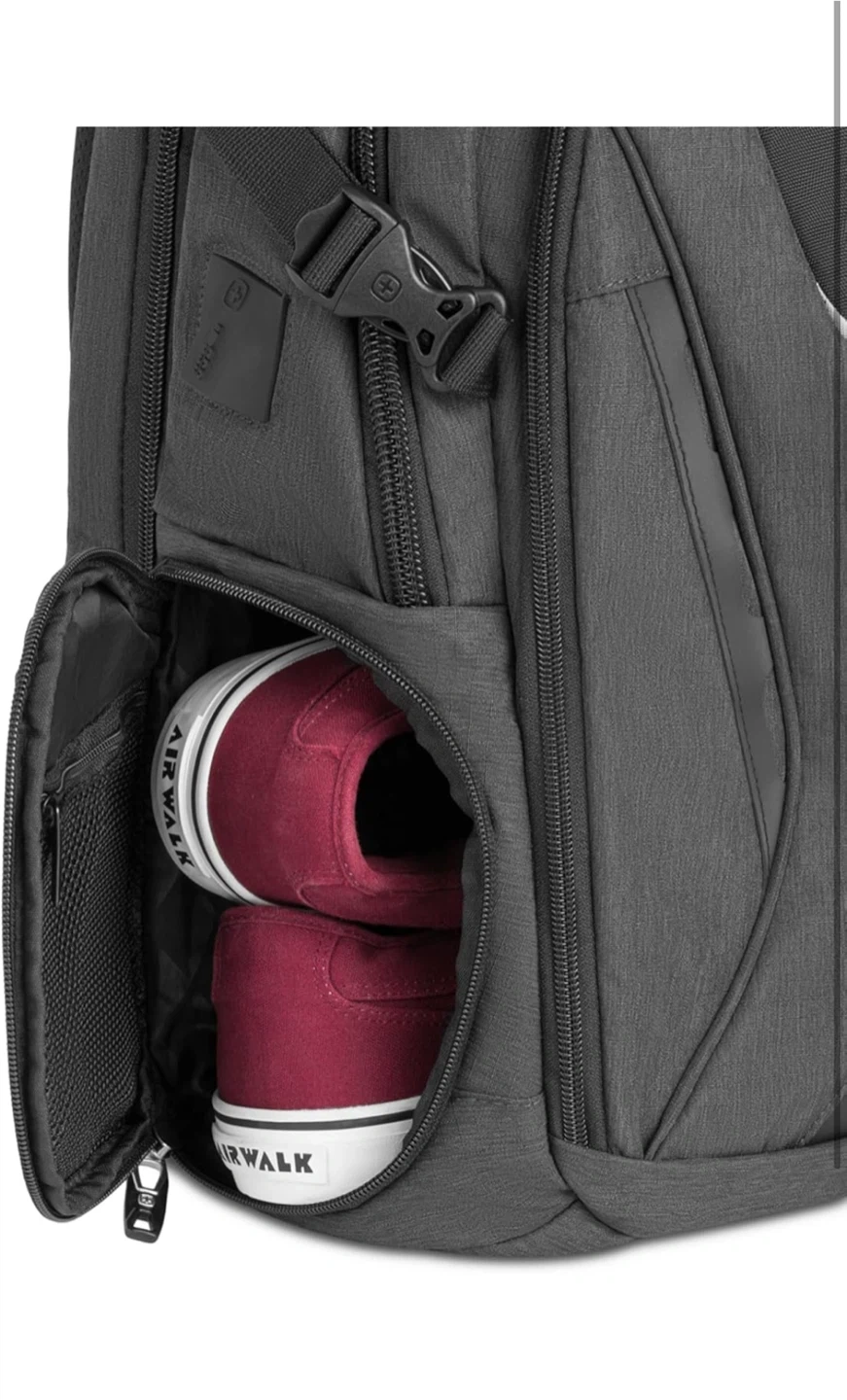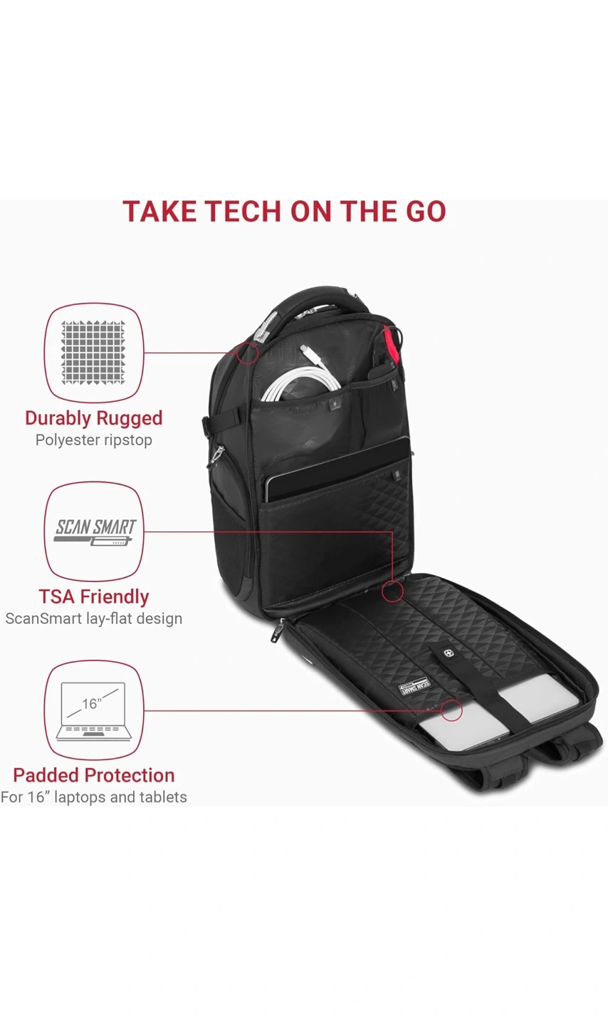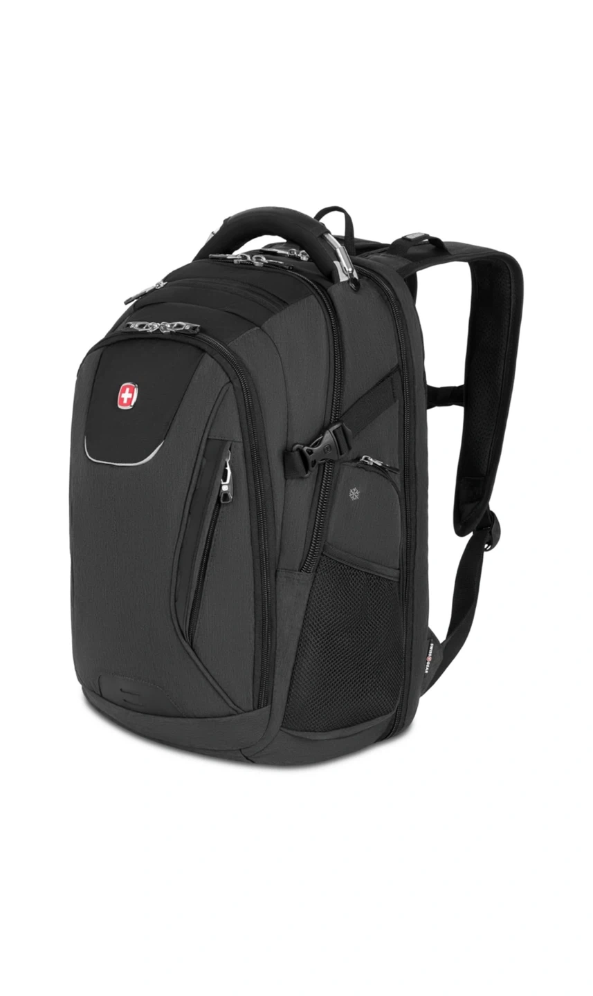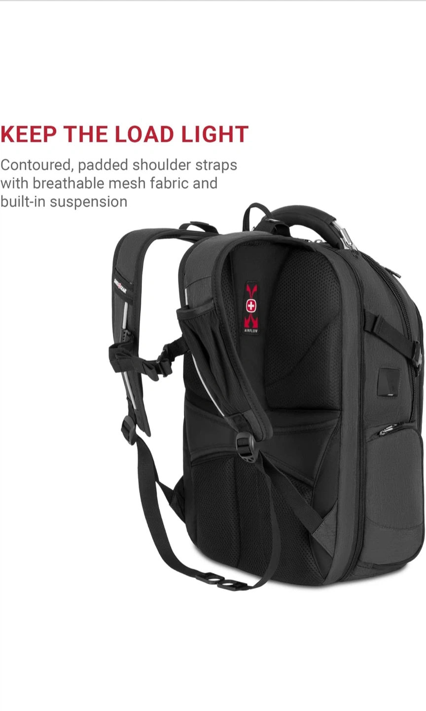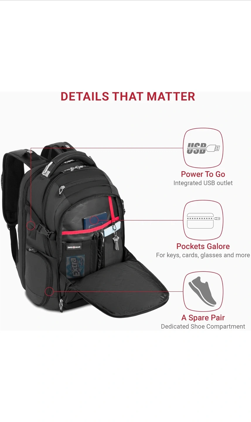 65This is a SwissGear ScanSmart Laptop Backpack in black! It has padded shoulder straps with breathable mesh fabric and built-in suspension to keep the load light. There's also a dedicated shoe compartment, integrated USB outlet, and lots of pockets for your keys, cards, glasses, and more