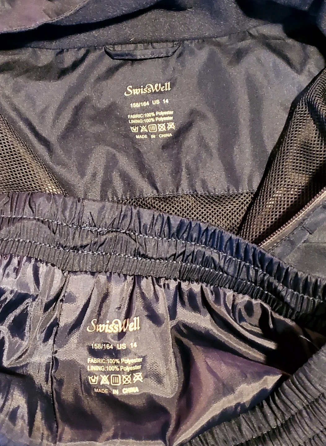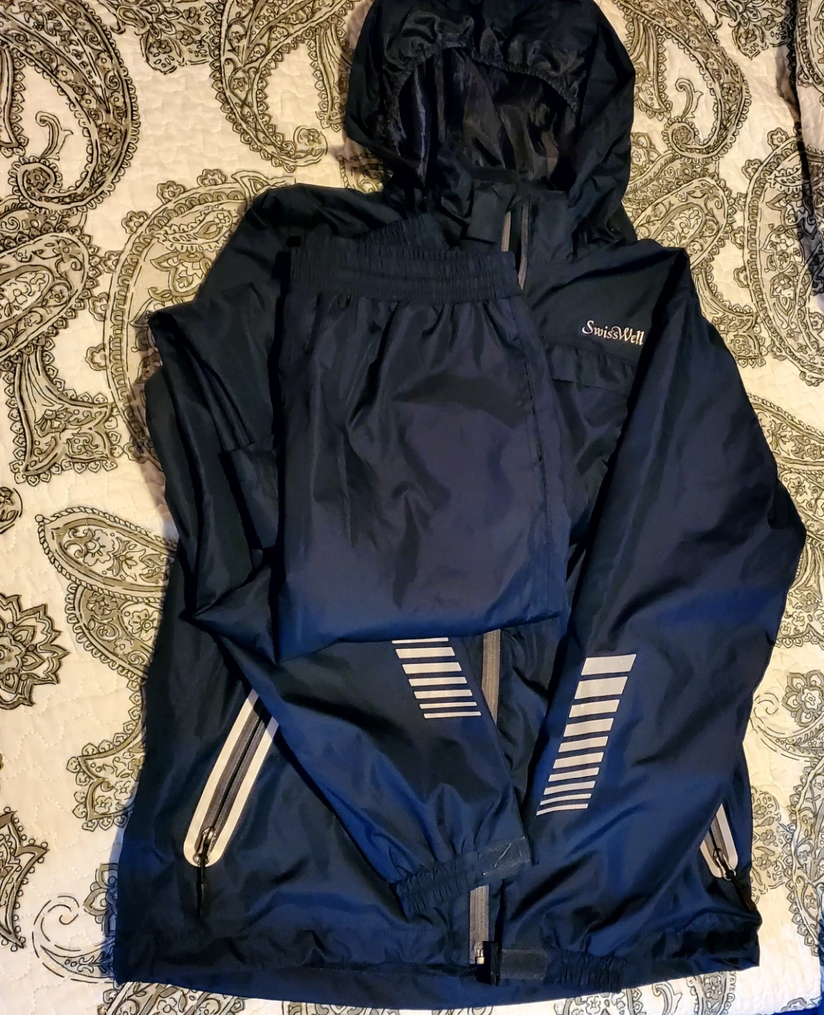 5Selling a SwissWell rain suit in size US 14! The fabric and lining are both 100% polyester, making it lightweight and easy to pack. Perfect for staying dry on those rainy days!