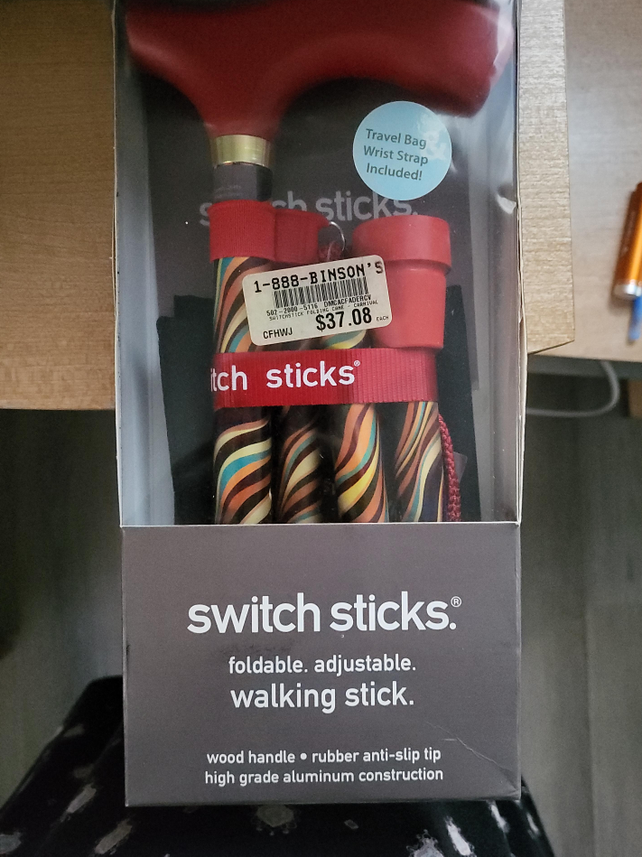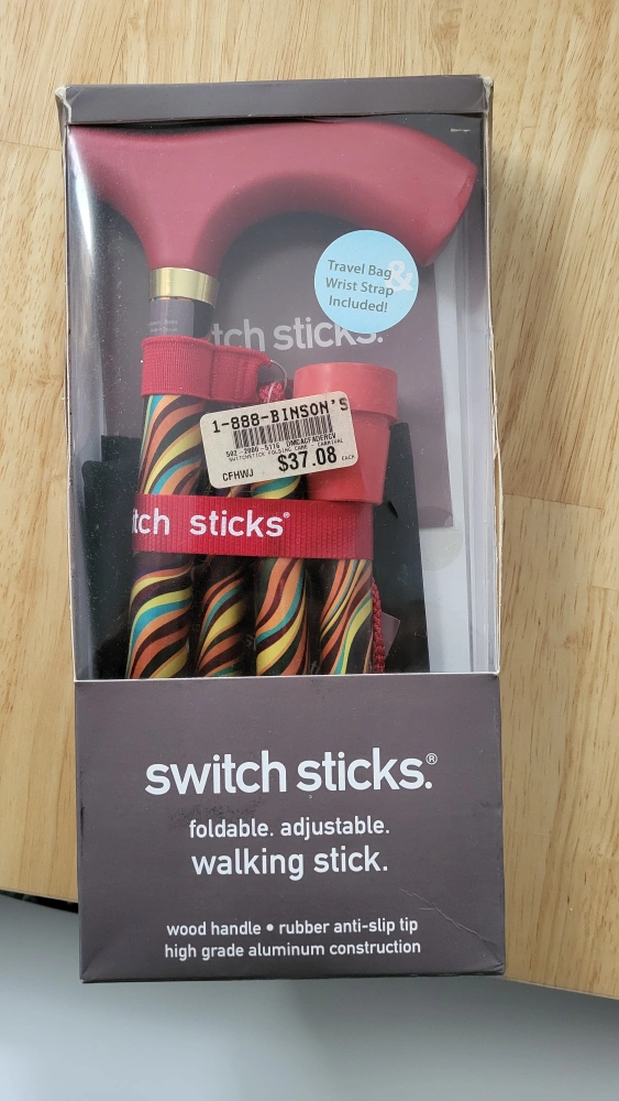 I'm selling a brand new Switch Sticks foldable, adjustable walking stick still in its original box! It features a wood handle with a rubber anti-slip tip and high-grade aluminum construction. A travel bag and wrist strap are also included. Originally priced at $37.08 Cash only