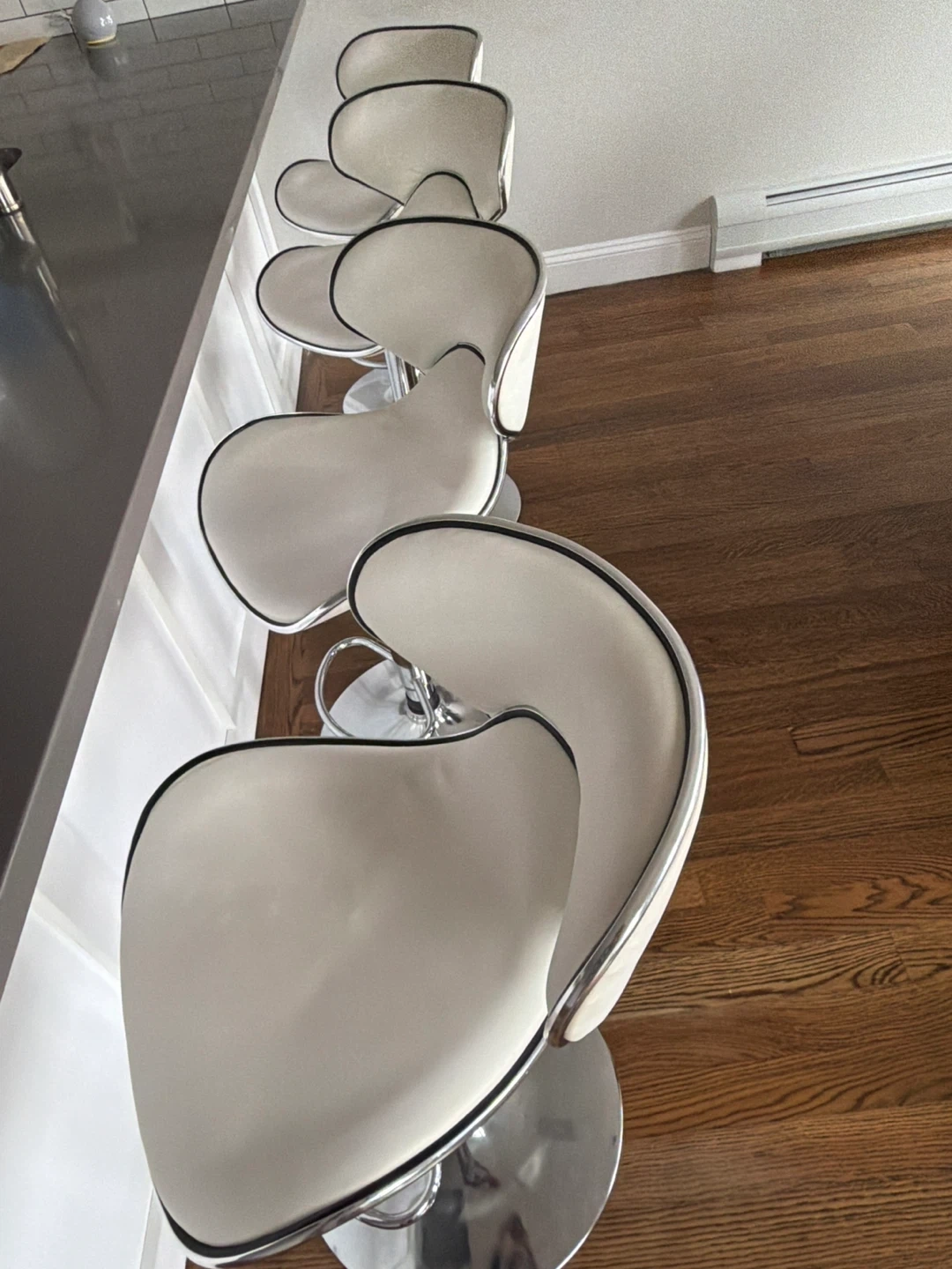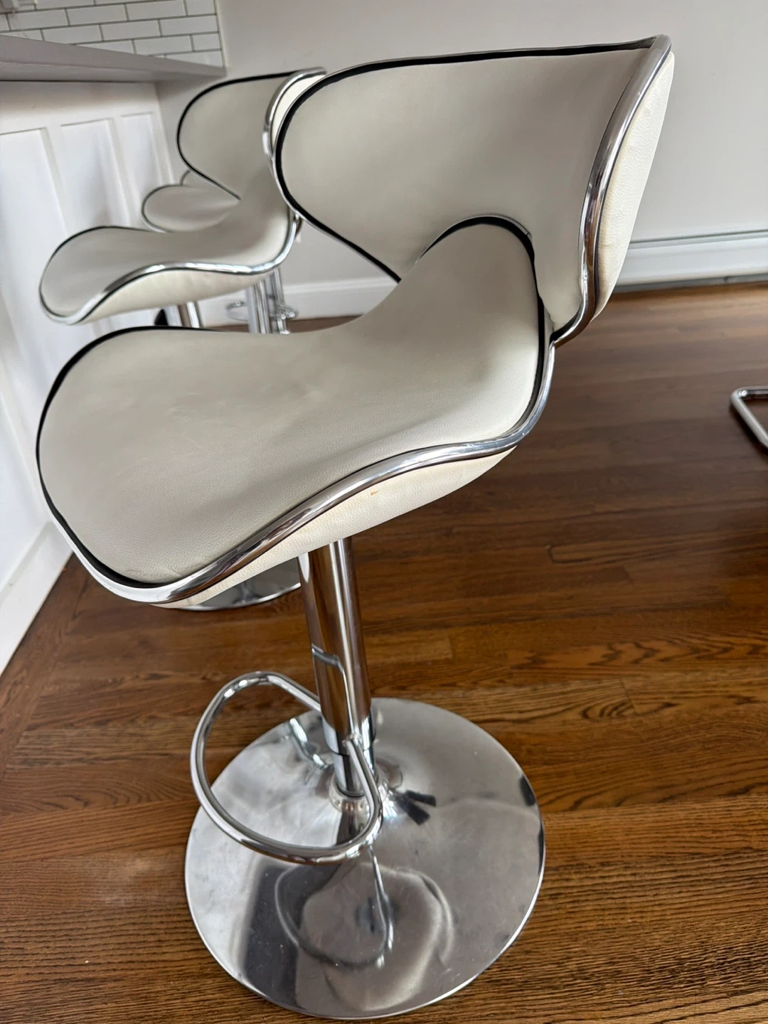 60Selling a set of 5 swivel bar stools. They are in great condition and would look great in any kitchen or bar area. The stools feature a sleek design with a chrome base and a comfortable white seat. They are perfect for adding a touch of modern style to your home!