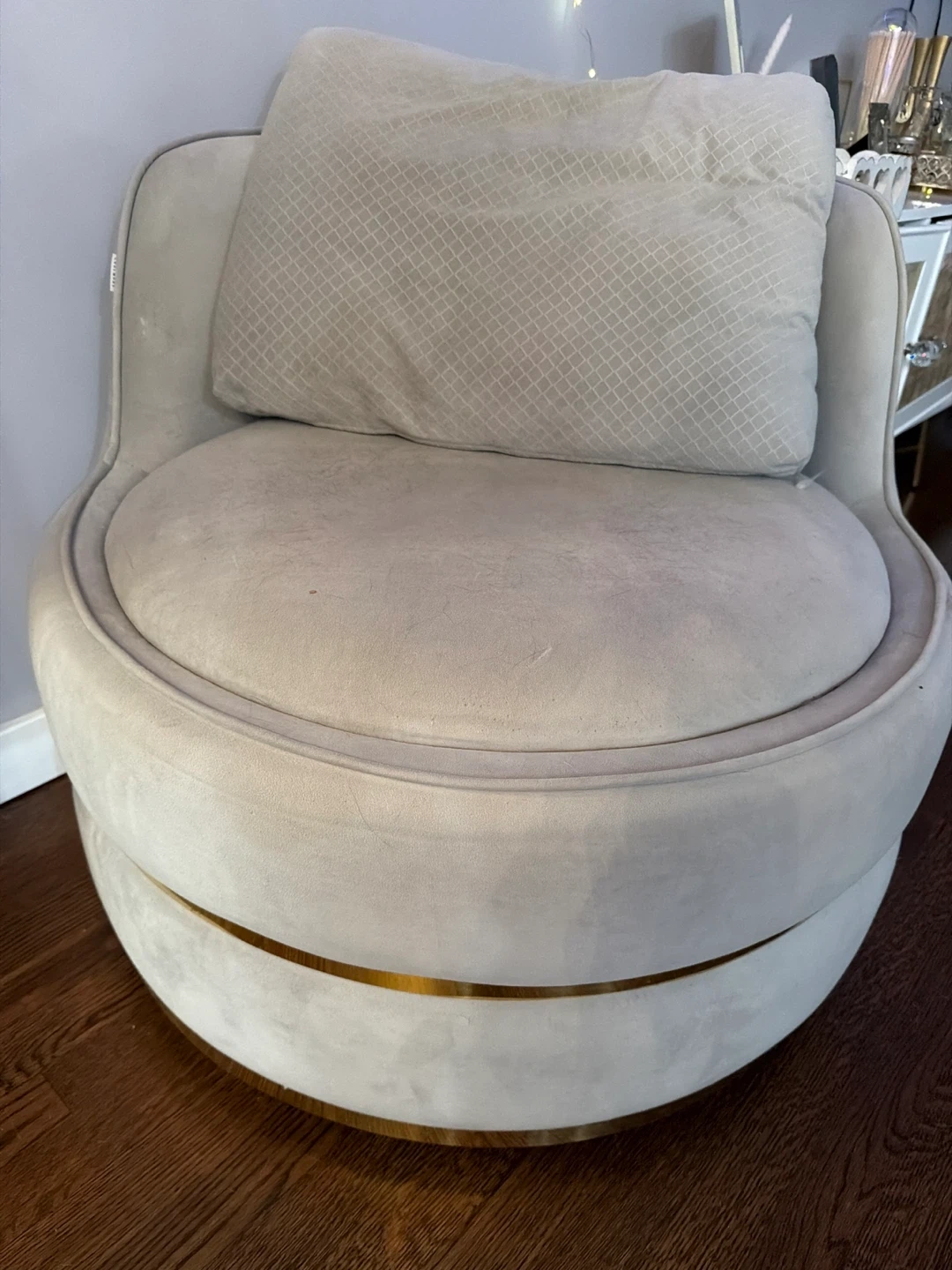 10Selling a pair of grey-colored swivel barrel accent chair. It's in good condition and would be a great addition to any room. I have 2 of them but you can buy 1 or 2 . Both chairs are in OK condition. I have a cat and both chairs have multiple scratches that are not really noticeable unless you very close but still - they are there . One more than another .