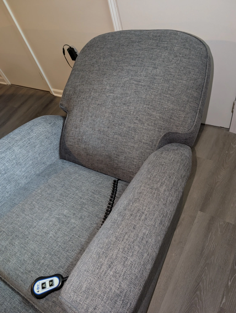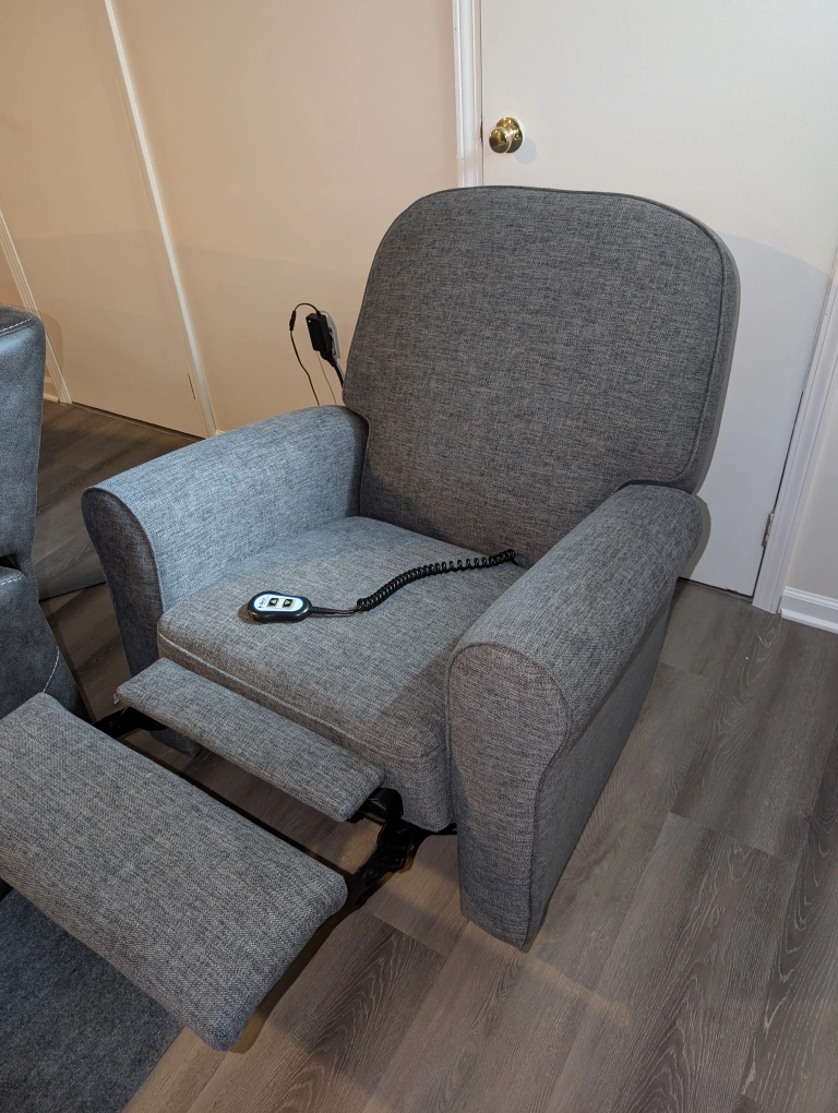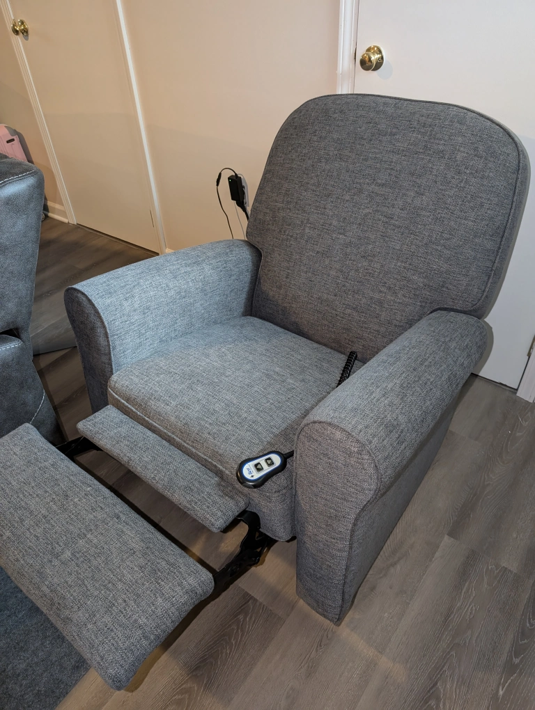 This chair is electric and features a footrest that extends and a back that reclines. It is in a blue grey fabric. Great for Nursery and TV room.