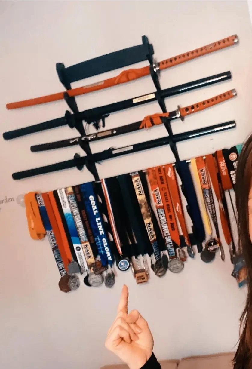 This is a wall-mounted sword rack, perfect for displaying your swords or other collectibles. It has a dark finish and is designed to hold multiple items securely. Great for showing off your collection! (swords and medals pictured not included. for reference only)