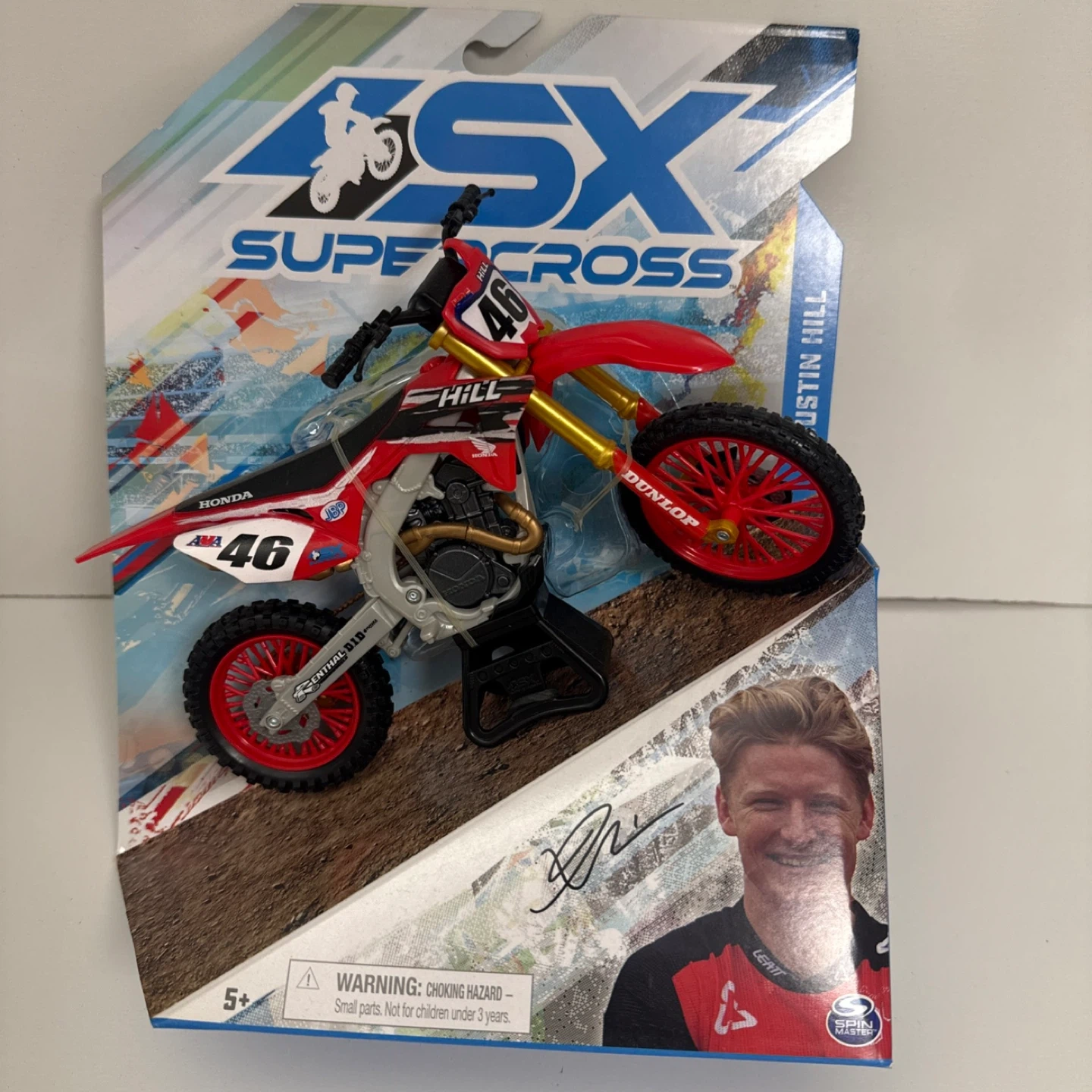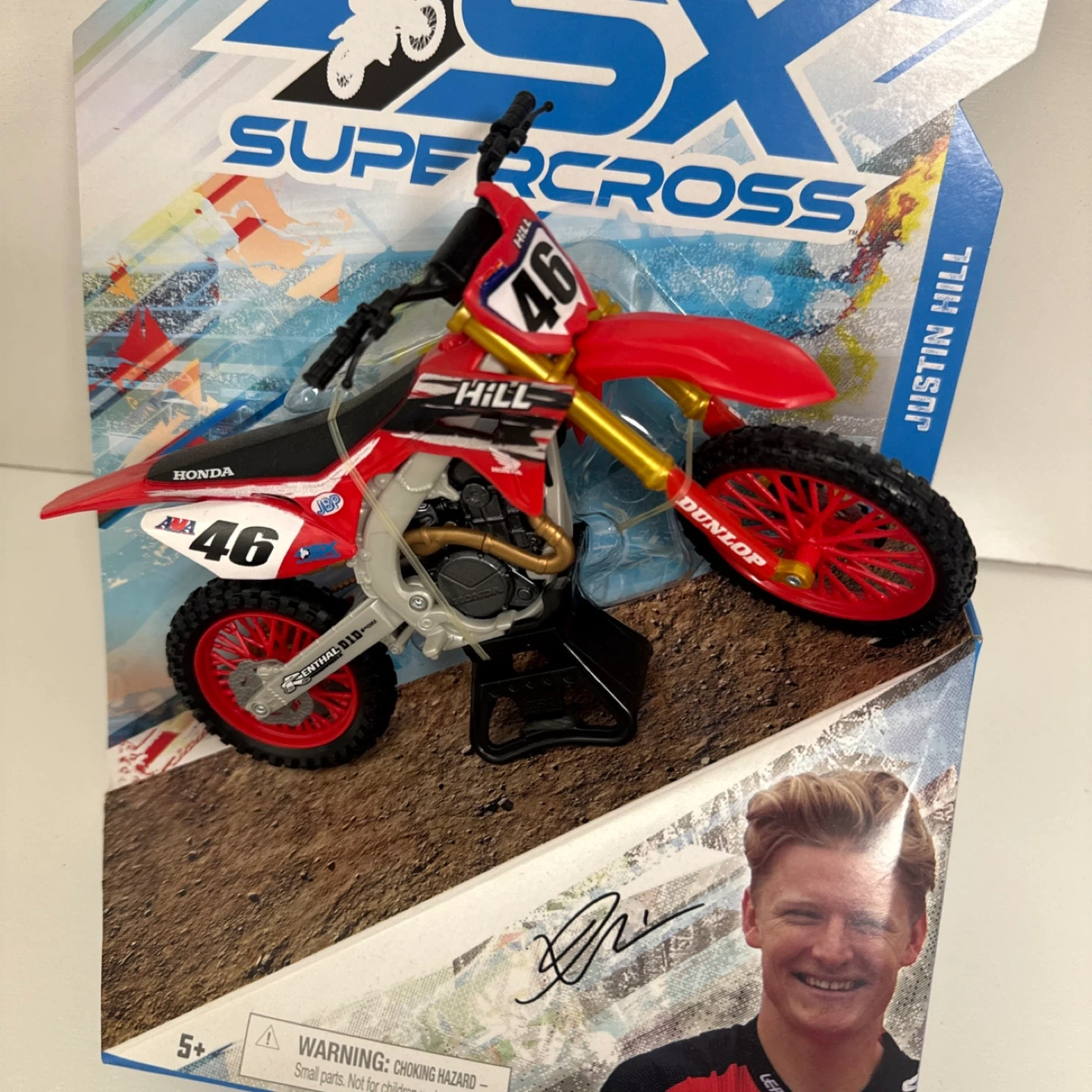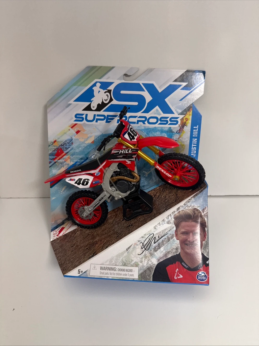 65Selling a SX Supercross Honda 46 Justin Hill toy motorcycle. It's in its original packaging and looks great!