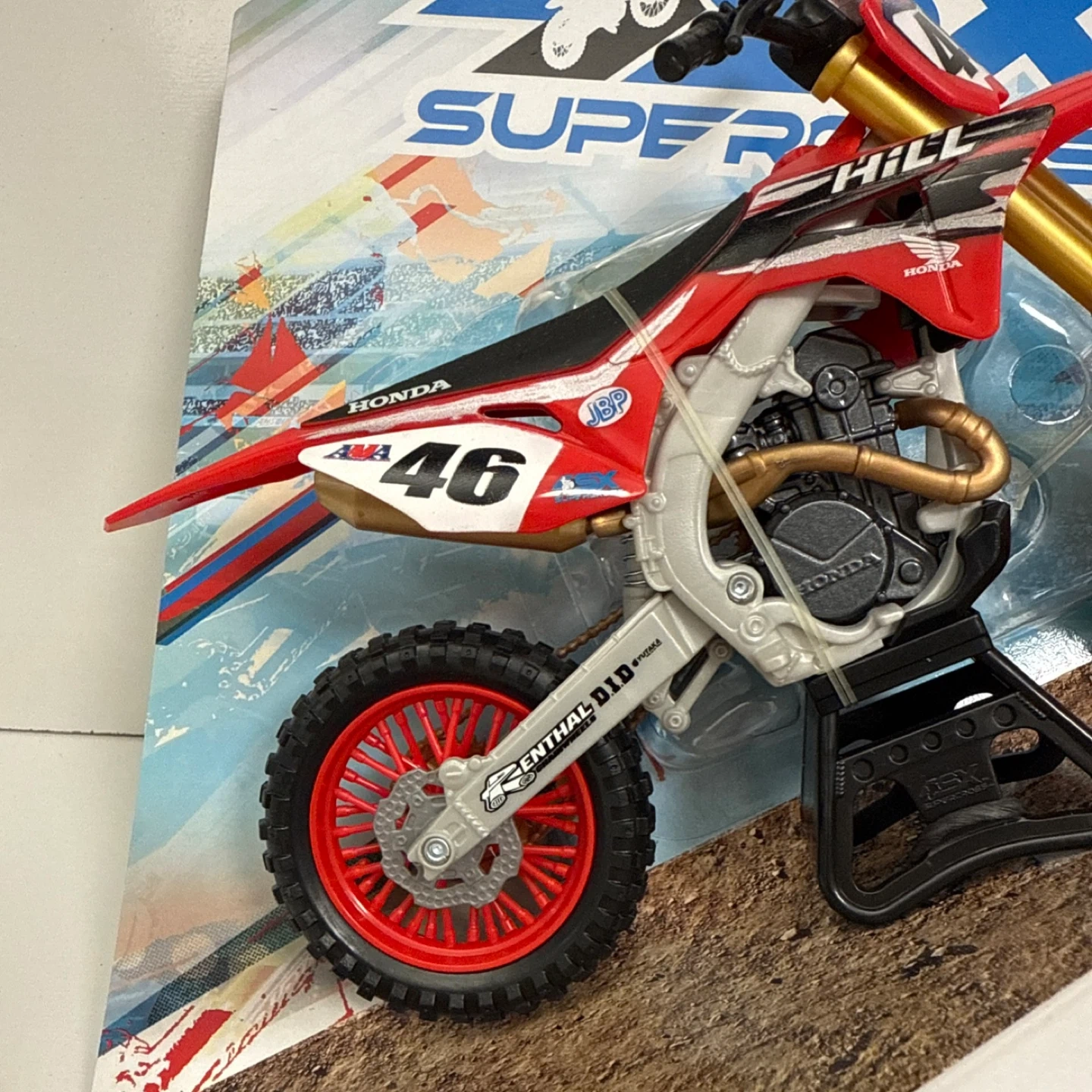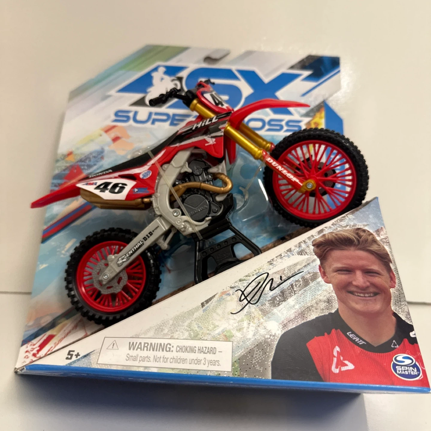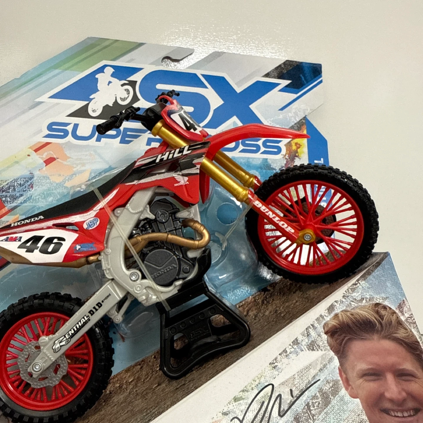 65Selling a SX Supercross Honda 46 Justin Hill toy motorcycle. It's in its original packaging and looks great!
