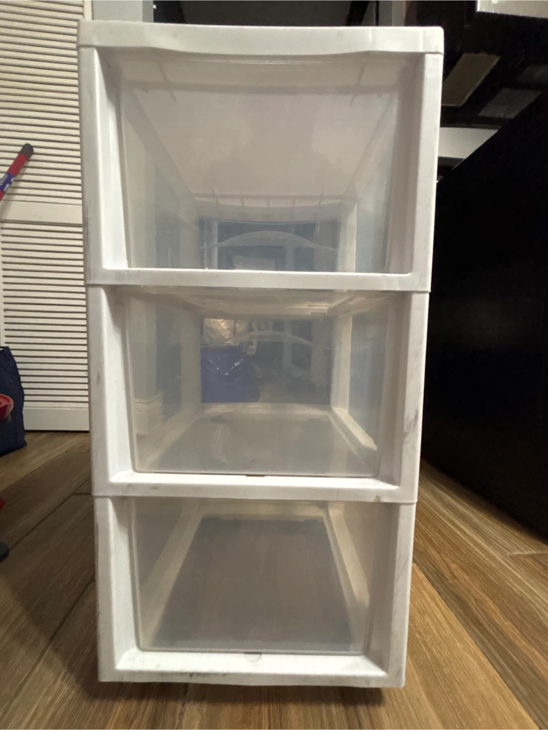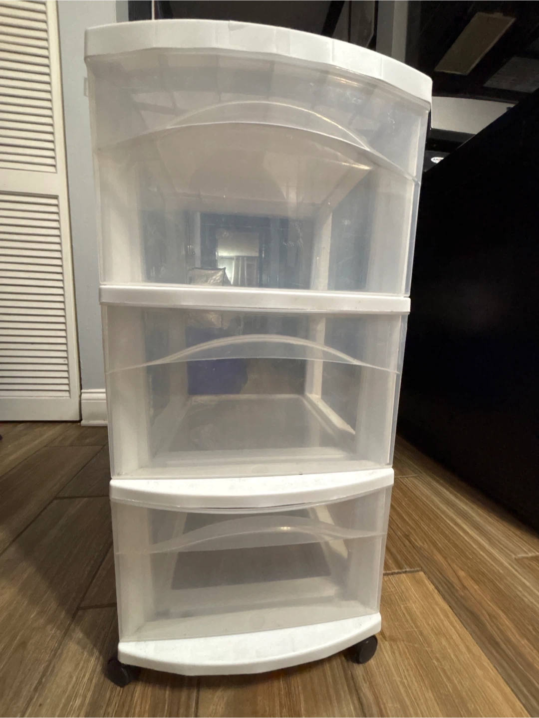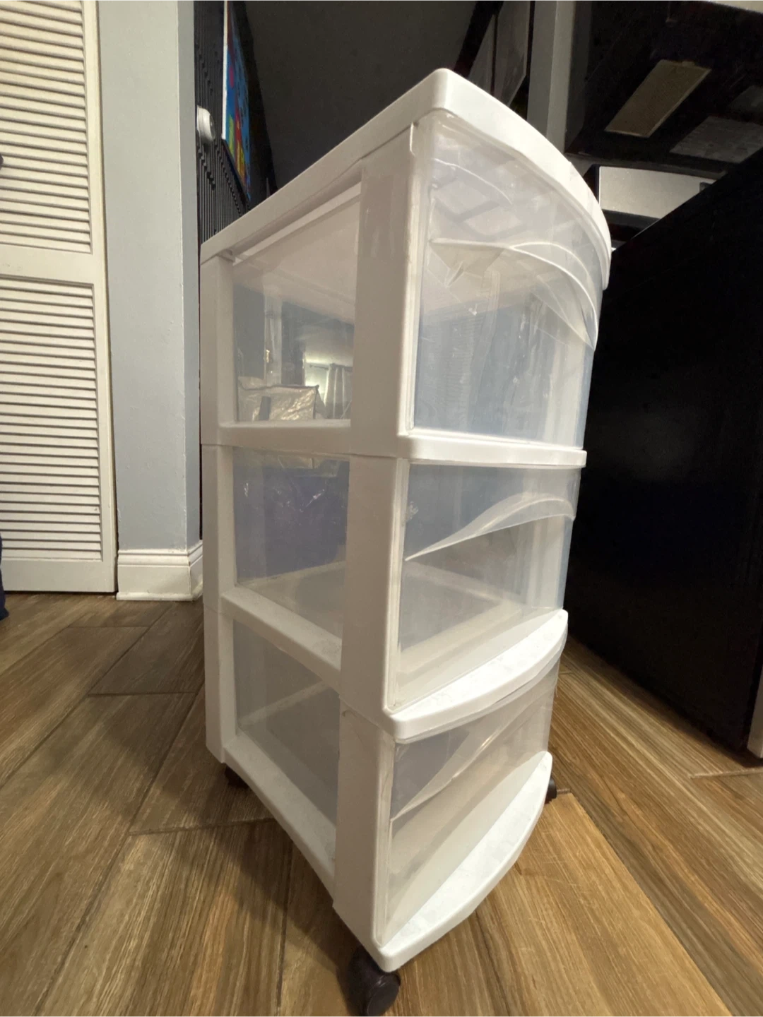 A handy 3-drawer plastic storage cart. It's white and clear with rolling wheels for easy movement. Great for organizing craft supplies or small items!