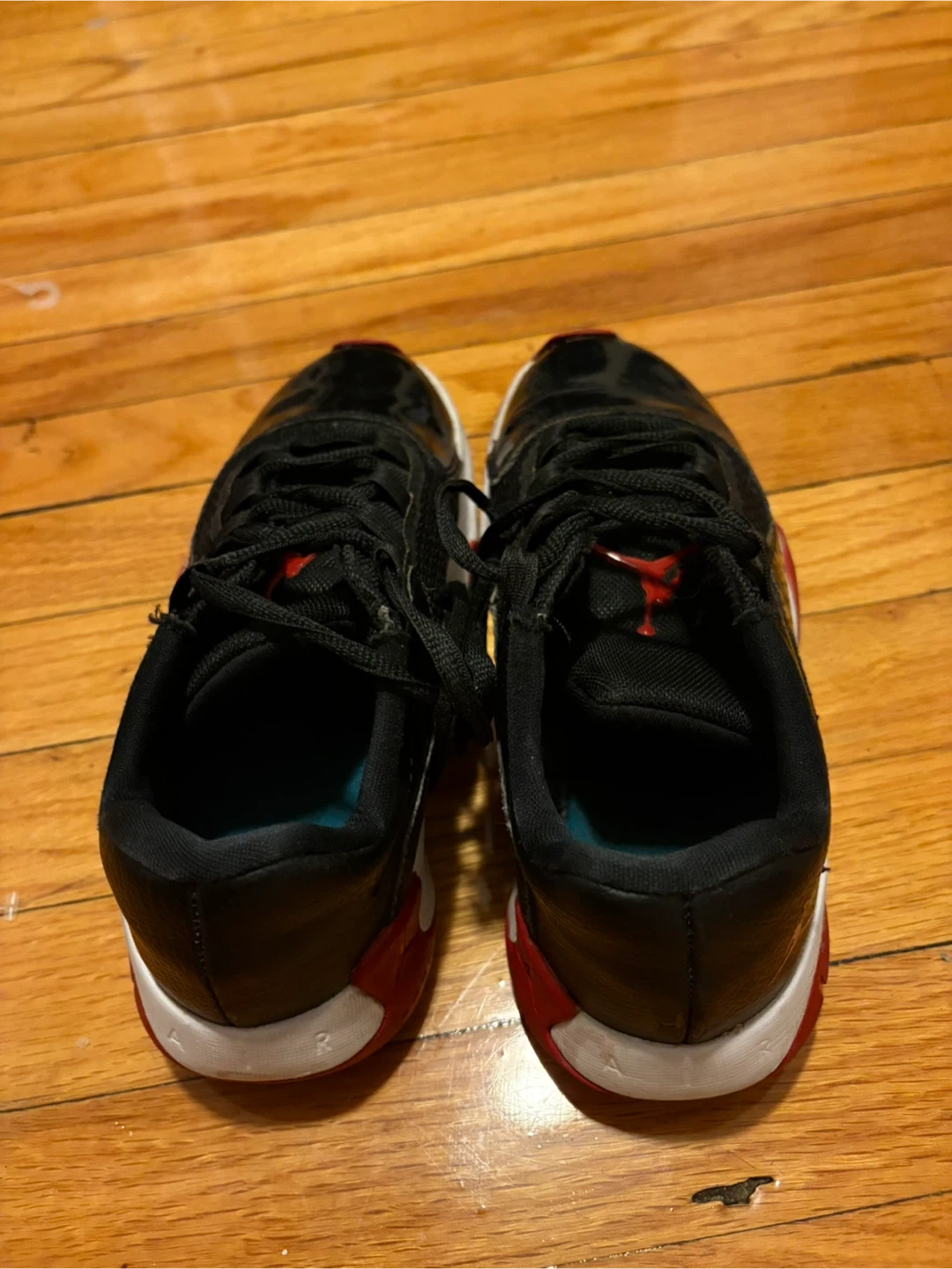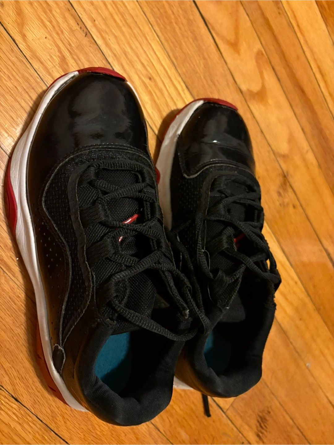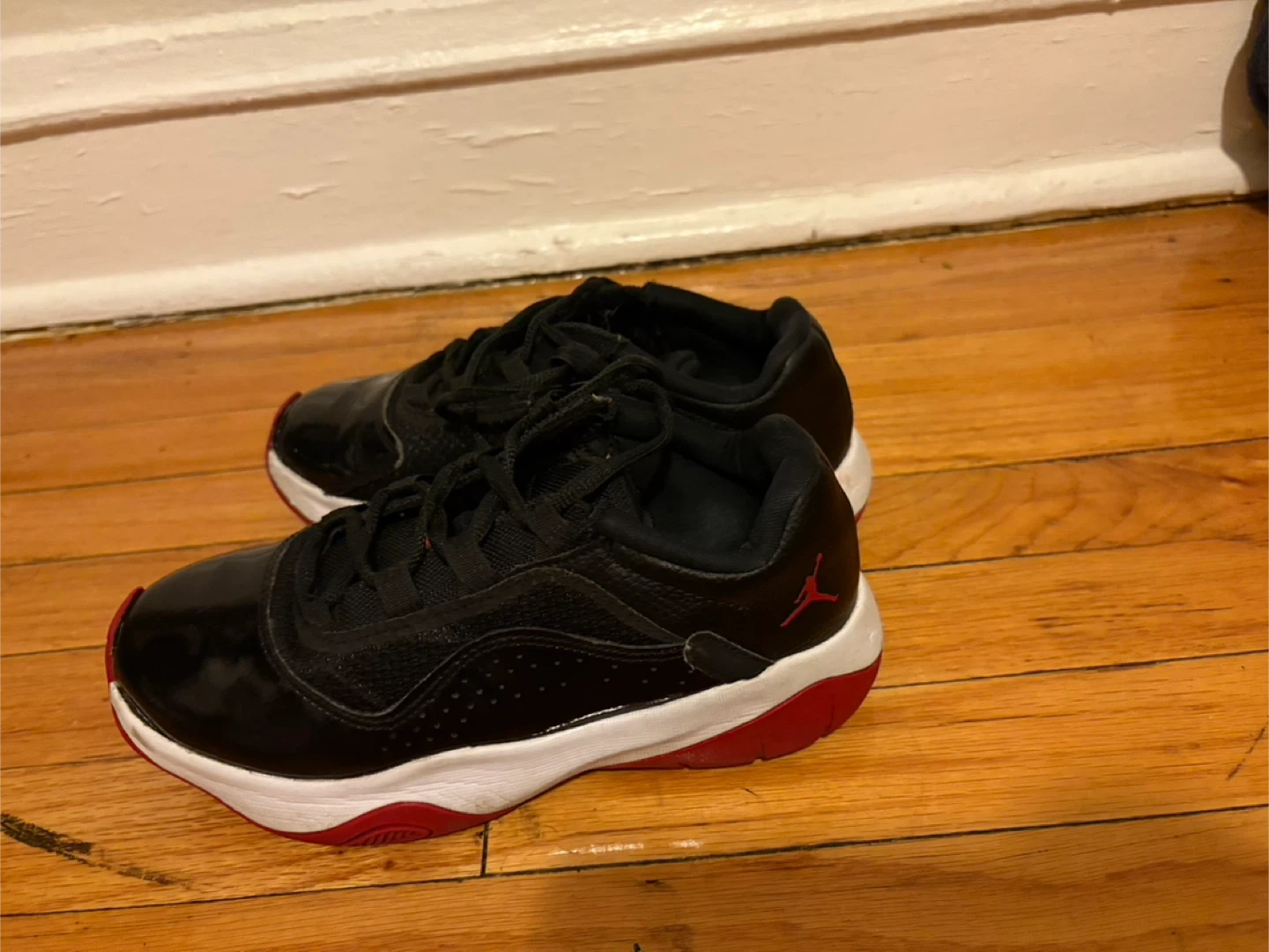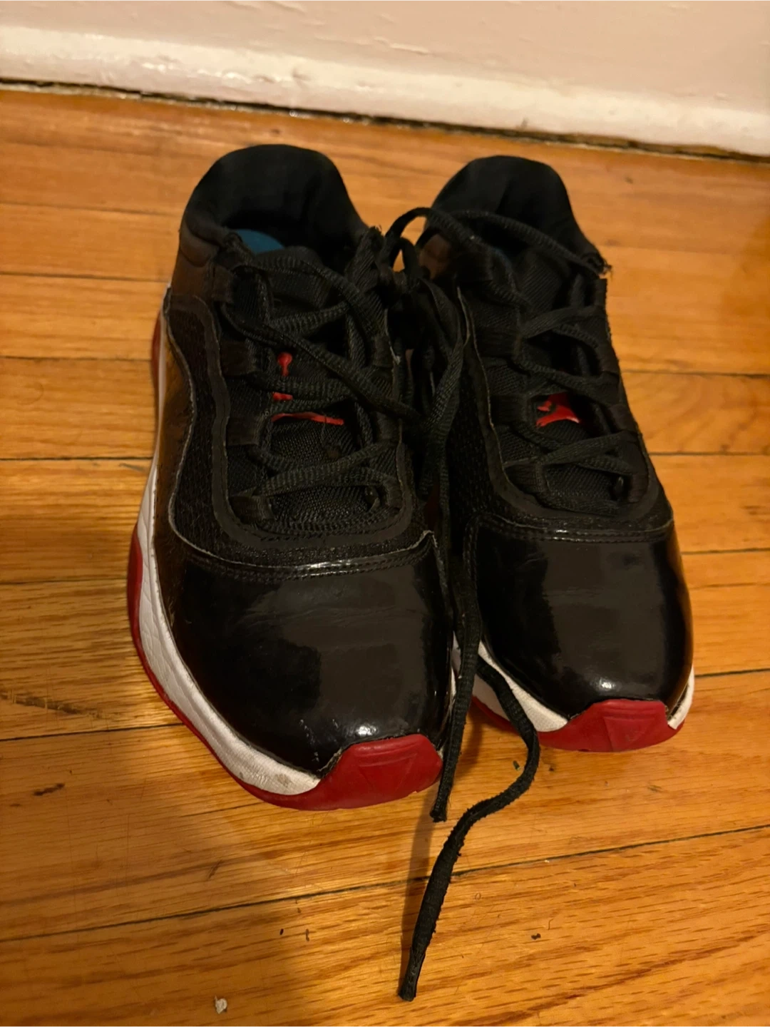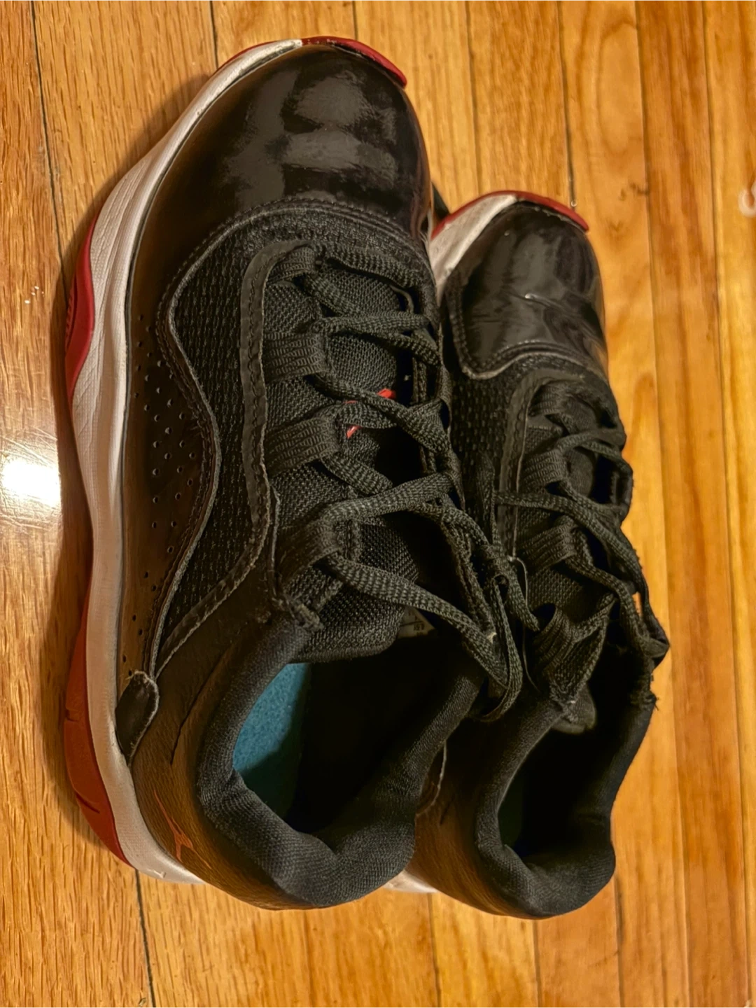 Air Jordan 11 Retro Low TD "Bred" shoes. Black patent leather and mesh upper with red accents. White midsole and red outsole.