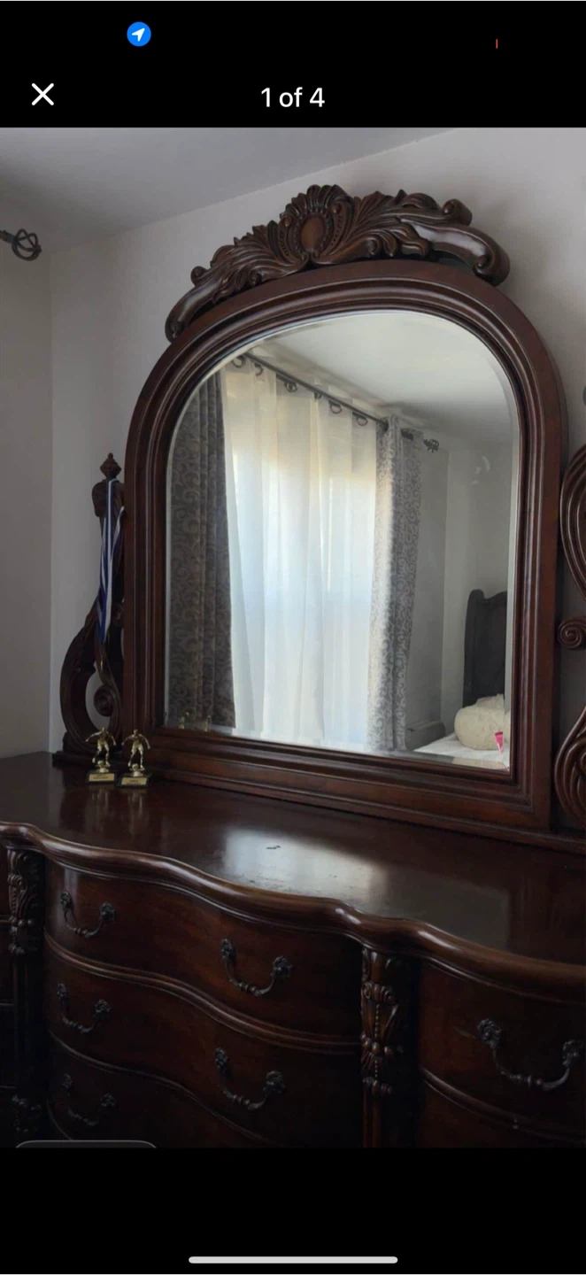 This is a beautiful dark wood dresser with an arched mirror. It features ornate carvings and curved drawers for a classic look. The wood finish is a deep, rich tone.