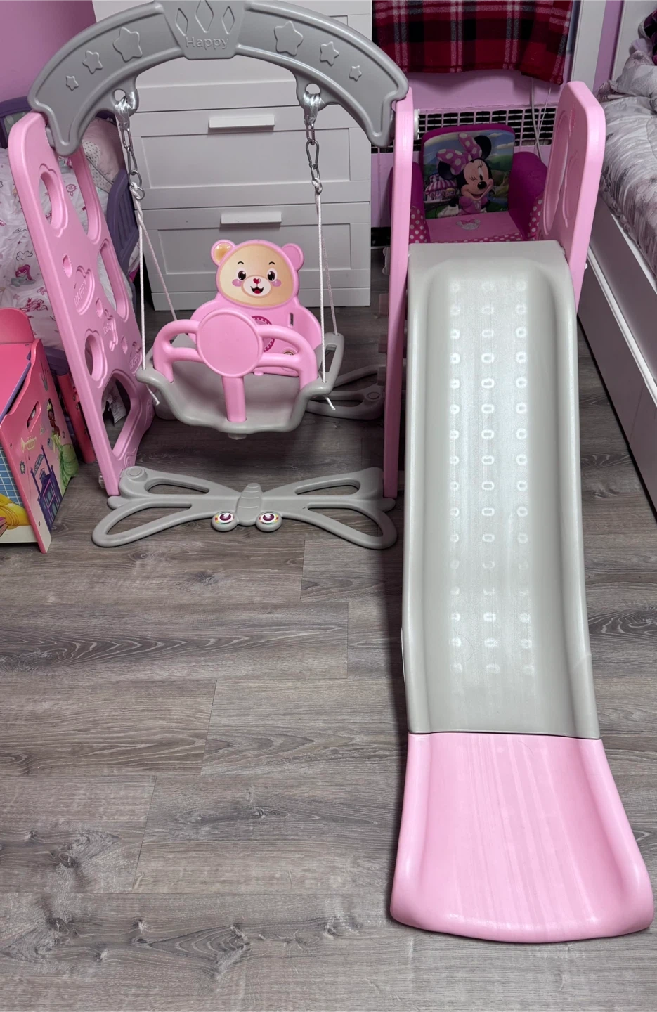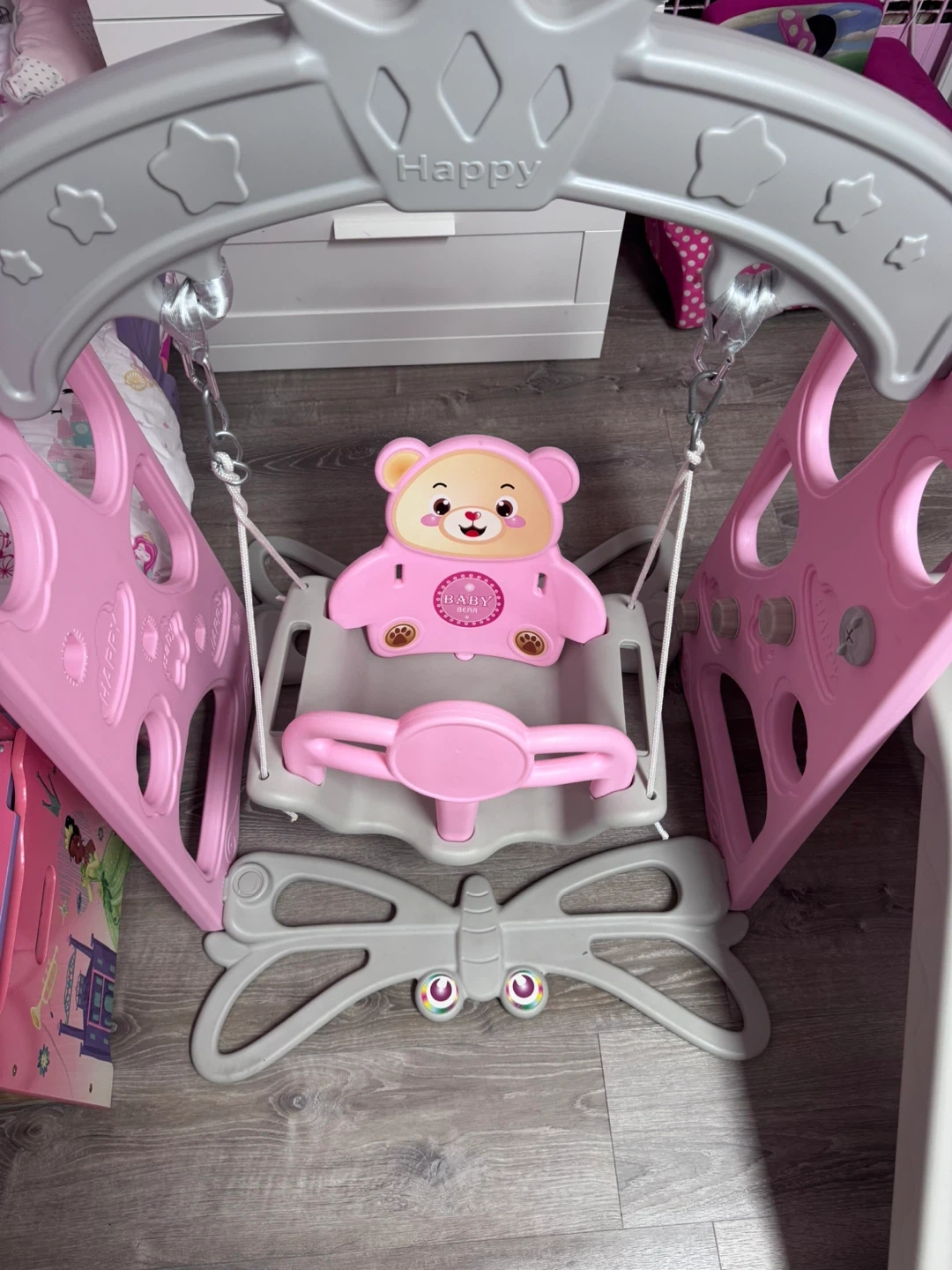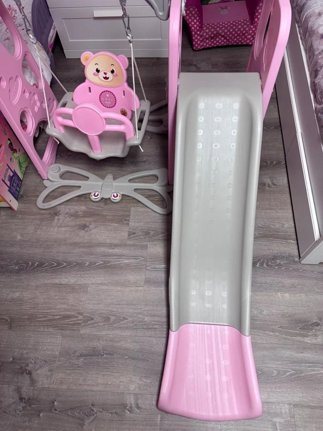 This is a cute pink and gray Baby swing and slide set! Perfect for little ones to have some fun and get some exercise indoors or outdoors. The set includes a swing and a slide, providing hours of entertainment for your child. The swing features a cute teddy bear design