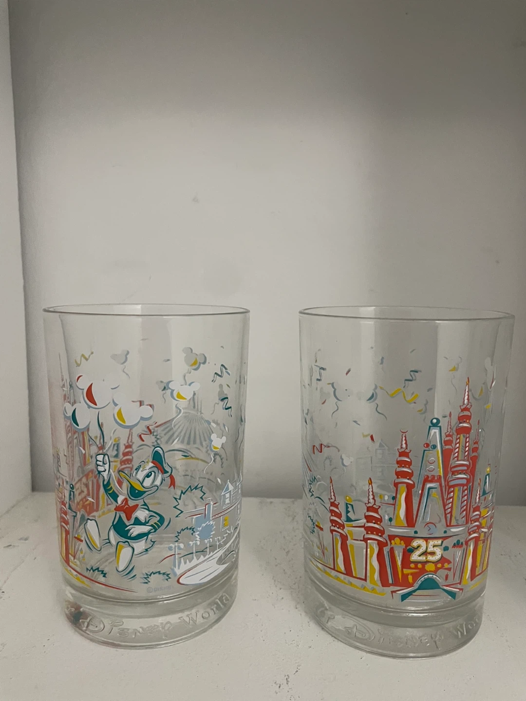 Set of two collectable McDonalds Walt Disney World 25th Anniversary Celebration glasses featuring Donald Duck with park scenery.