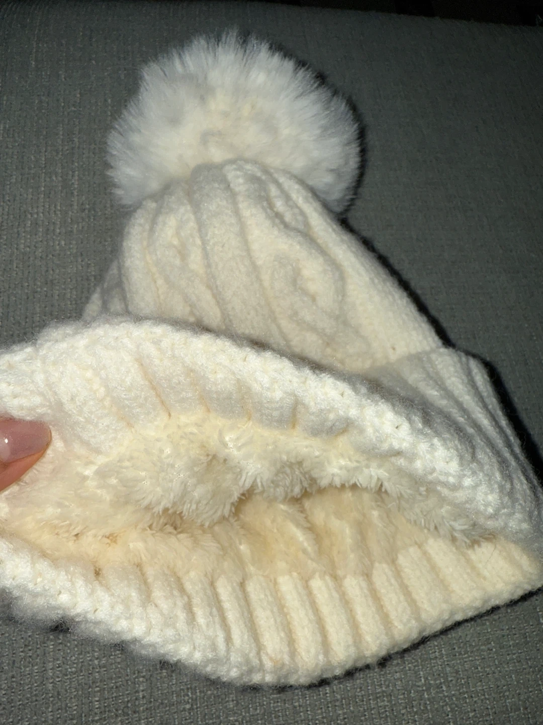 Cozy white cable knit beanie with a soft, fuzzy lining. It's 100% acrylic and features a fluffy pom pom on top. Perfect for keeping warm in cooler weather!π»pick up/ cash only π»