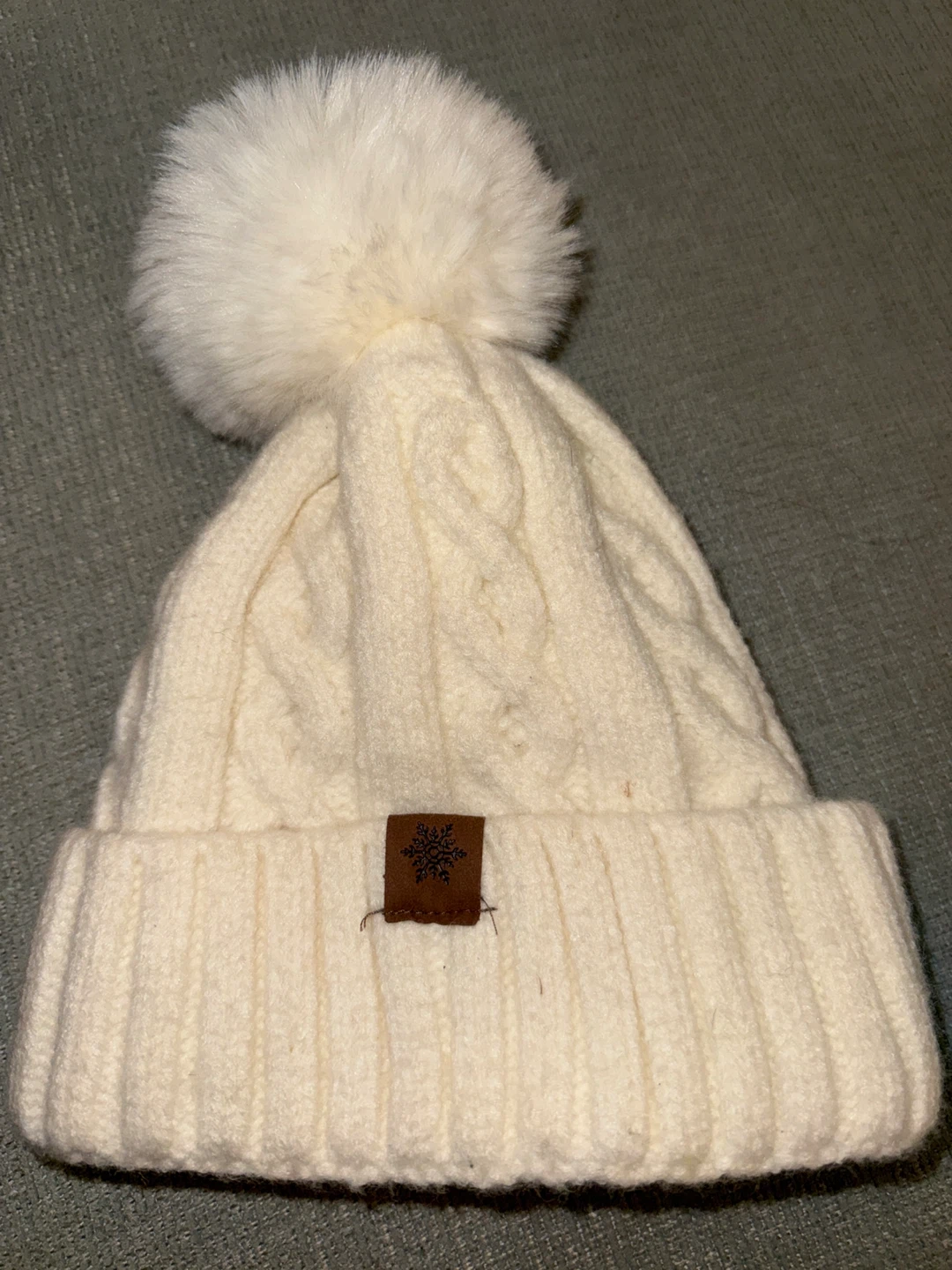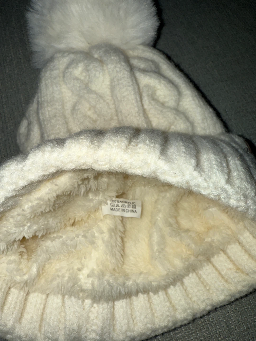 Cozy white cable knit beanie with a soft, fuzzy lining. It's 100% acrylic and features a fluffy pom pom on top. Perfect for keeping warm in cooler weather!π»pick up/ cash only π»