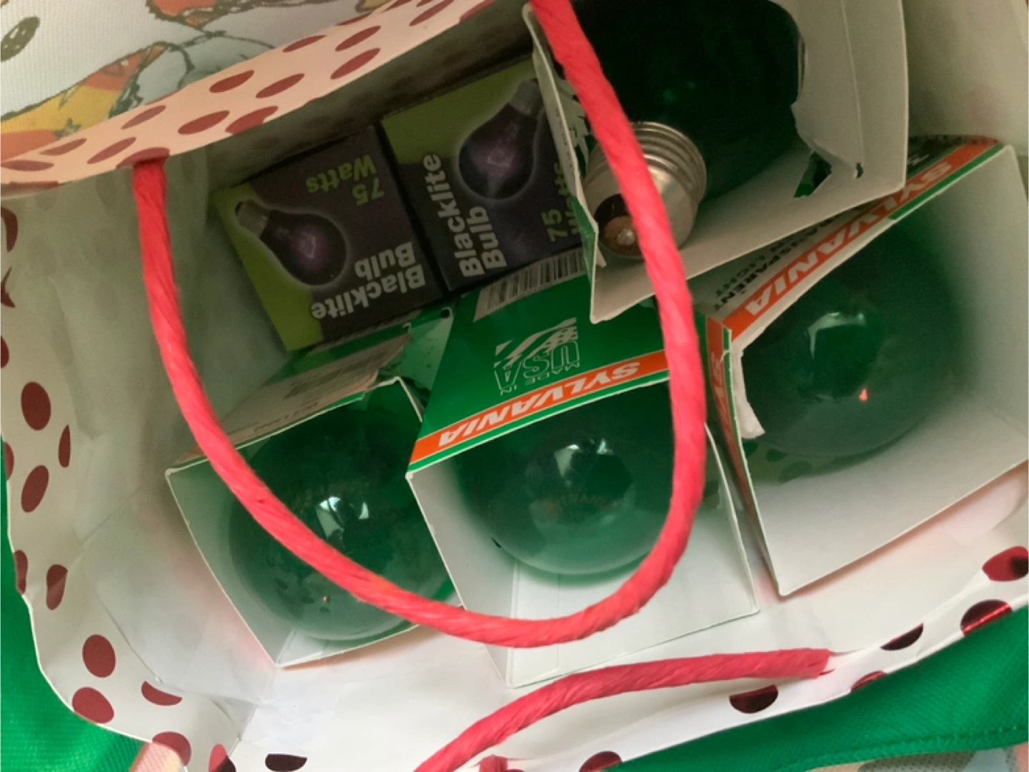 Package of assorted light bulbs. Includes Sylvania green bulbs and Blacklite black bulbs. 75 watts. I think there’s 10 of them. They all work. Perfect time for 4/20