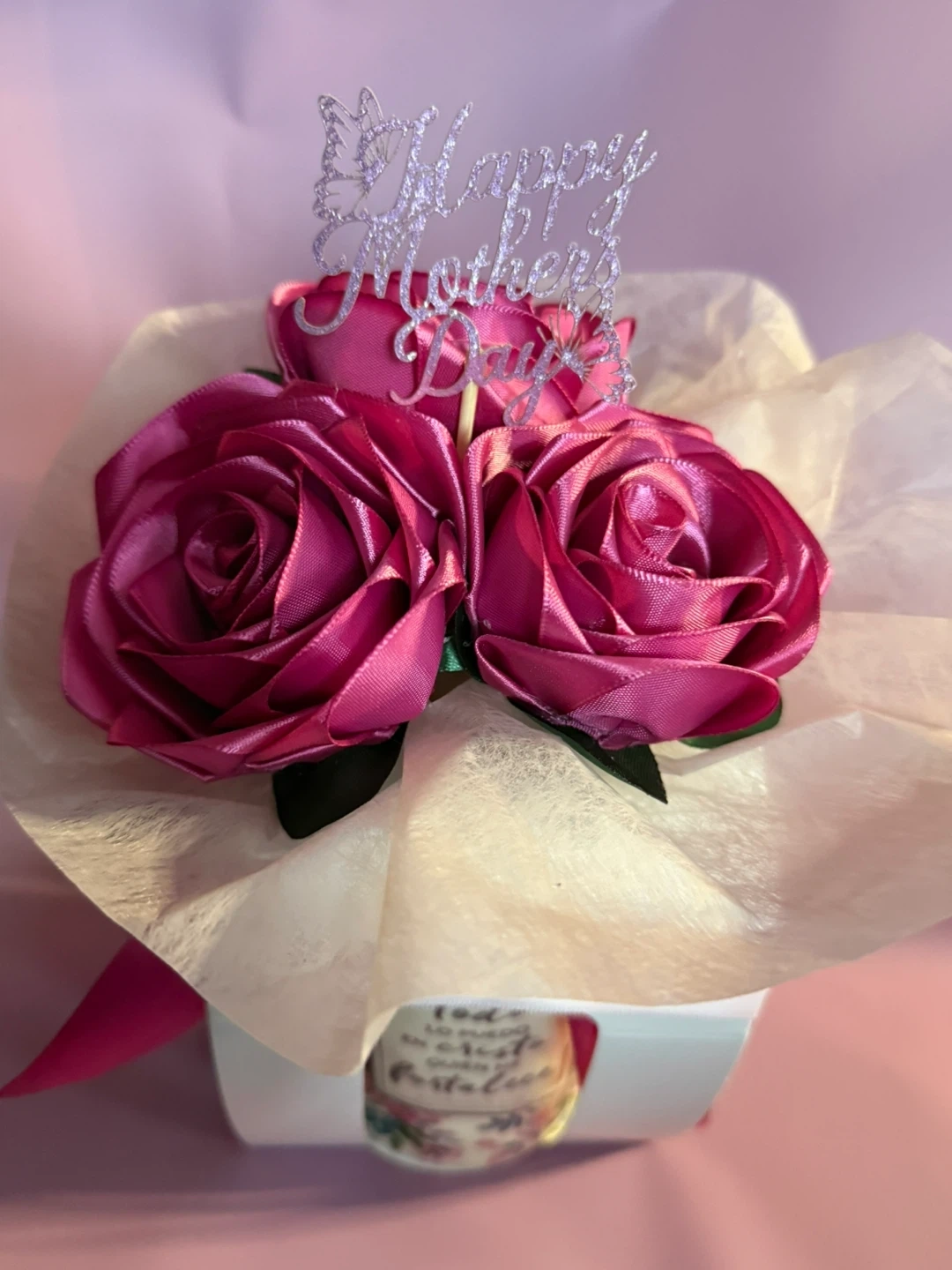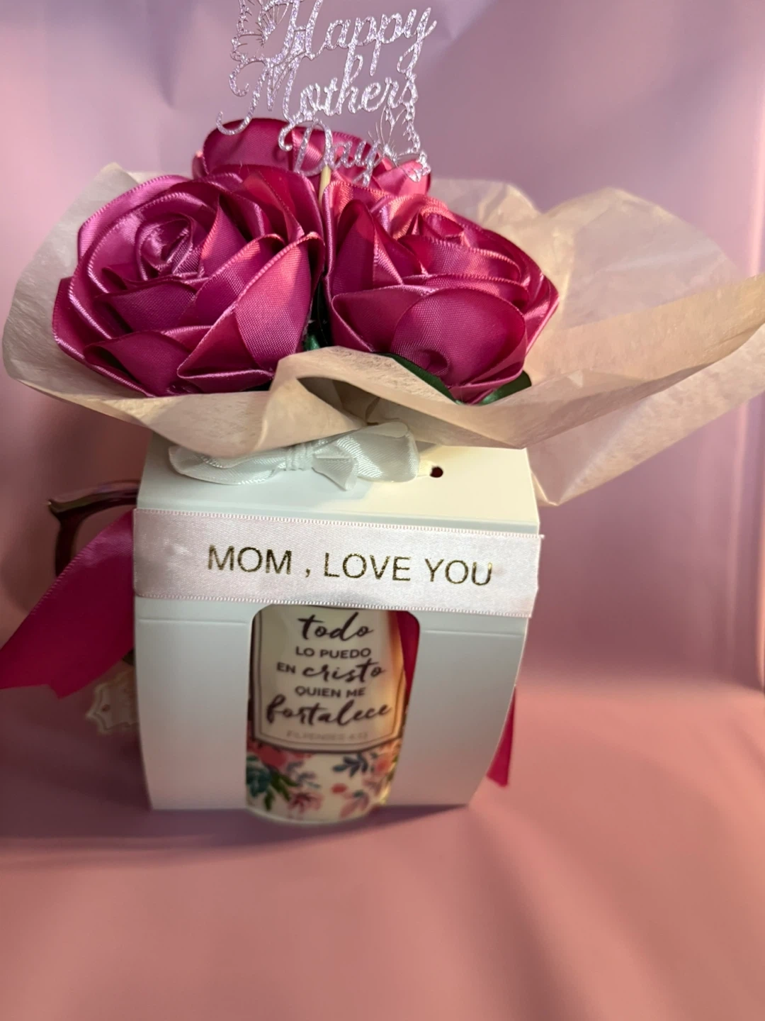 This gift set includes a mug with a floral design and a Spanish religious quote, wrapped with satin ribbon. It's adorned with three satin ribbon roses and a 'Happy Mother's Day' topper. A sweet gift for Mom!