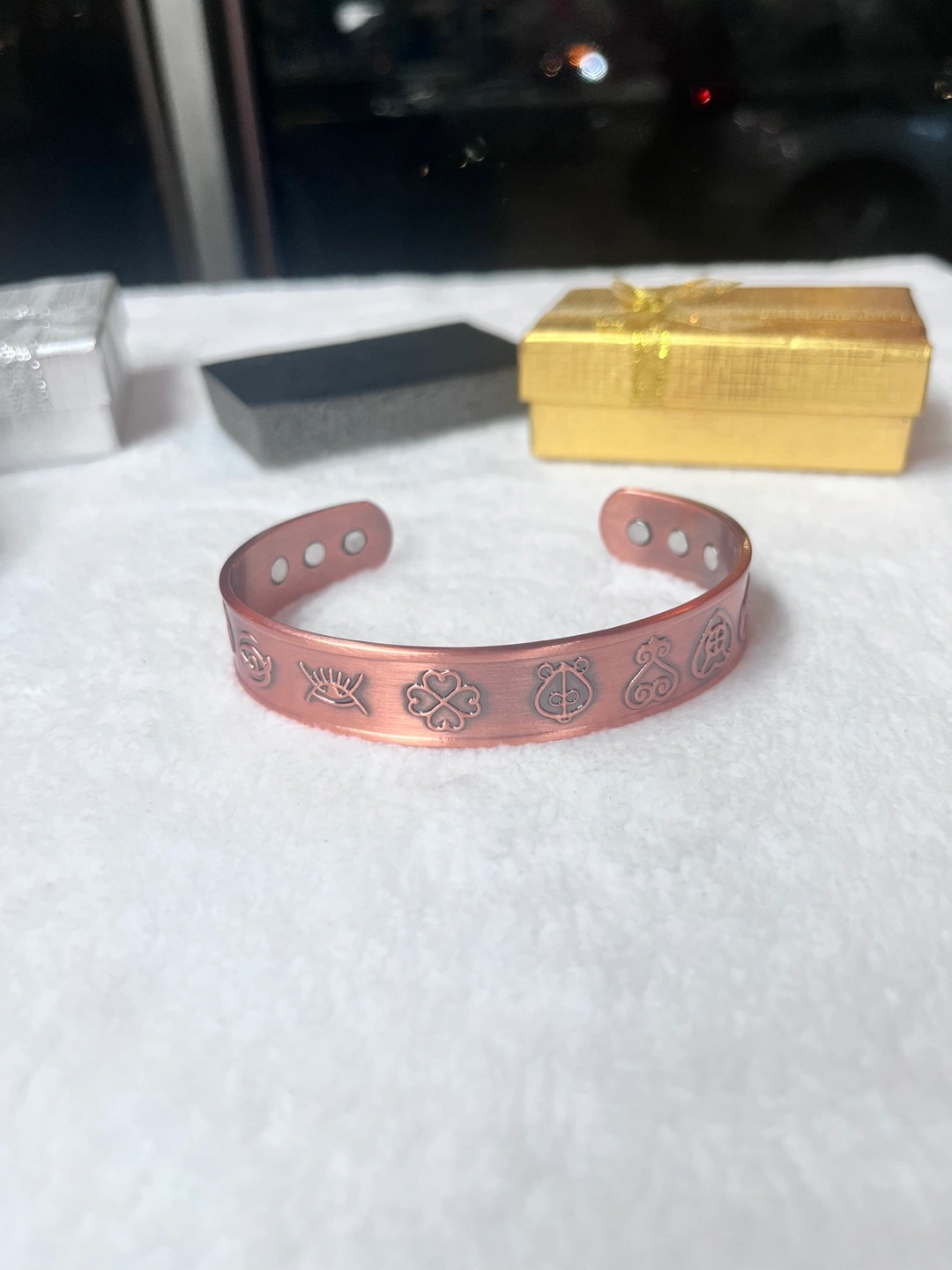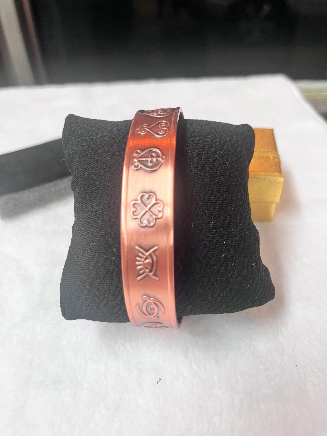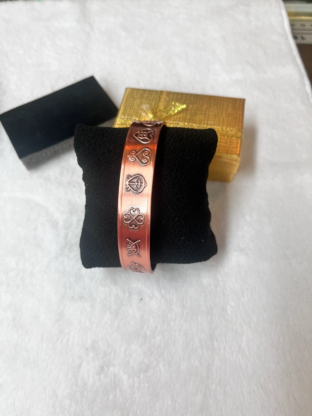 Here's a cool copper Cobre bracelet! It has some neat engraved symbols all around it. It comes with a box. Brasalete de Cobre