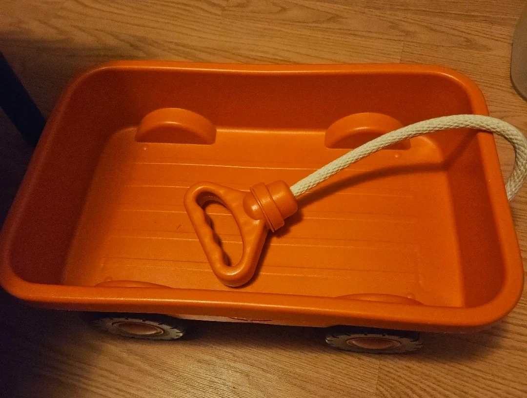 This is small red wagon by GreenToys. Perfect for kids to play with. Is Made in the USA and is 100% recycled plastic.