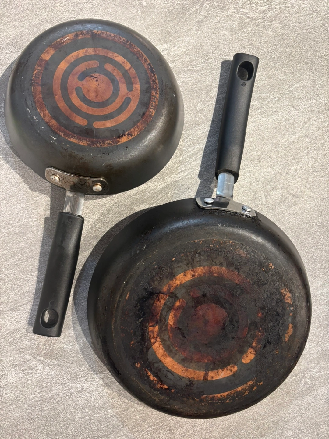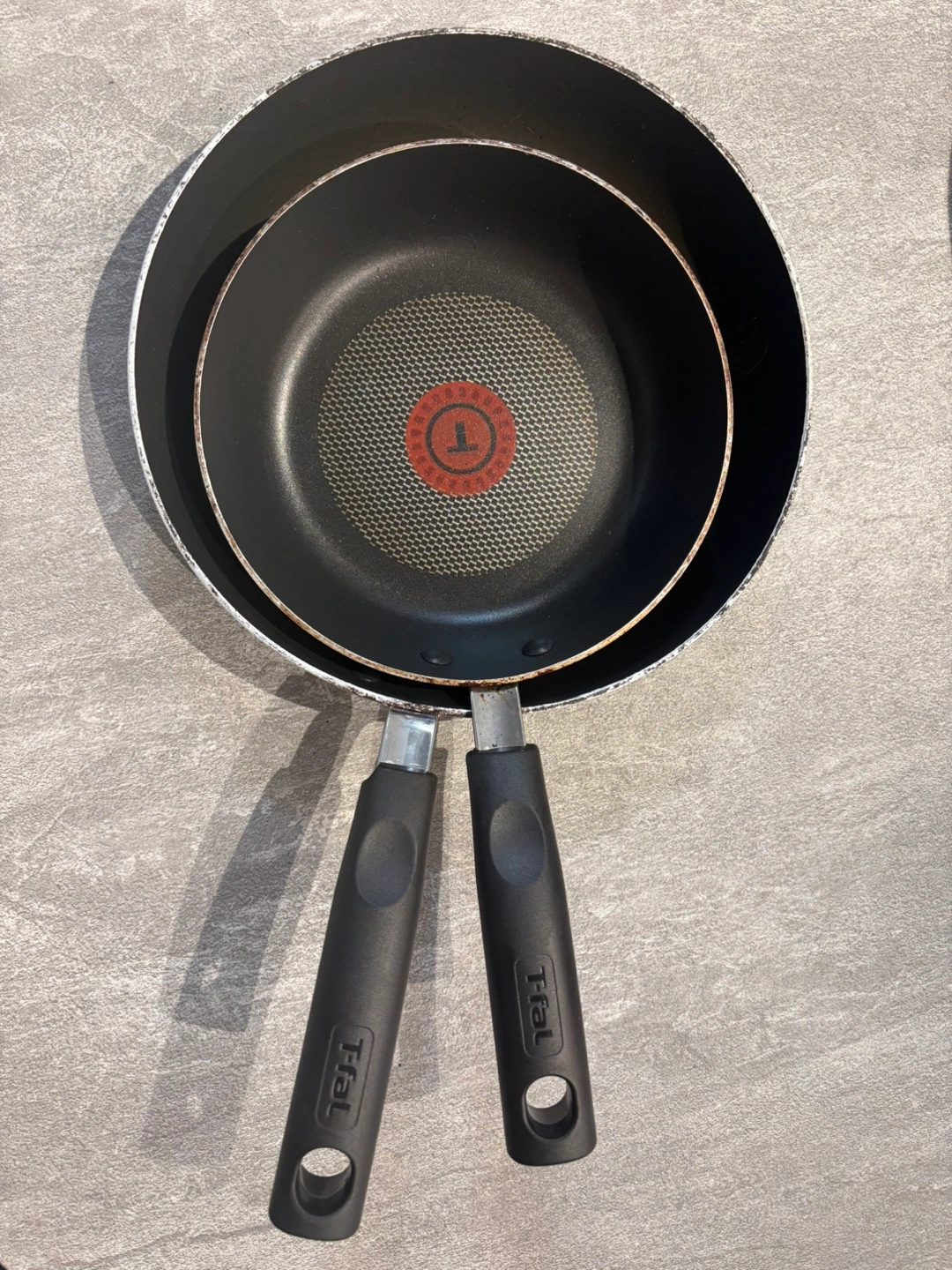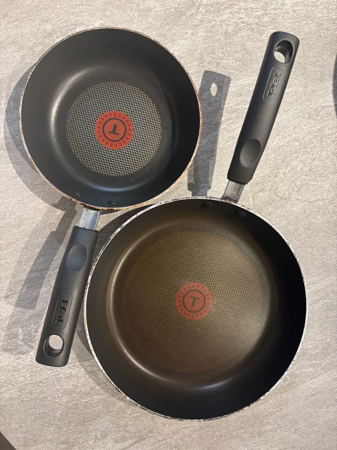 Used T-fal fry pans. Set includes two different sizes. Slight wear and discoloration.