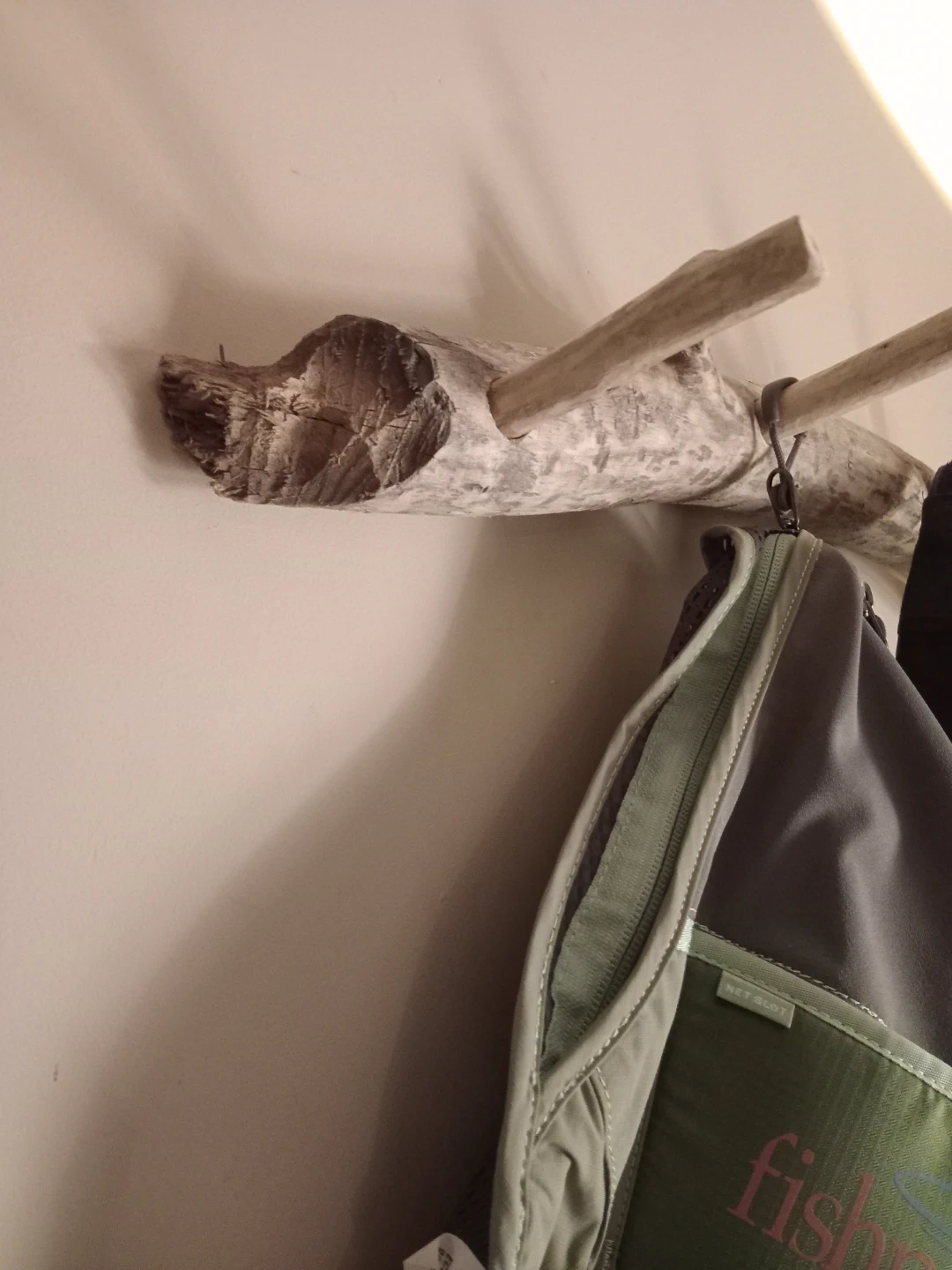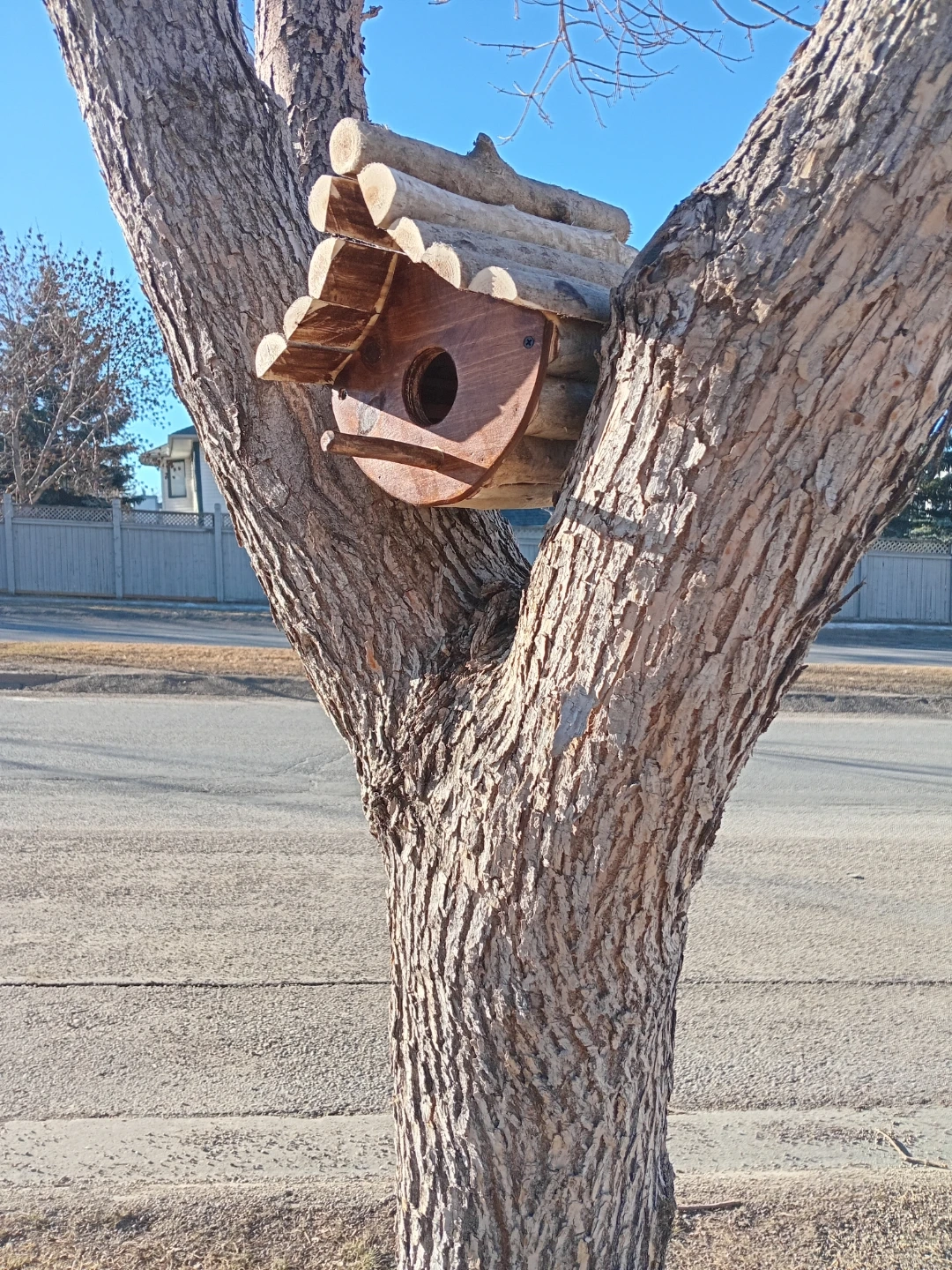 Handmade rustic birdhouse crafted from natural wood logs and branches. It's designed to provide a cozy shelter for birds in your backyard.