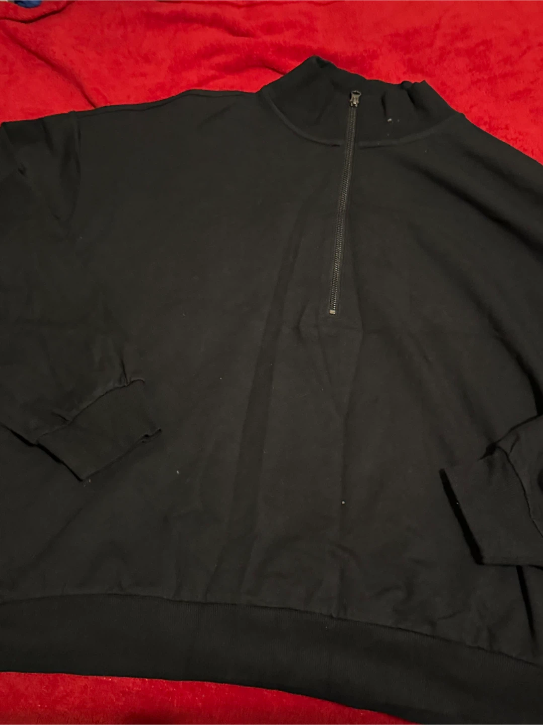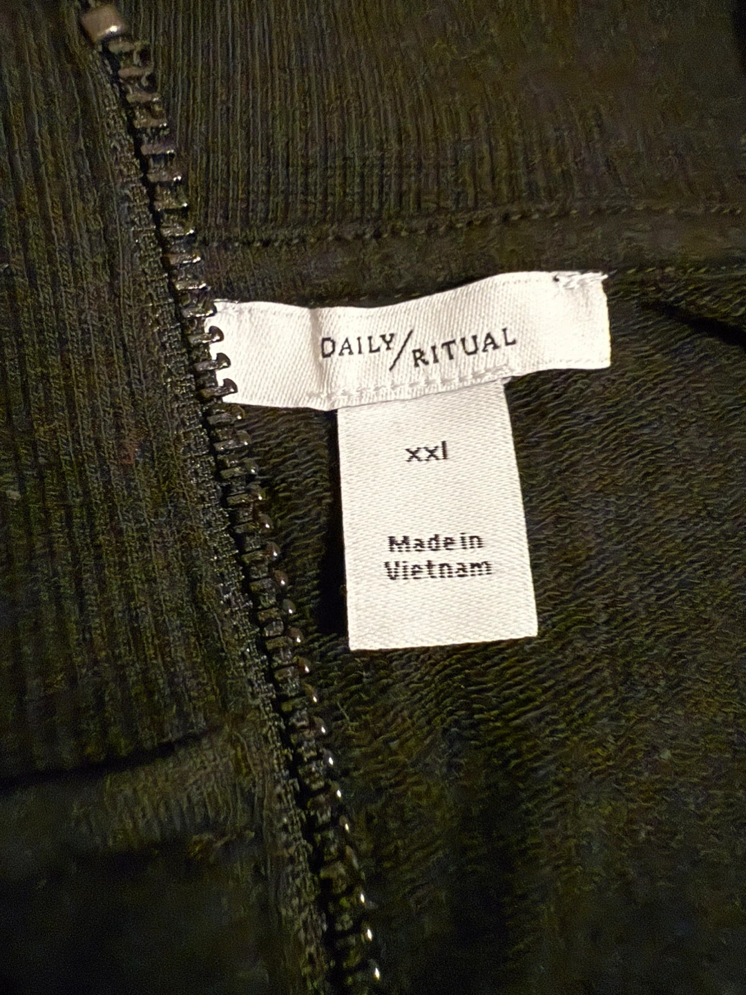 I'm selling a Daily Ritual pullover in size XXL. It's a great basic piece for layering or wearing on its own. The color is black, and it has a zipper at the neck. Made in Vietnam!