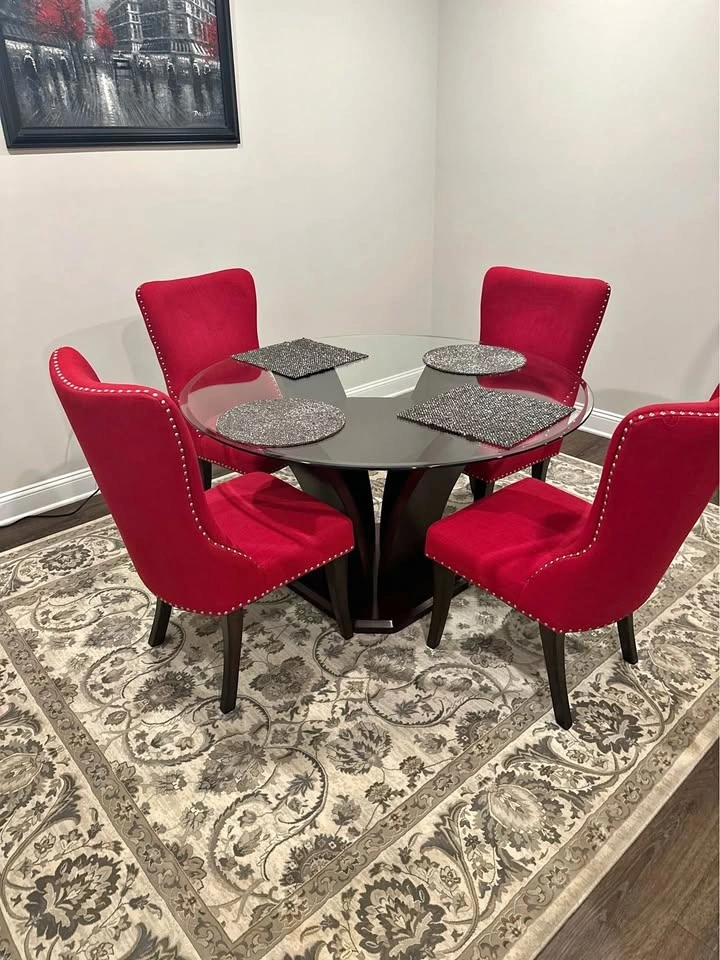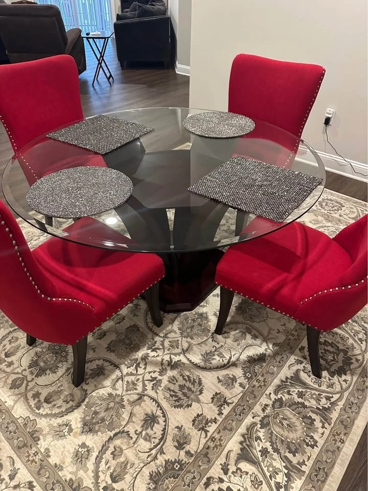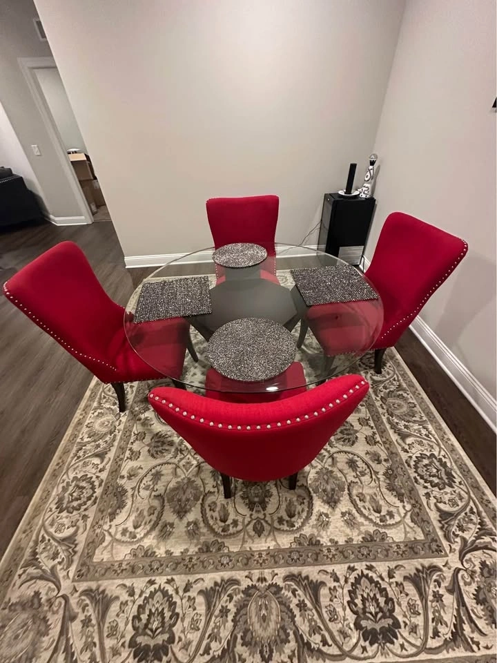 Dining room set with 4 upgraded designer chairs. 54 inch glass table top with wooden base. Easily fits four people. Set is in excellent condition. Priced to sell.