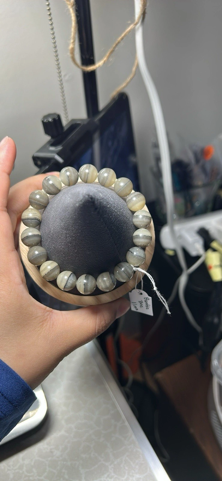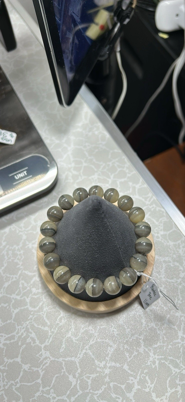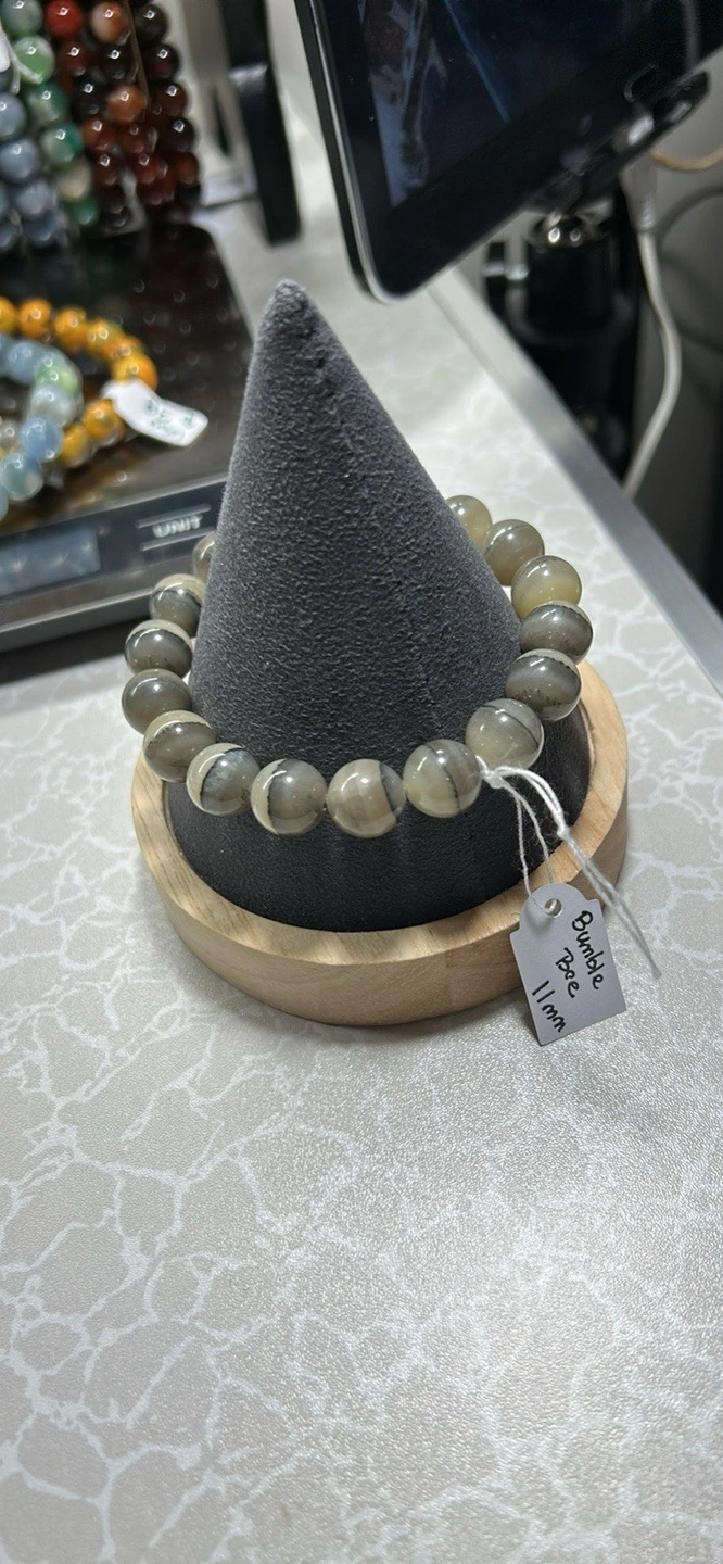 New with tags. This is a lovely stretch bracelet featuring round gray and white gemstone beads, with a bumble bee accent. The beads are approximately 11mm.