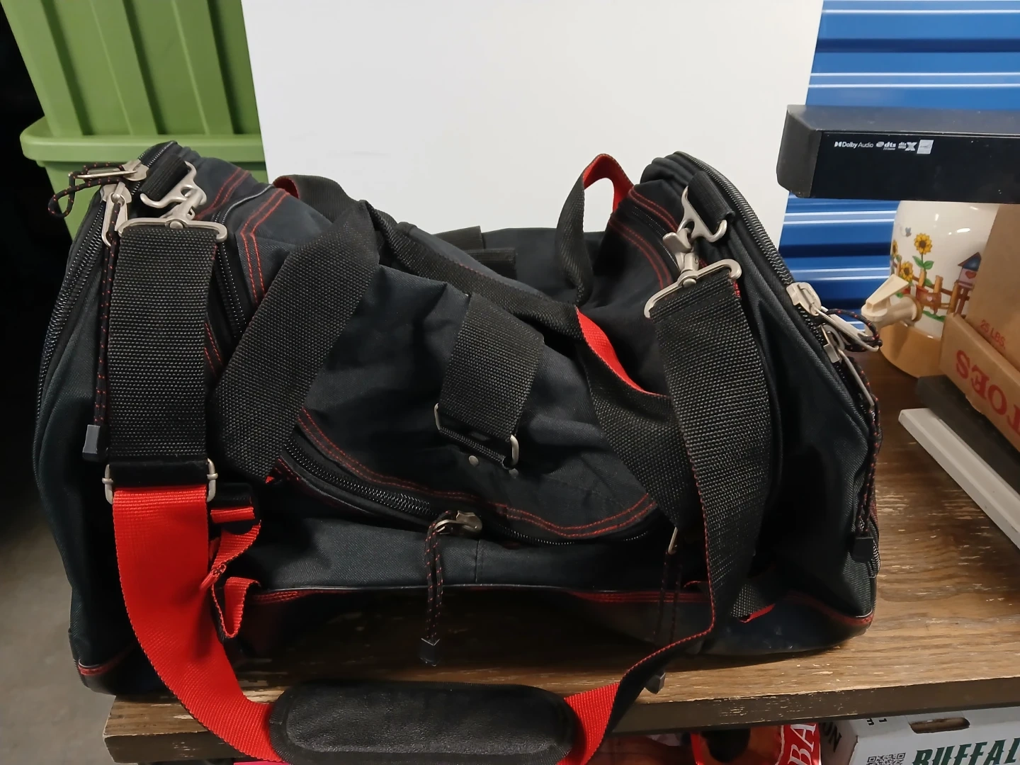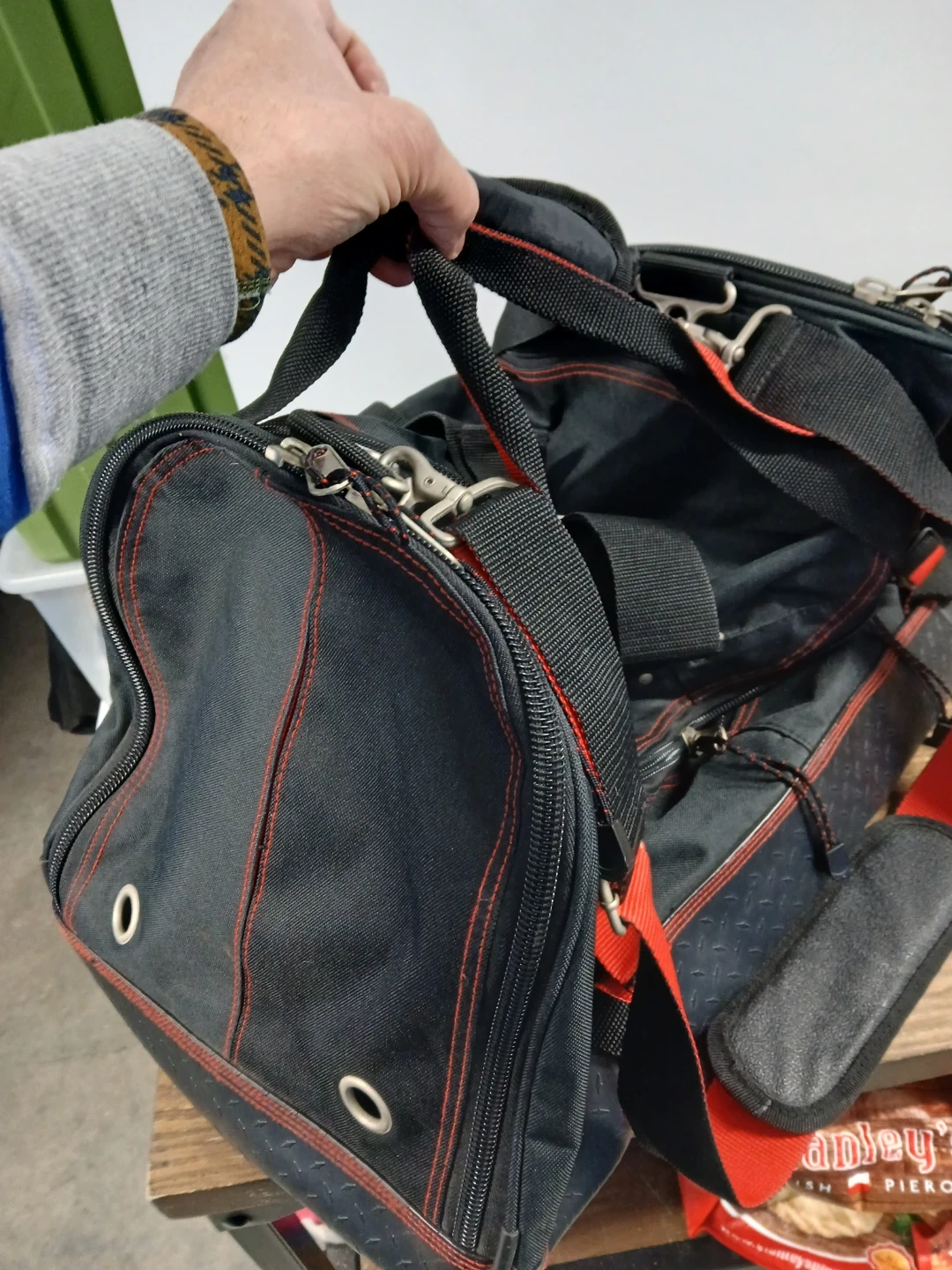 This is a black duffel bag with red stitching and accents. It has multiple zippered compartments and adjustable straps for carrying. The bag appears to be made of durable fabric.