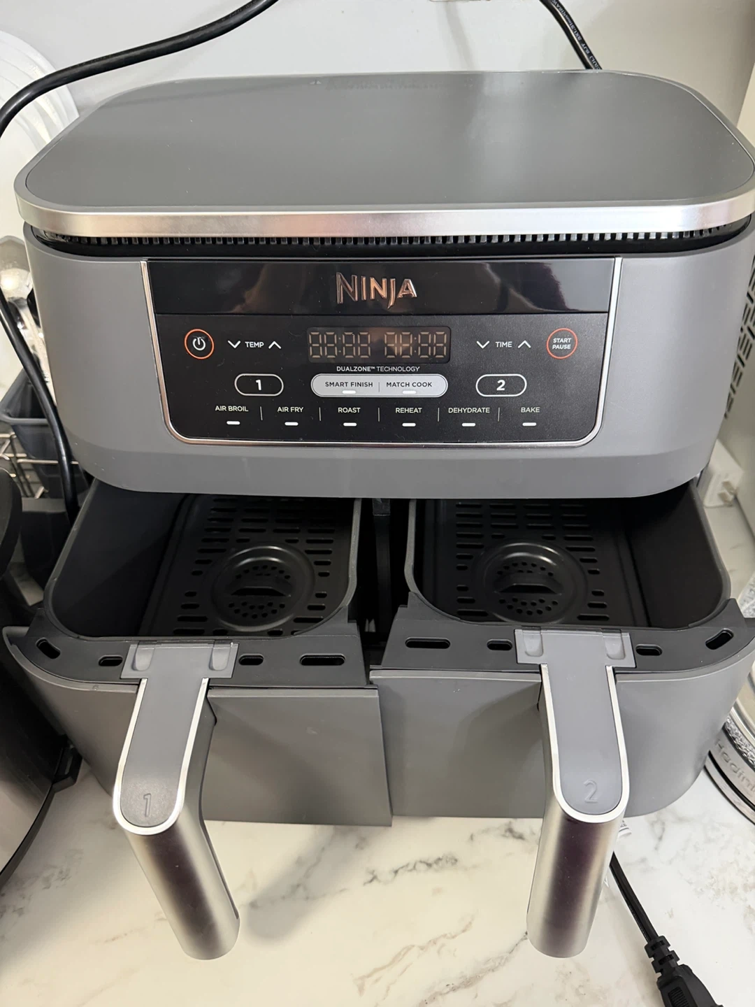 This Ninja DualZone air fryer features two independent baskets for cooking different foods simultaneously. It has multiple cooking functions including Air Fry, Roast, Reheat, and Bake. Perfect for busy households looking to cook meals quickly and efficiently!