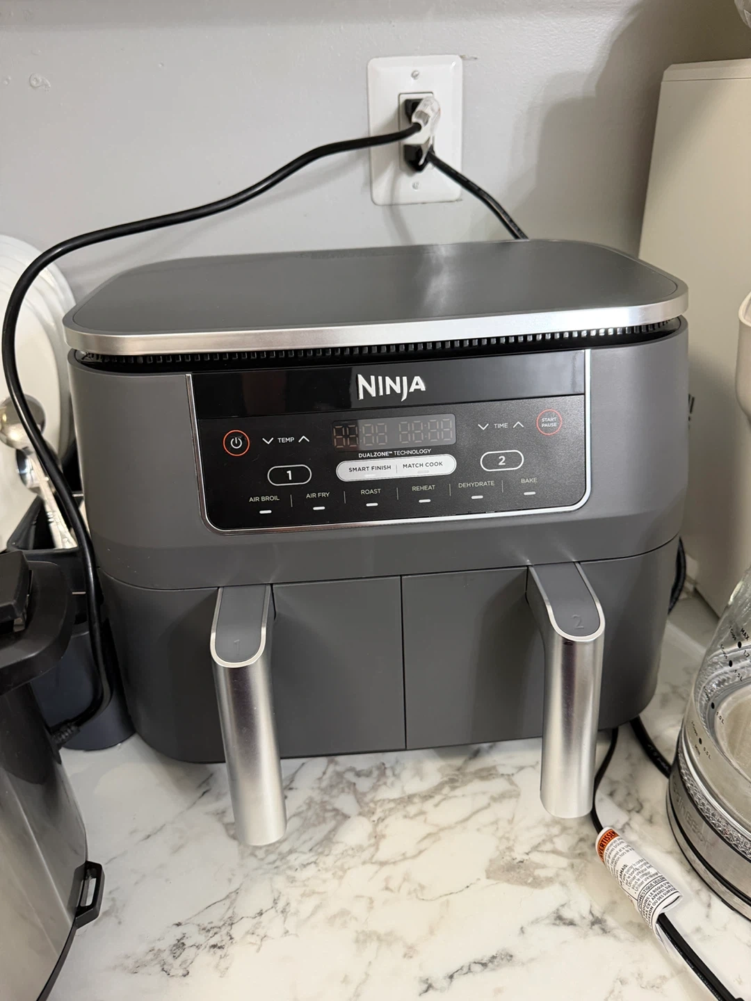 This Ninja DualZone air fryer features two independent baskets for cooking different foods simultaneously. It has multiple cooking functions including Air Fry, Roast, Reheat, and Bake. Perfect for busy households looking to cook meals quickly and efficiently!