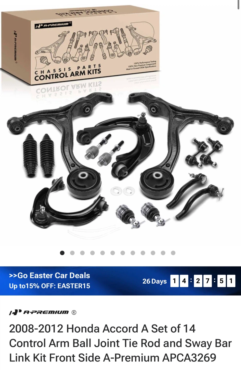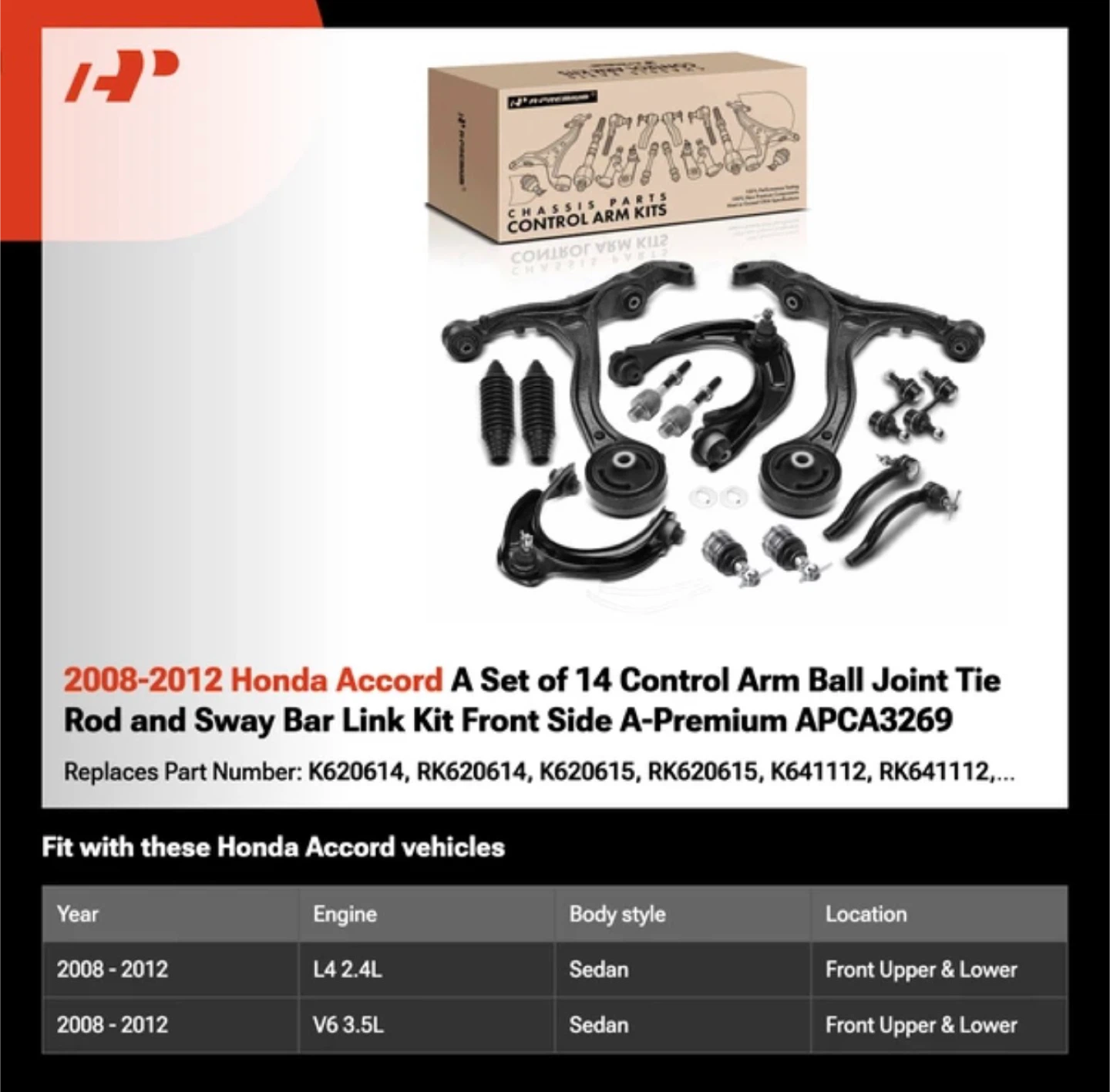 This A-Premium kit includes 14 pieces for the front side of your 2008-2012 Honda Accord. It contains control arms, ball joints, tie rods, and sway bar links. These parts are designed for L4 2.4L and V6 3.5L sedan models.