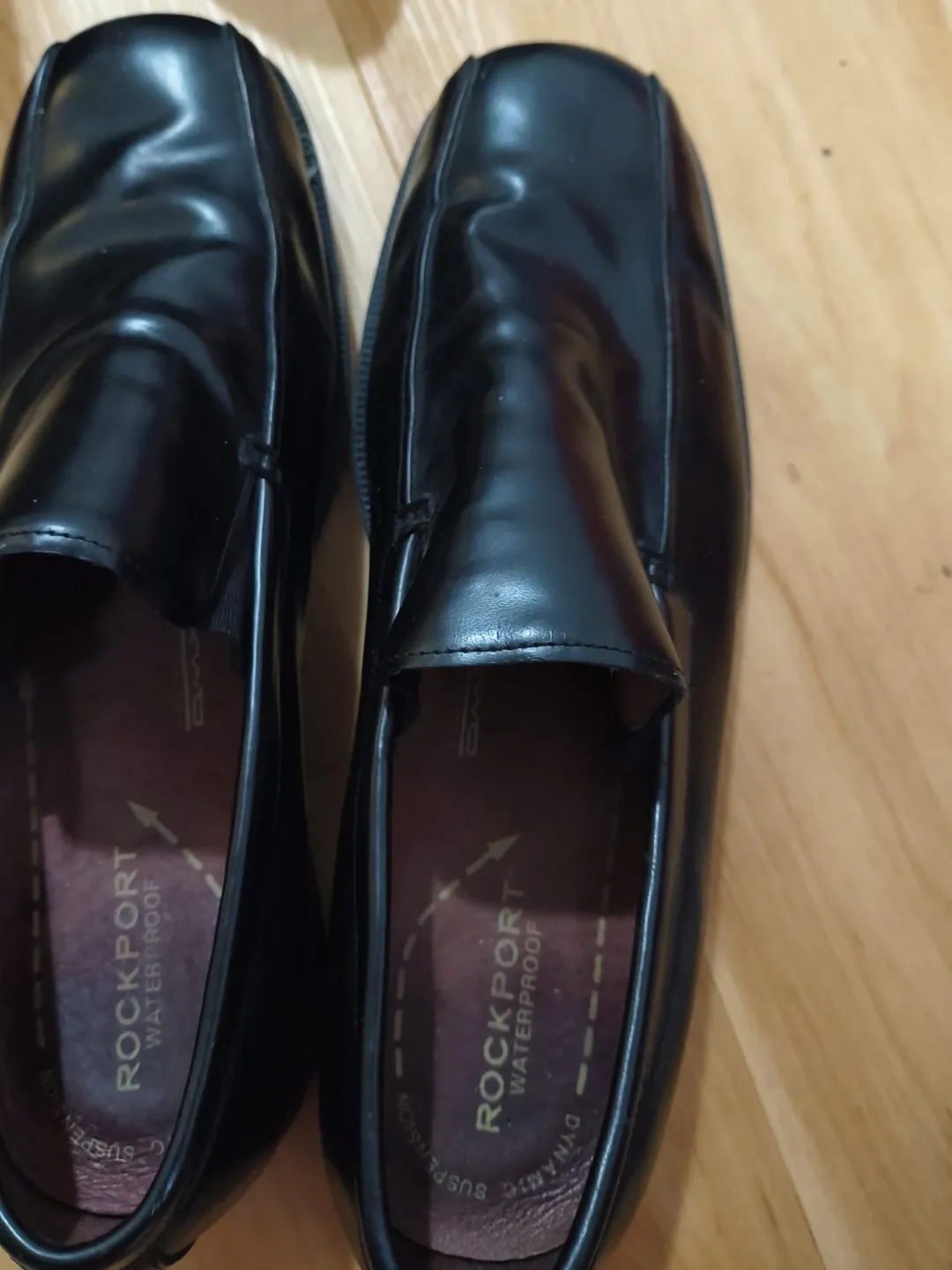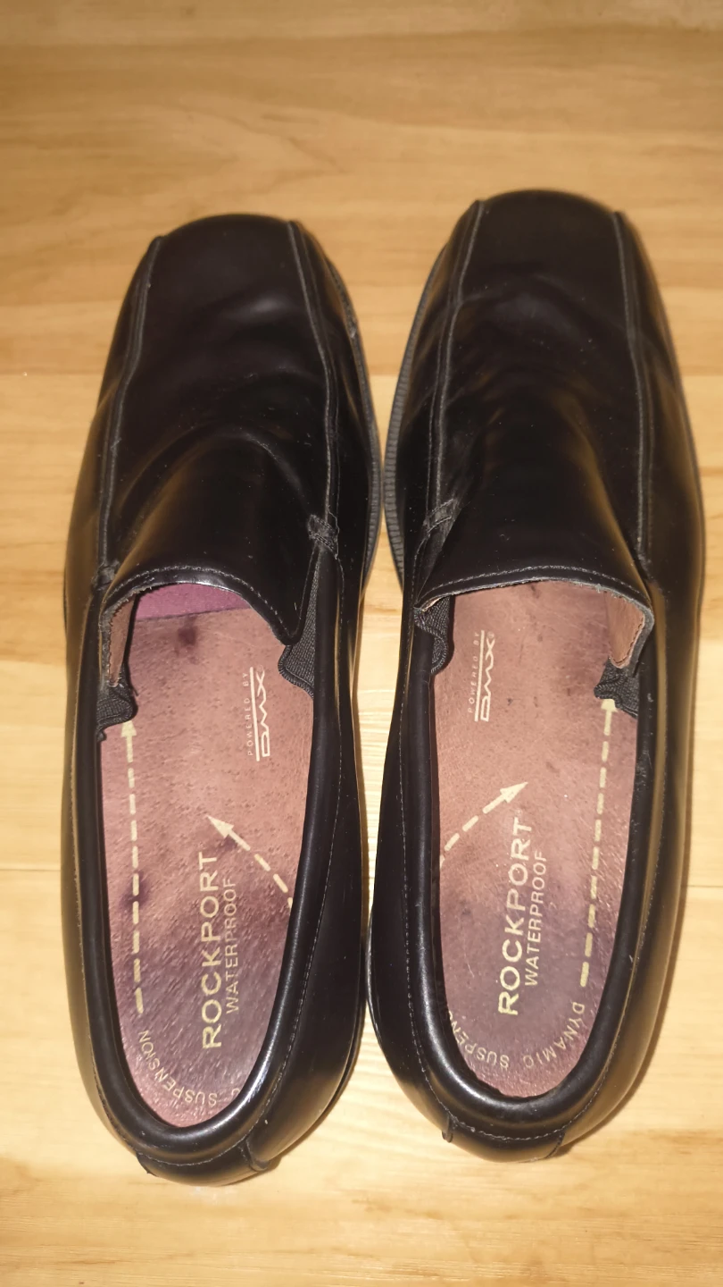 These are black Rockport loafers with waterproof technology. They feature dynamic suspension for comfort. These shoes are great for everyday wear or business casual occasions!
