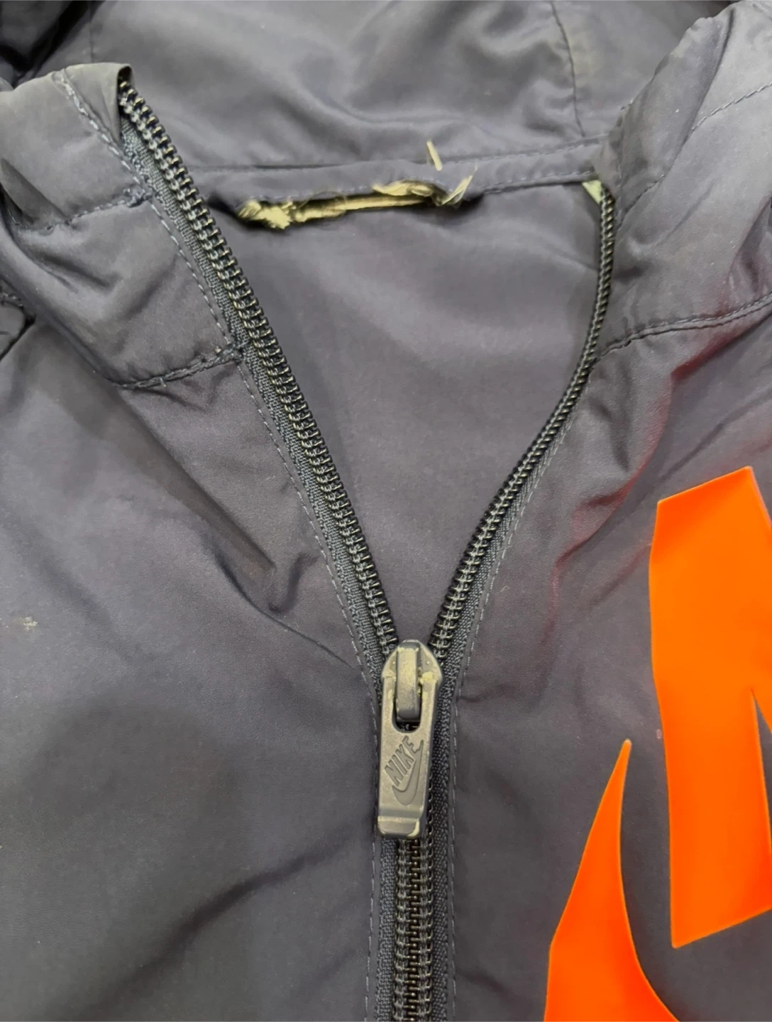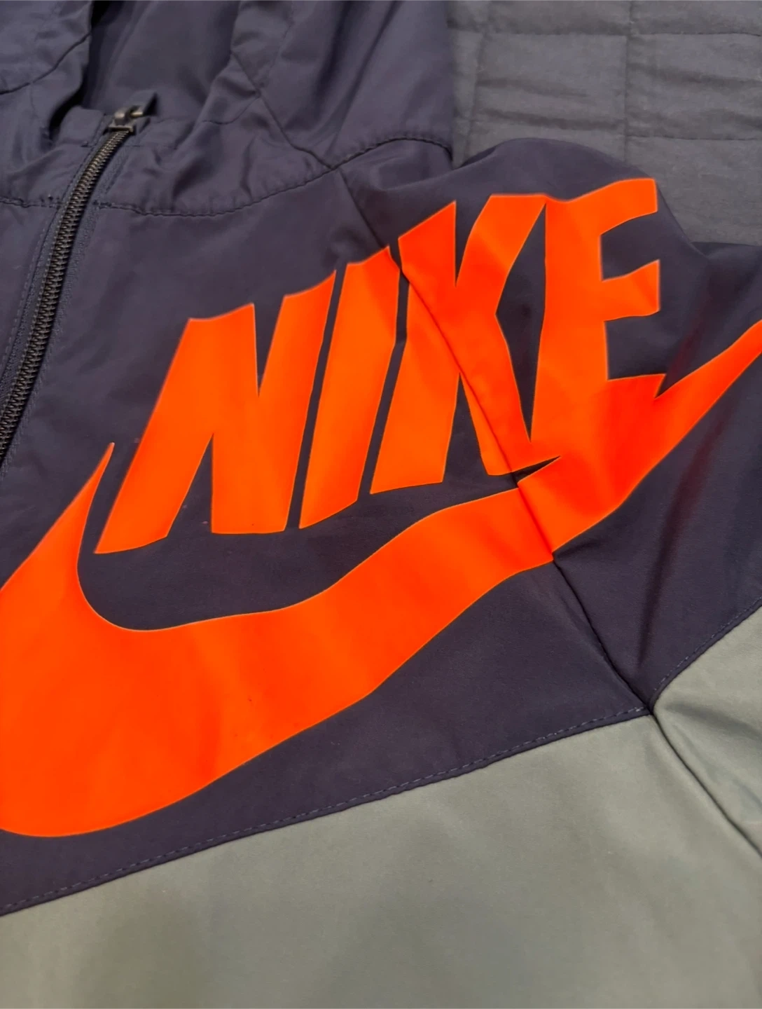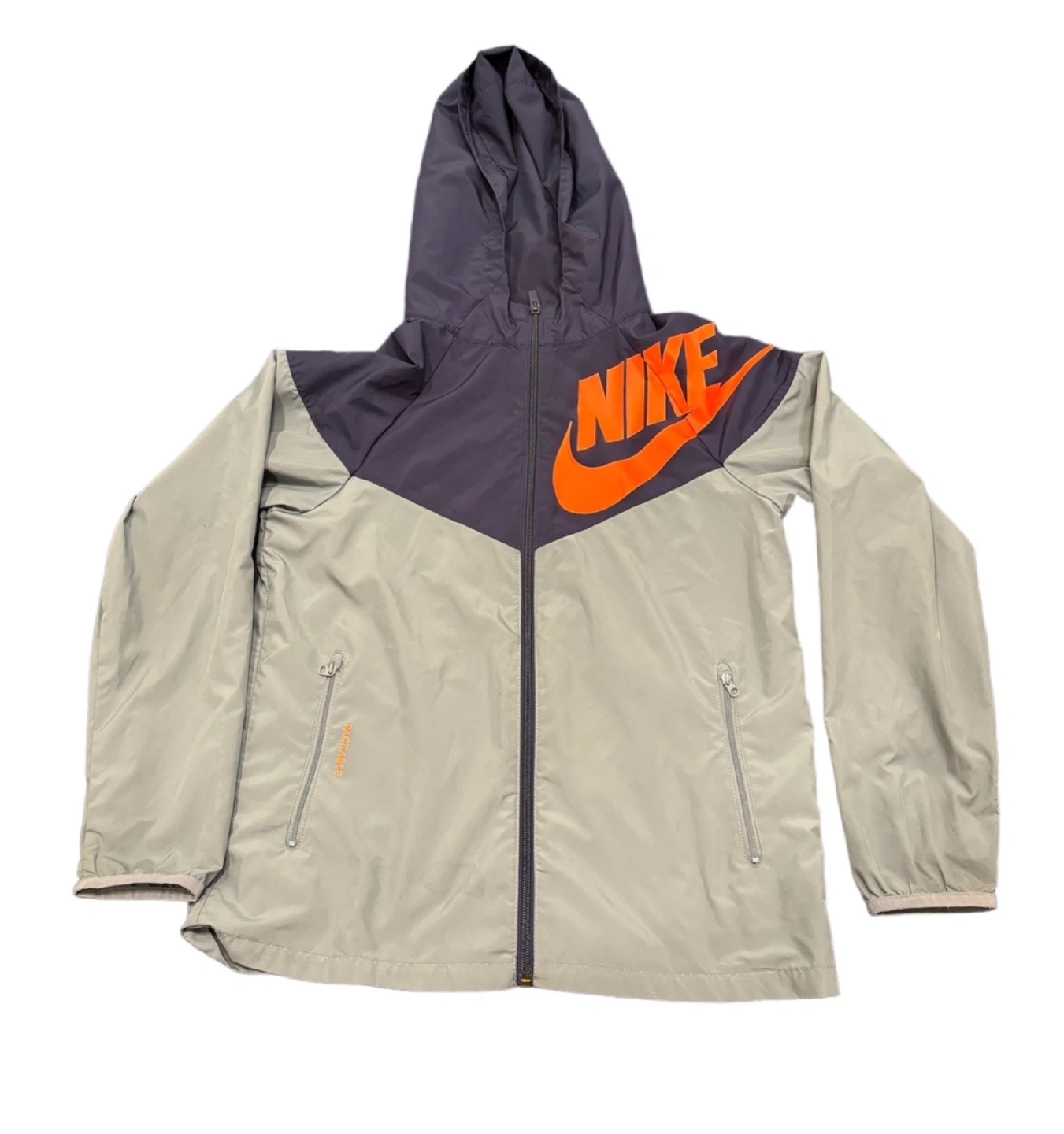 This is a Nike windbreaker jacket. It's lightweight and features a full zip closure. The jacket has a hood and two zip pockets on the front. Great for outdoor activities! Size 8/10 kids.