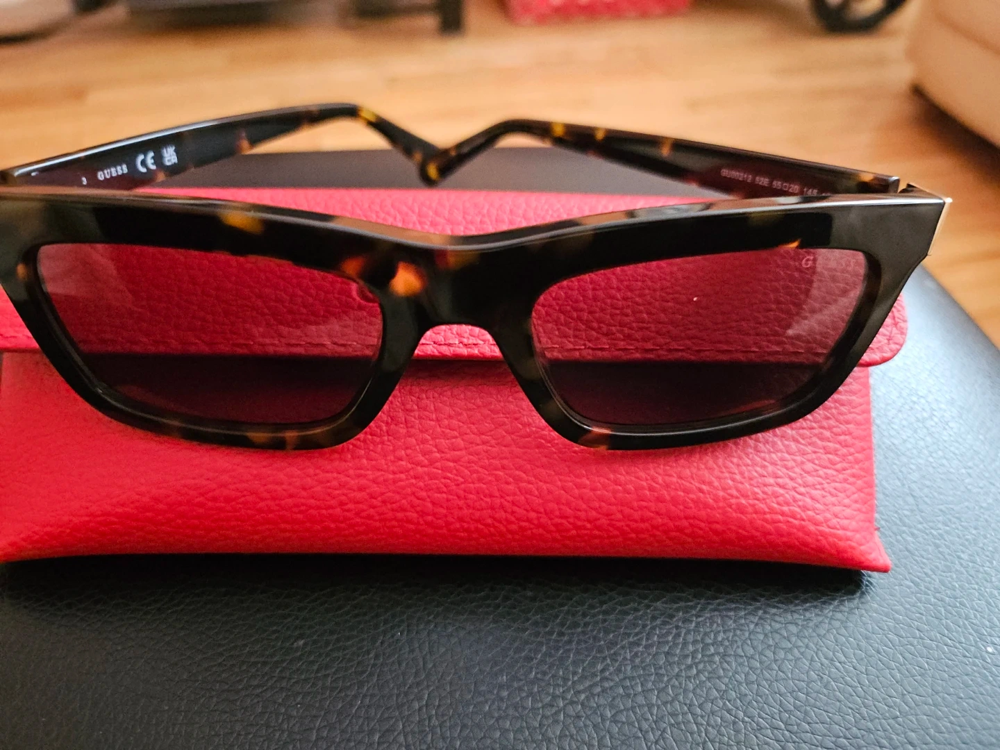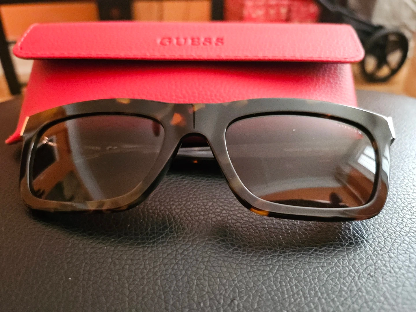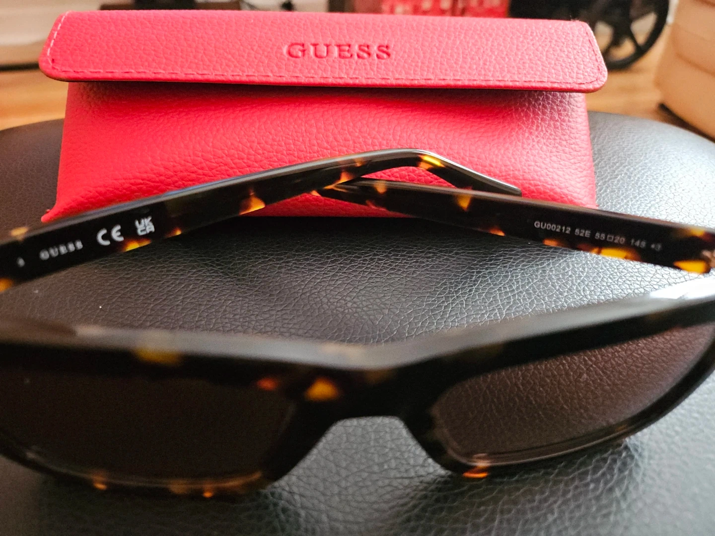 GUESS tortoiseshell sunglasses with a red case. Model GU00212. Features "CE" and "UKCA" markings. The lenses are a dark brown tint. Frame size 52D20 145.