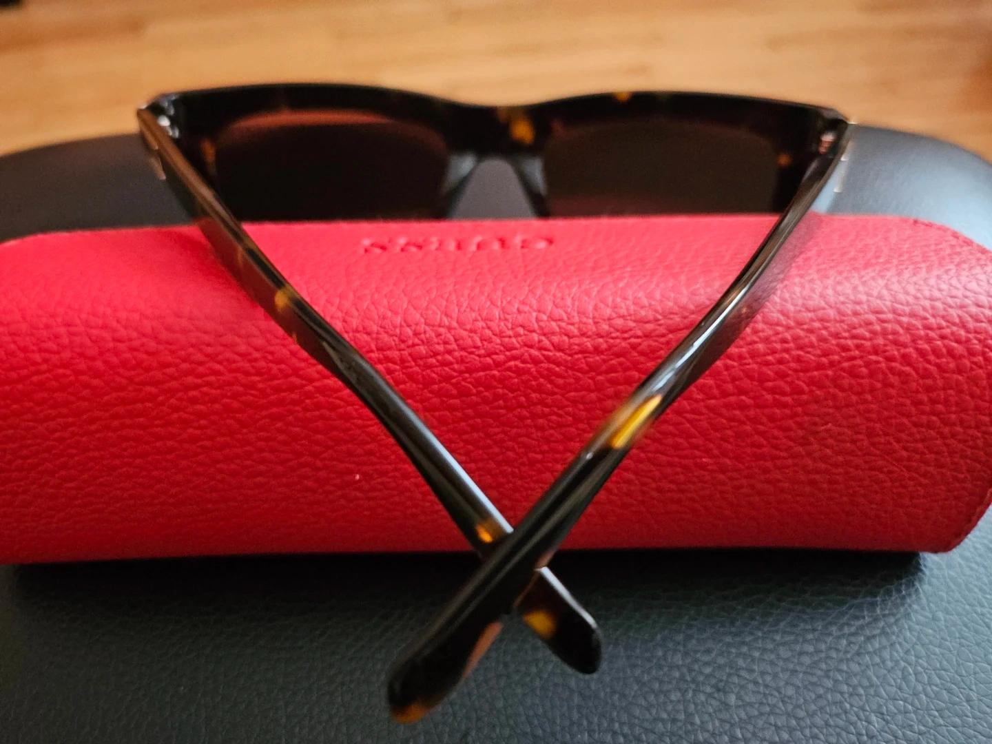 GUESS tortoiseshell sunglasses with a red case. Model GU00212. Features "CE" and "UKCA" markings. The lenses are a dark brown tint. Frame size 52D20 145.