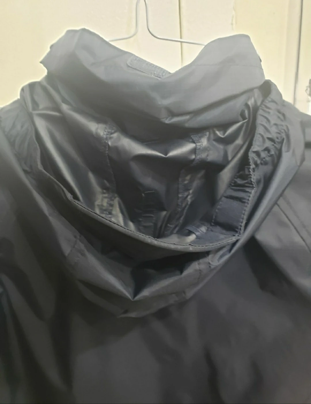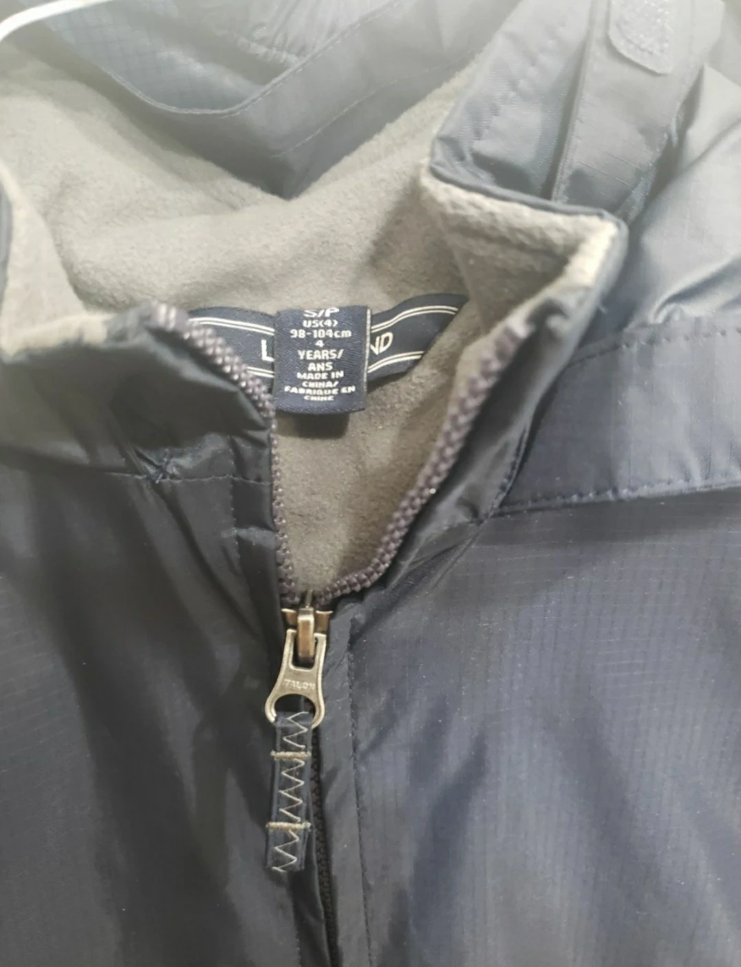 This Lands' End hooded jacket is navy blue. It's a size 4, S/P, fitting heights 98-104cm. The jacket has a zipper closure and a soft fleece lining for warmth.