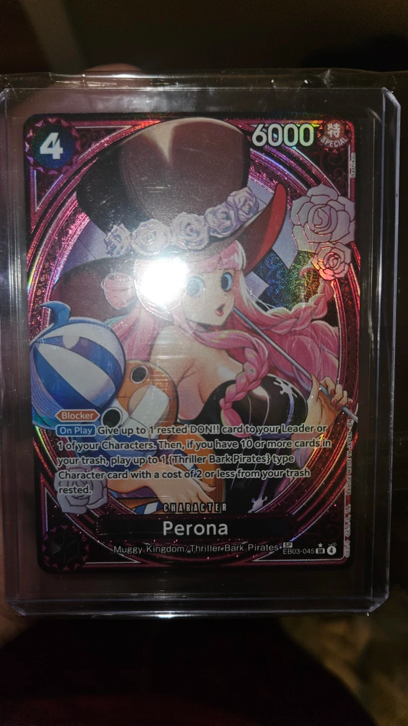This is a Perona character card from the One Piece Card Game, specifically the EB03-045 SR edition. It has a Blocker ability and grants On Play effects. The card features a Power of 6000. Pulled from pack put straight into sleeve and top loader.